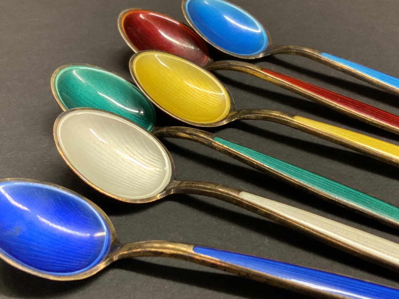 Set of six (6) David Andersen silver enameled spoons.