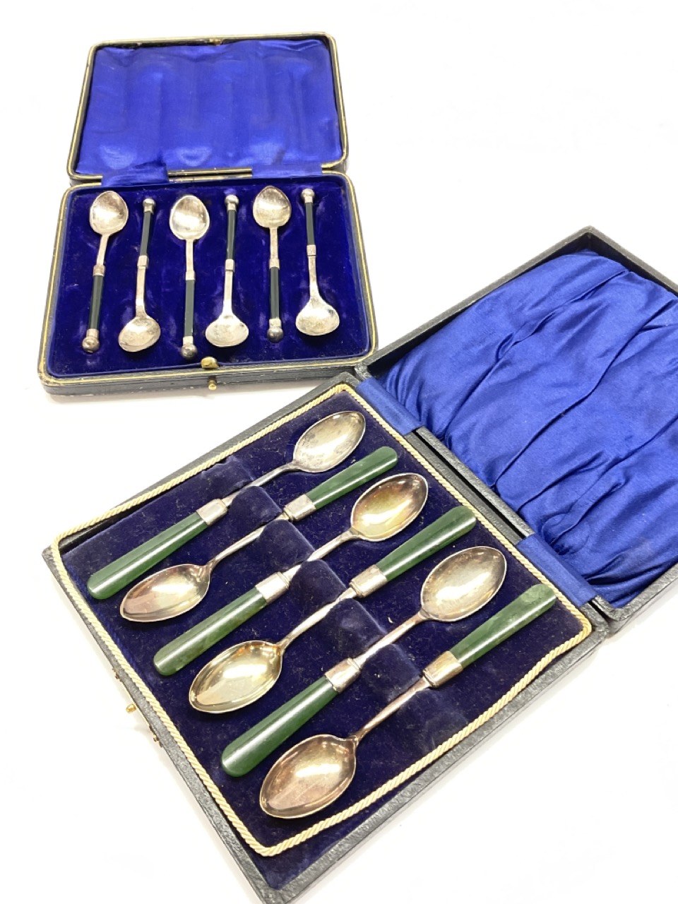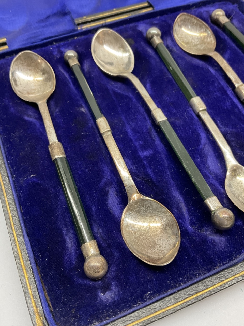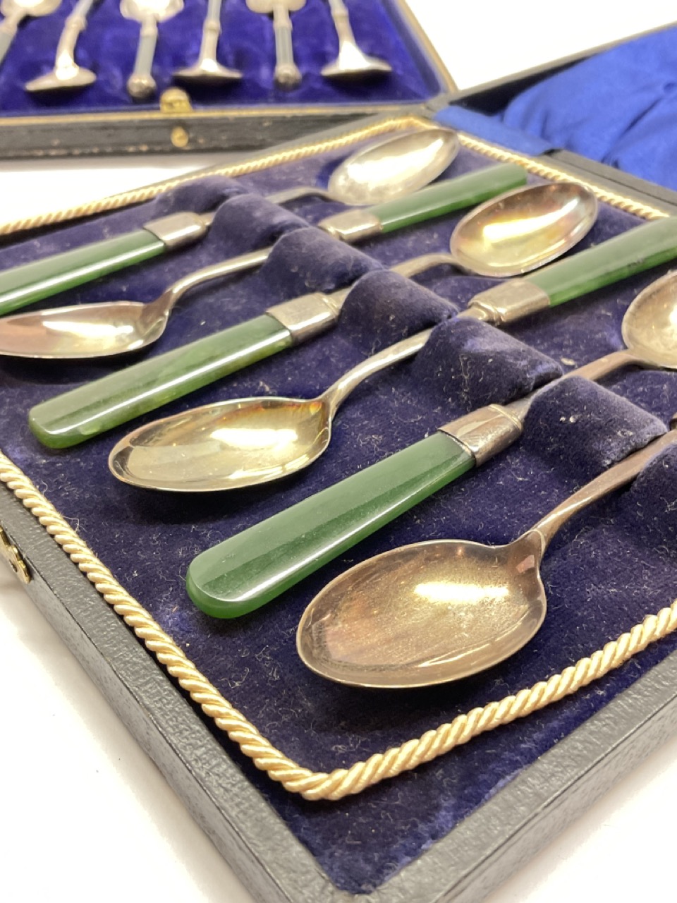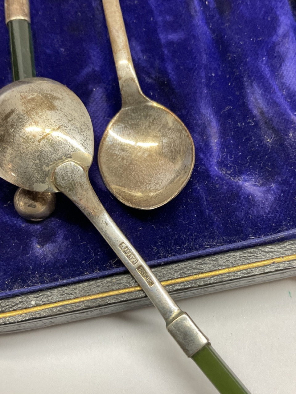 Signed Smith sterling silver and jade demitasse spoons. Two sets of six.