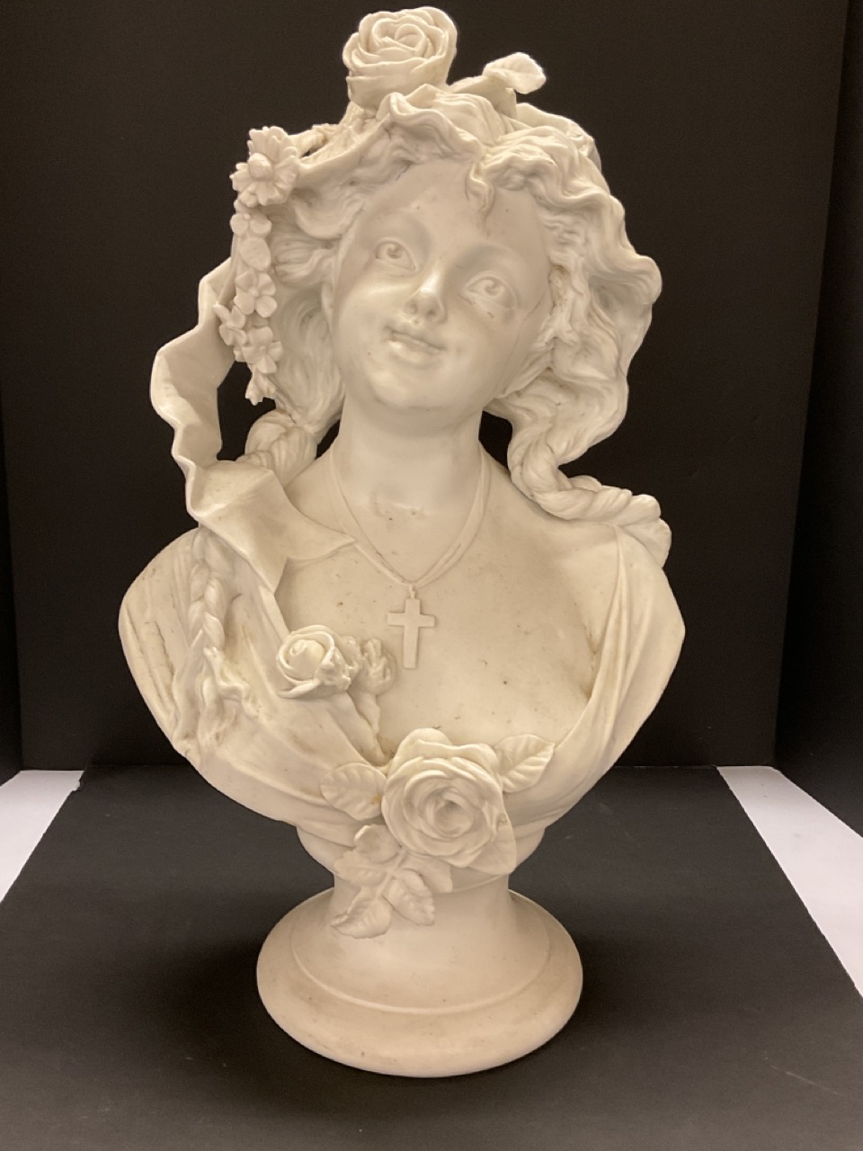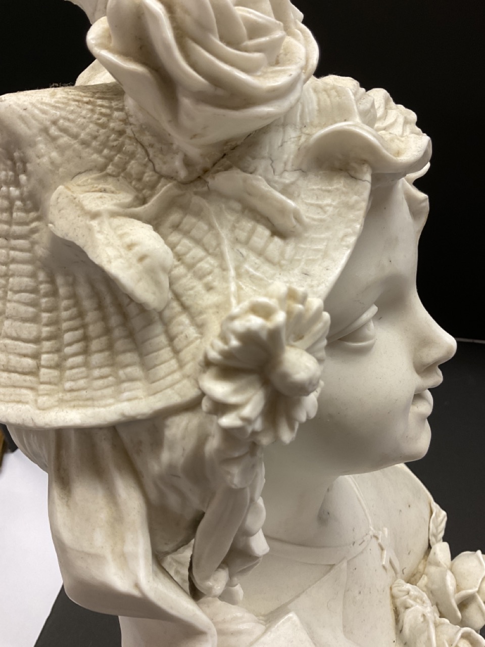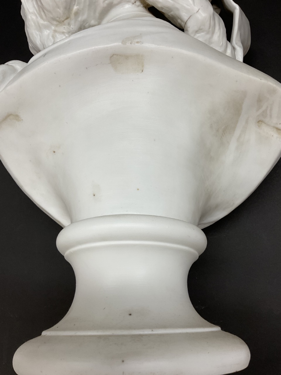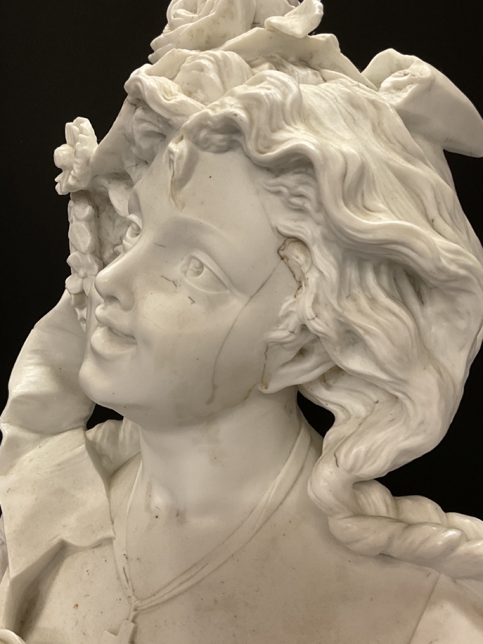 Figural porcelain bust of a lady. Late 19th century. Cracks, soiling and hairlines noted. Please see photograph preview.