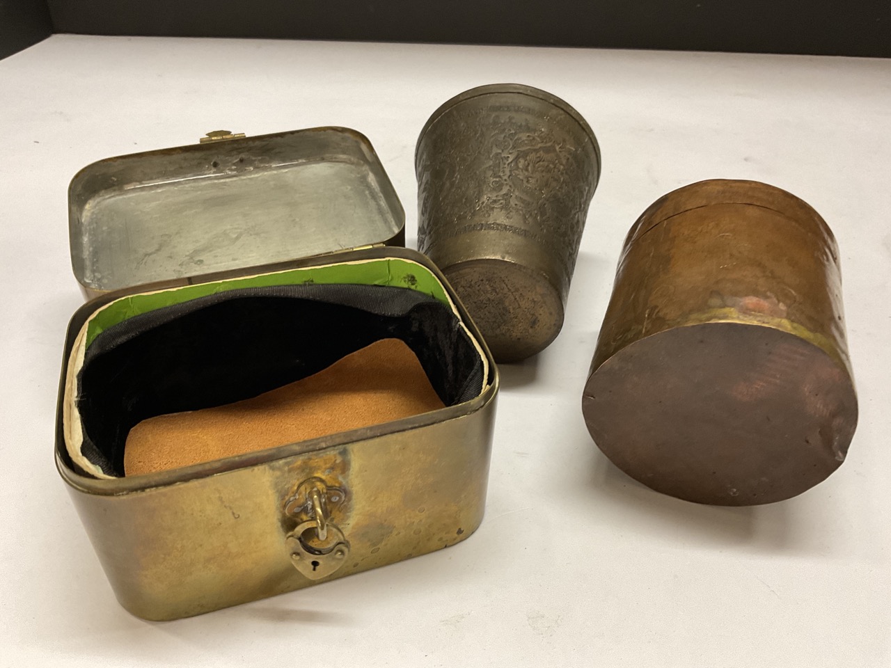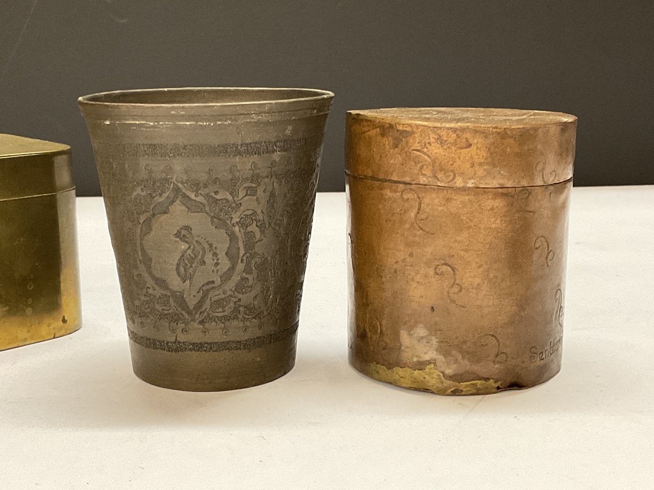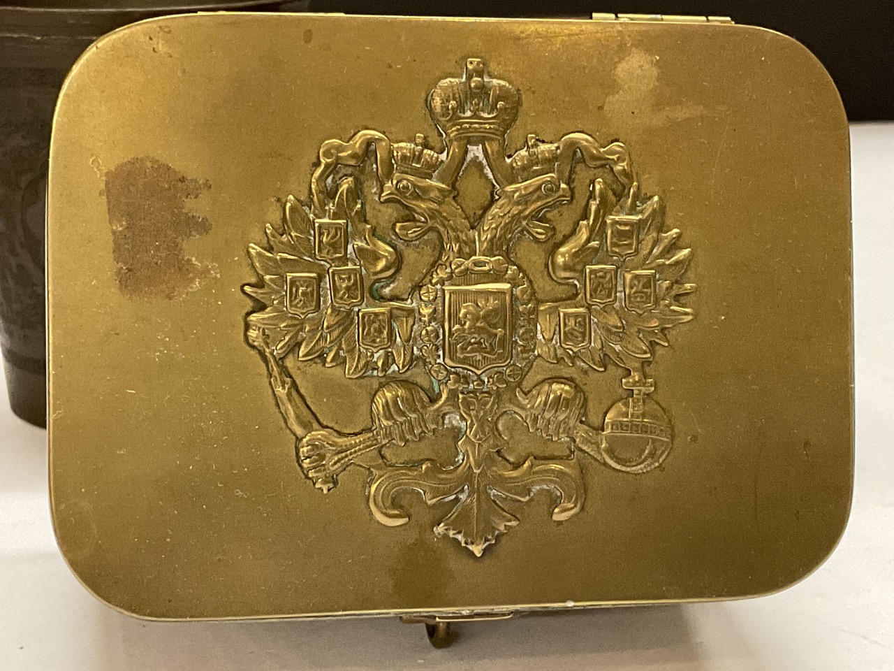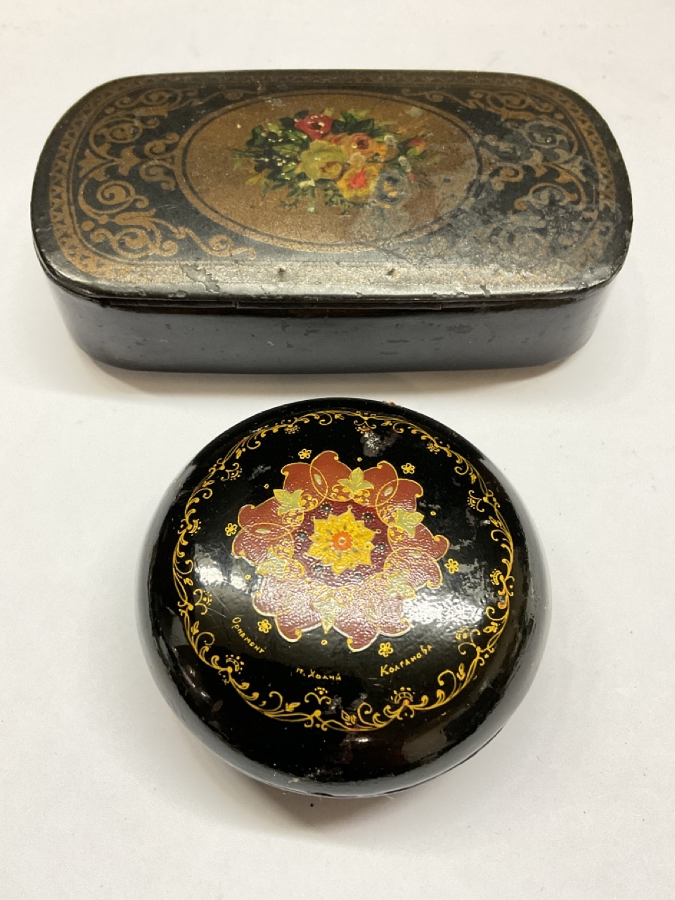 Compiled estate Russian objects. As seen in photograph preview. Brass and lacquered boxes.