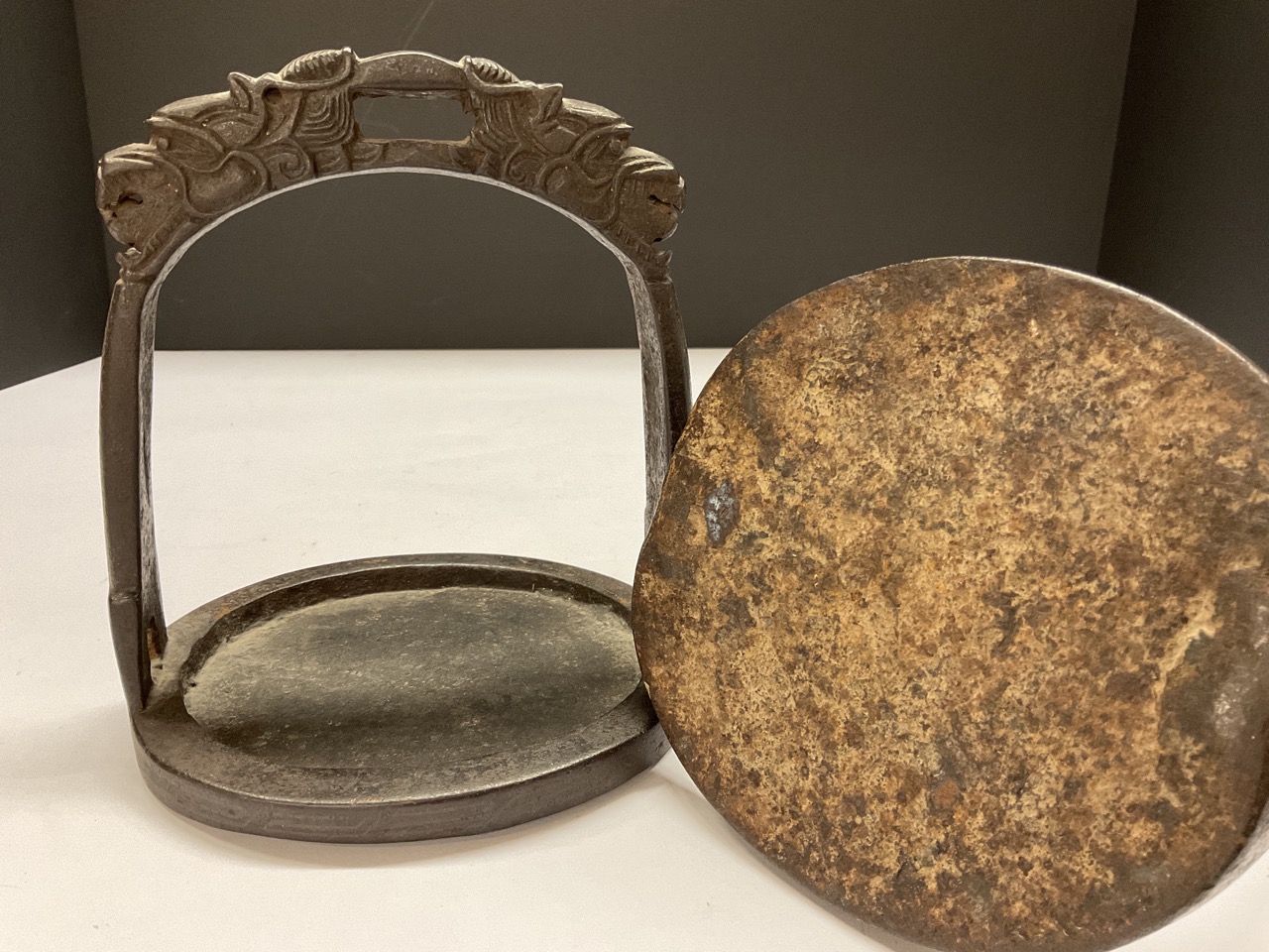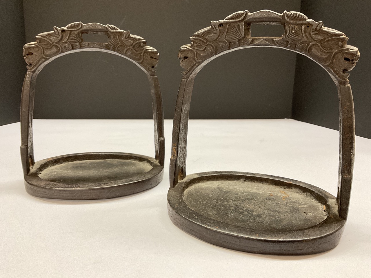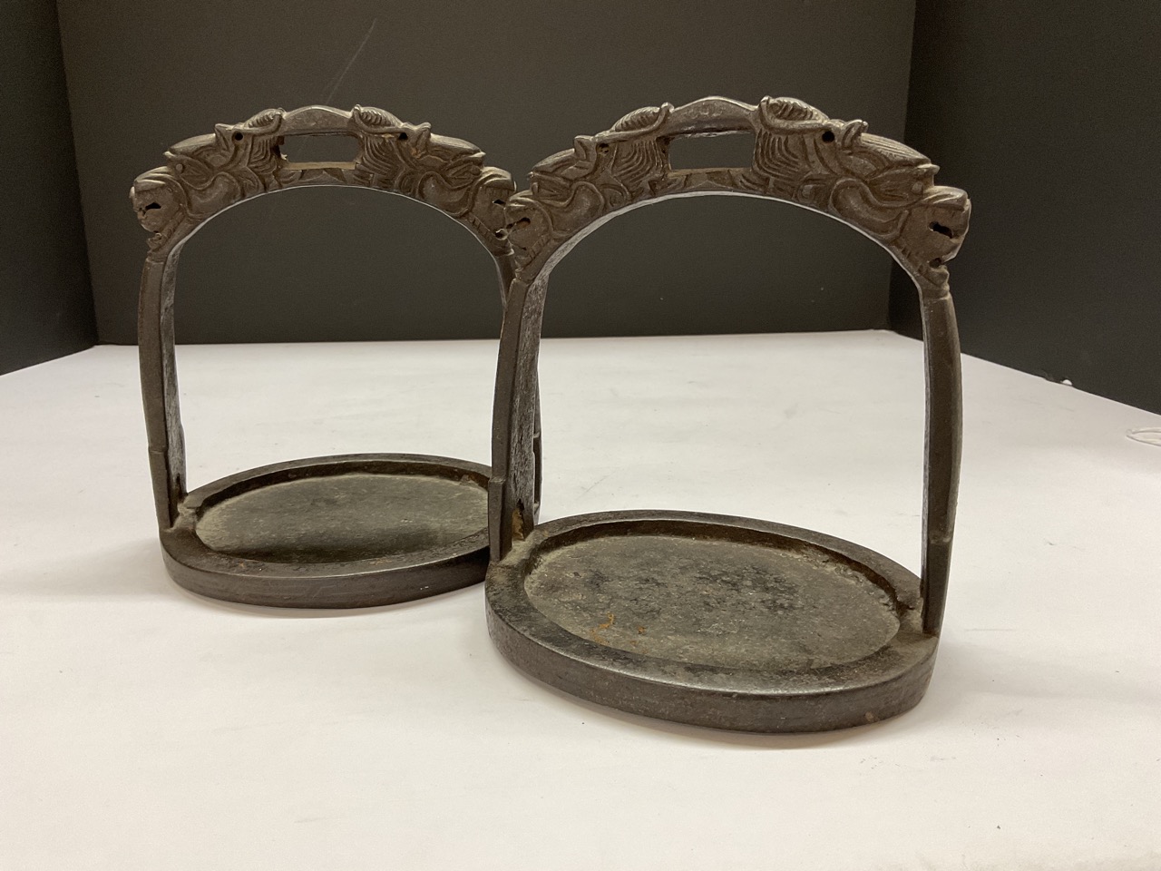 A pair, 19th c. Tibetan horse stirrups with dragons.