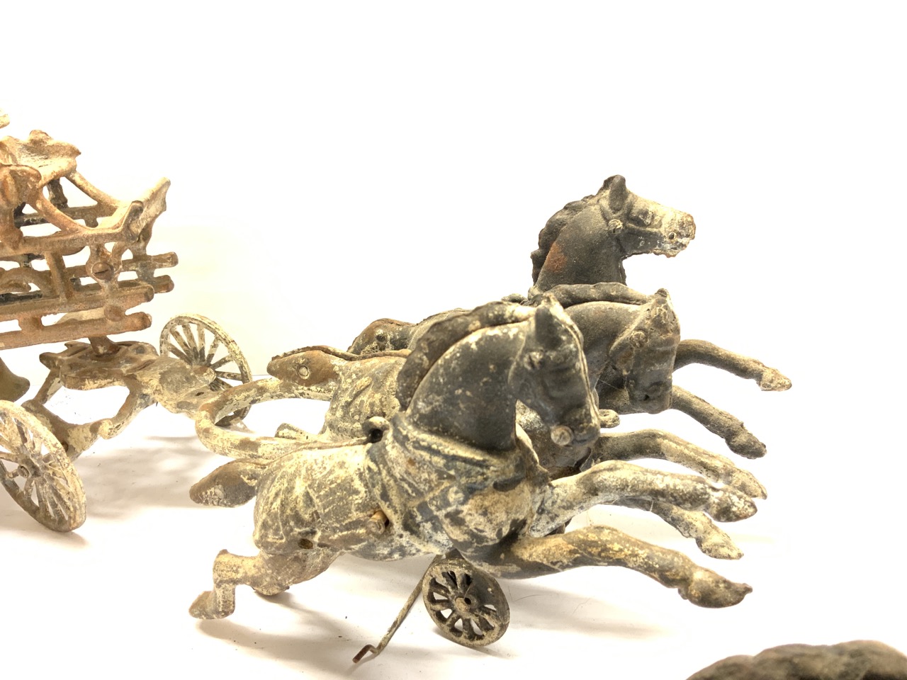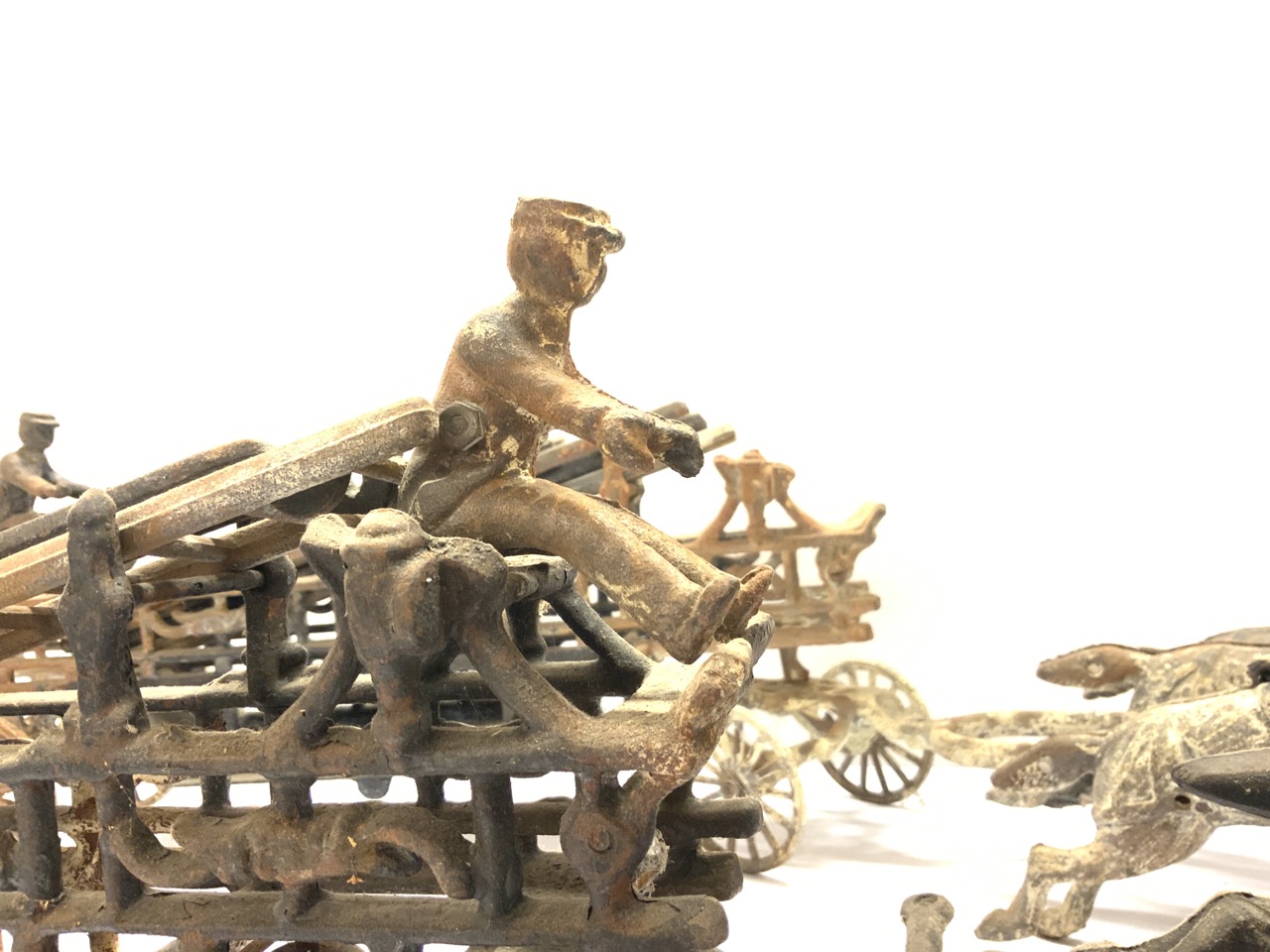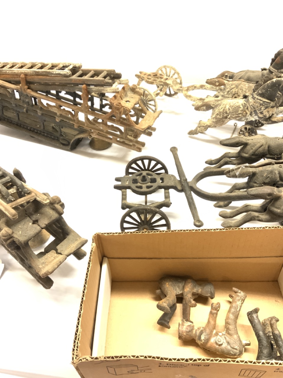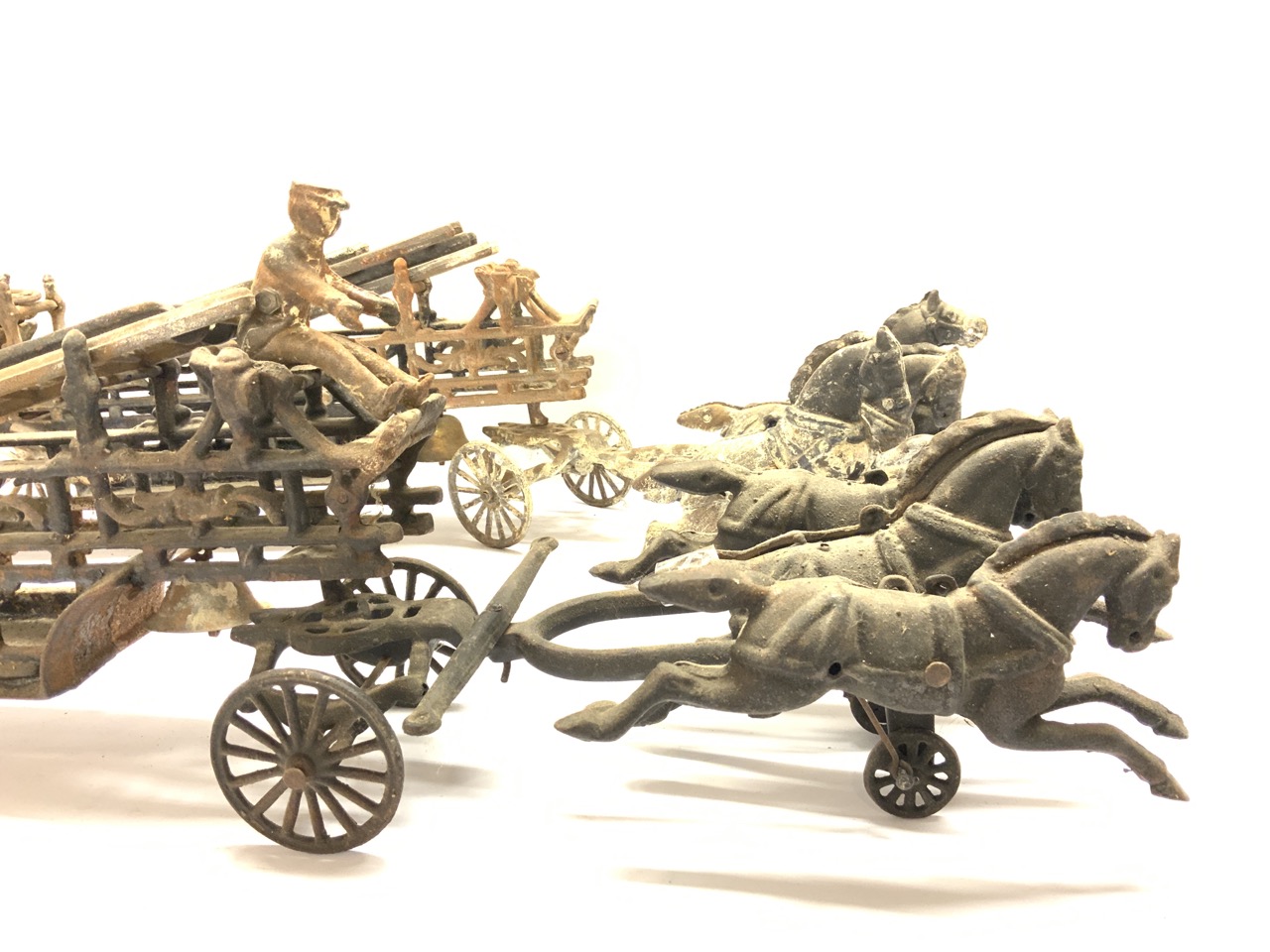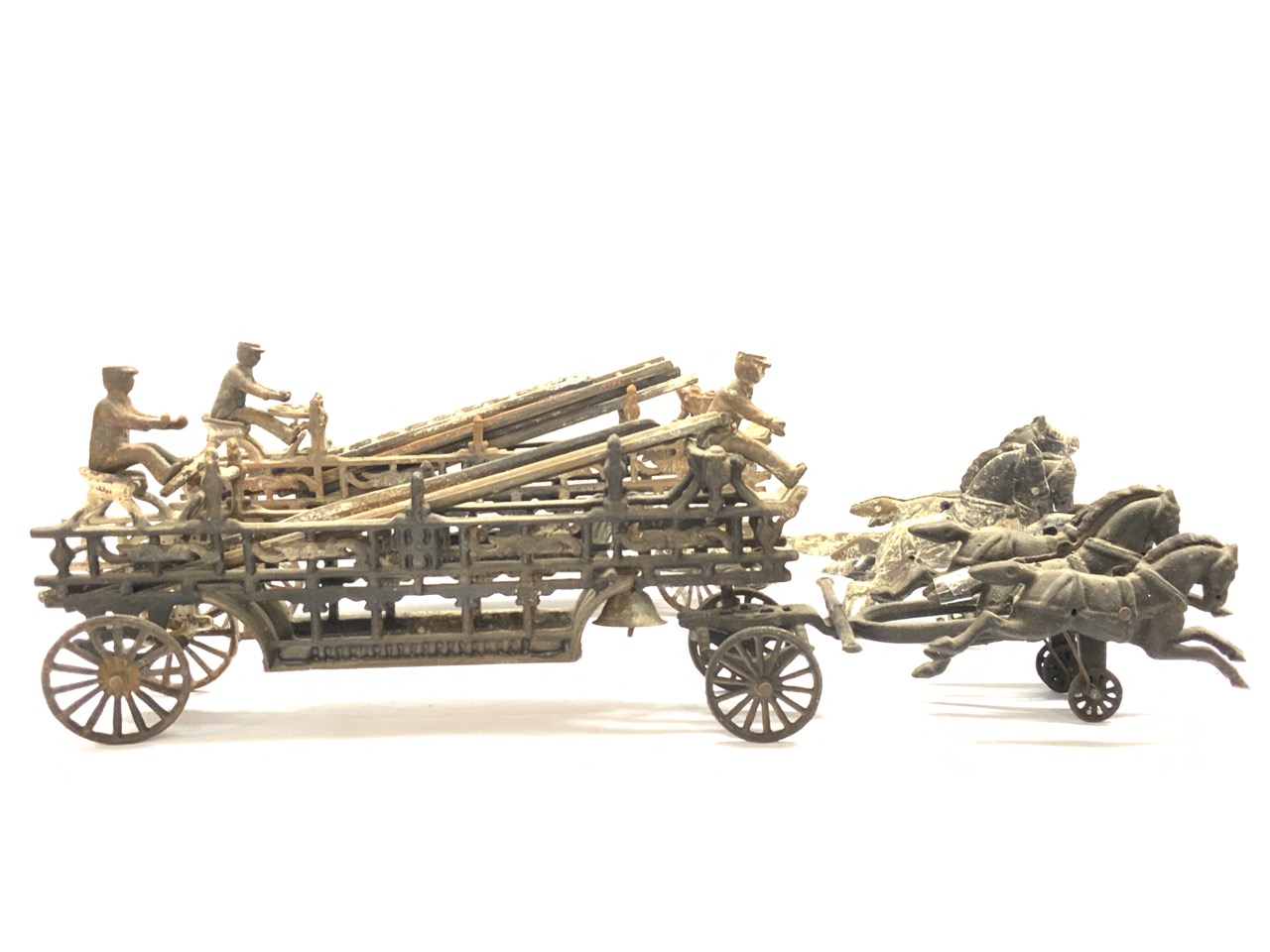 Two Antique Cast Iron Horse Drawn Toy Ladder Trucks