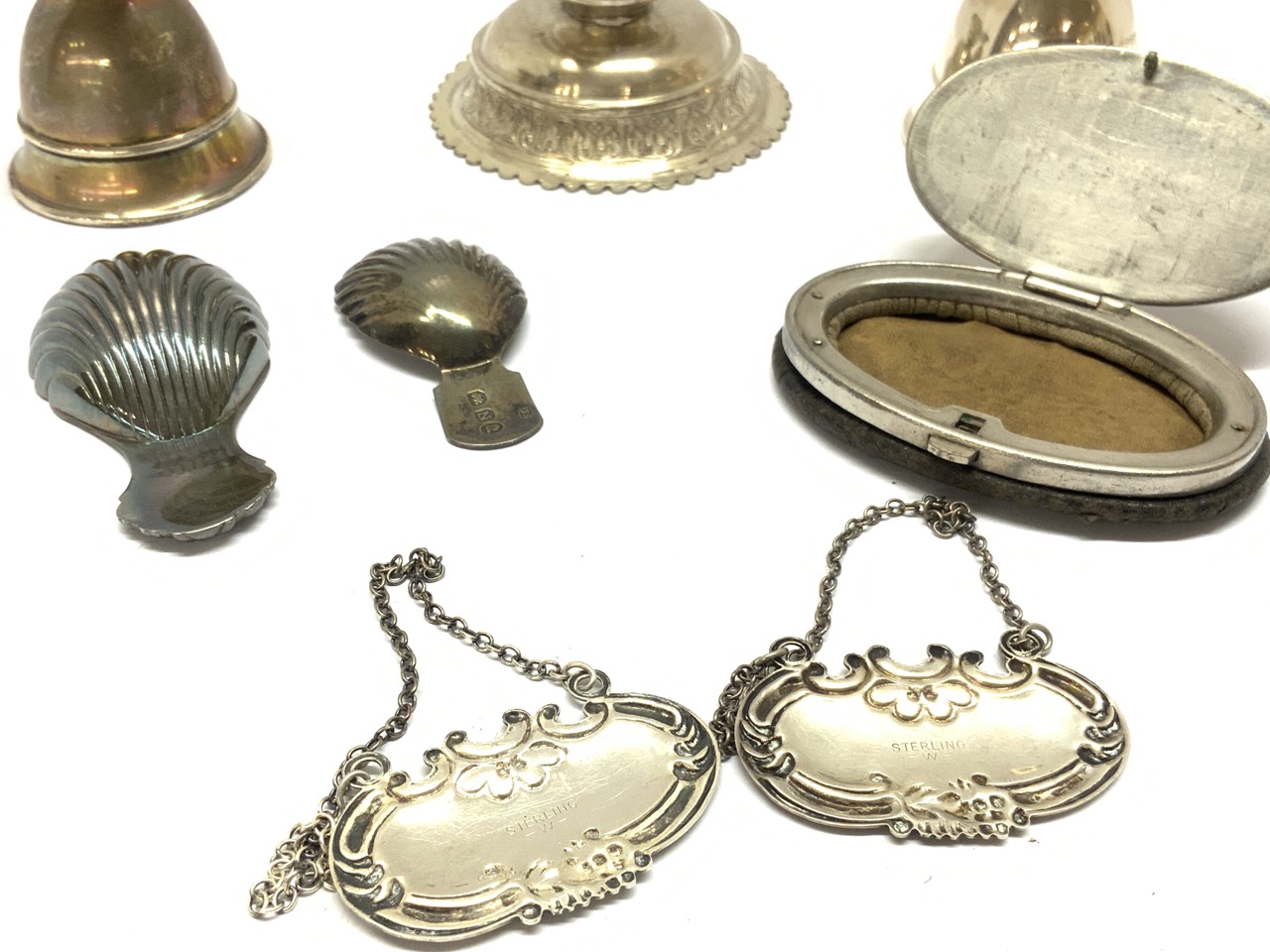 Compiled estate sterling silver group lot. Tags, cordials, wine tasters, finger bowl etc.