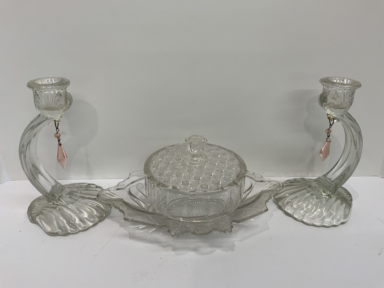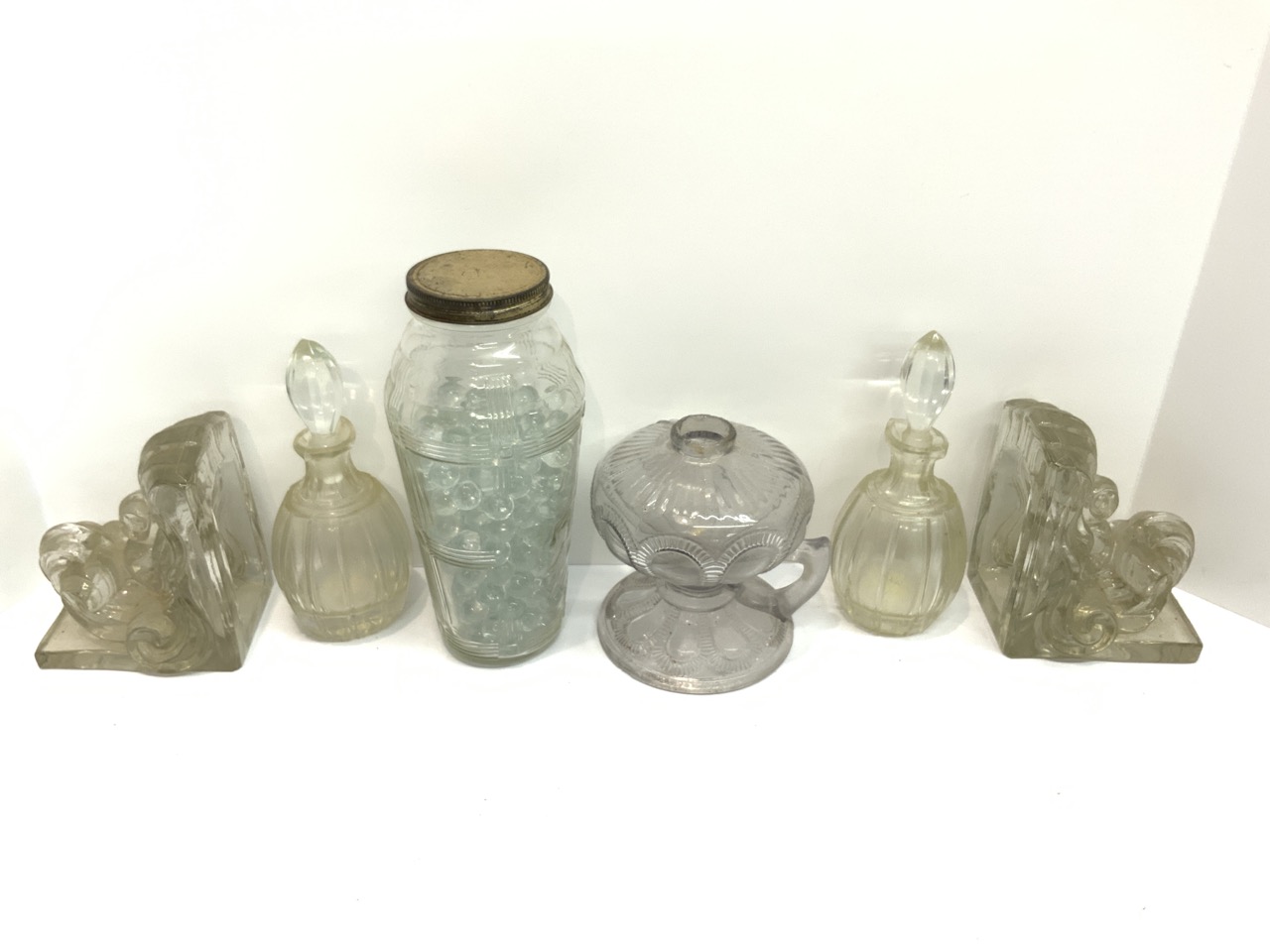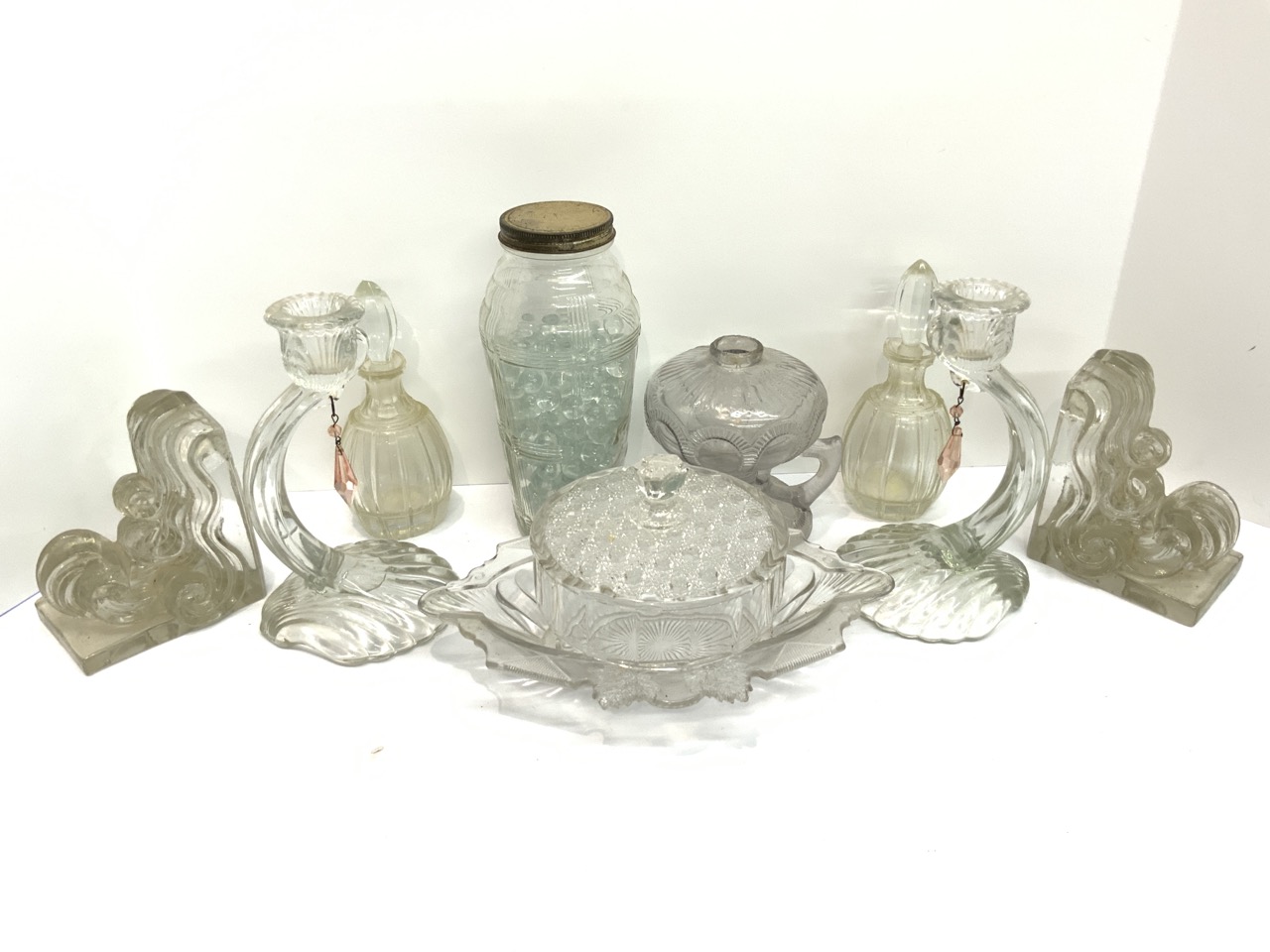 Bookends, candlesticks, jar w glass beads