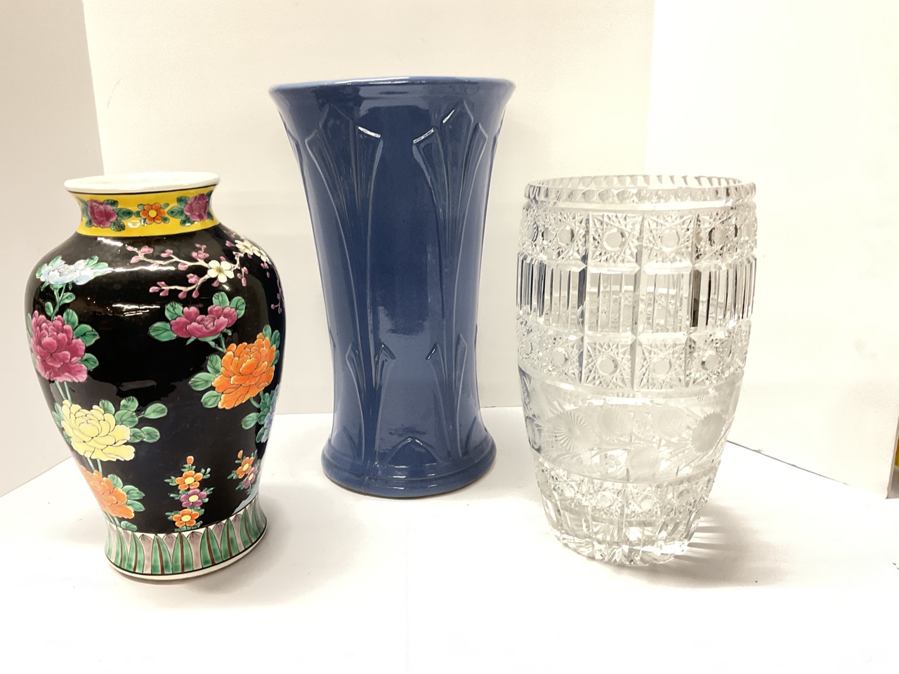 Three (3) Large Vases, 18" Brush Vase, Crystal And Japanese
