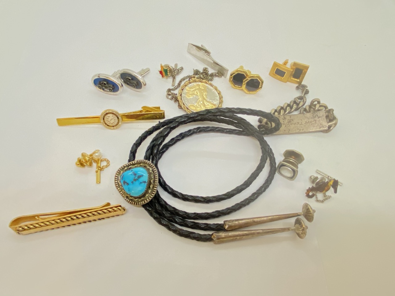 A compiled grouping of men's jewelry including bolo, sterling id bracelet, costume tie clips, cufflinks etc.