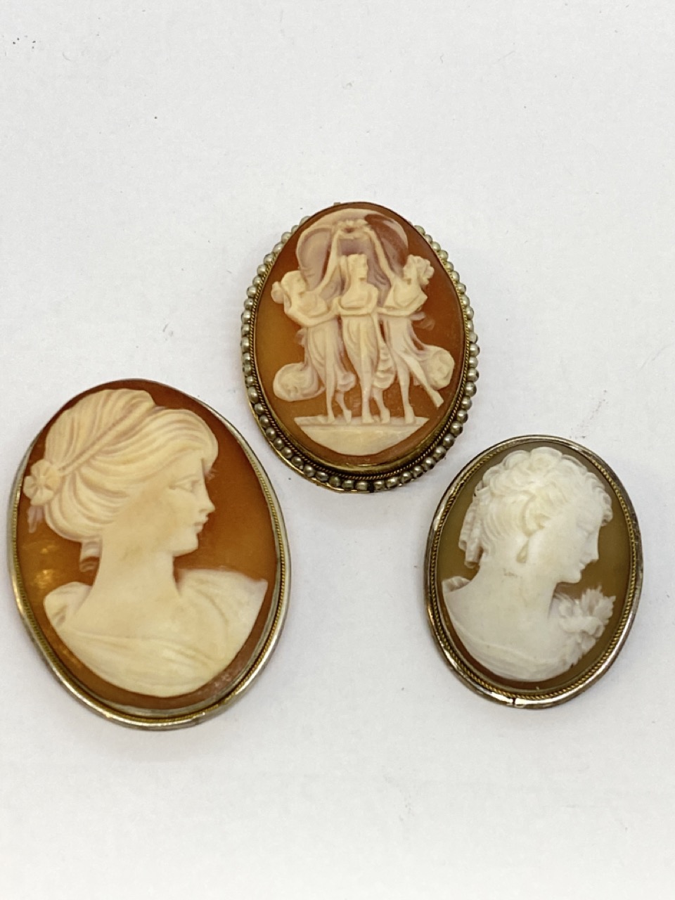 Three (3) Victorian cameos. Silver mounted frames. One gold vermeil (800). 2" size.