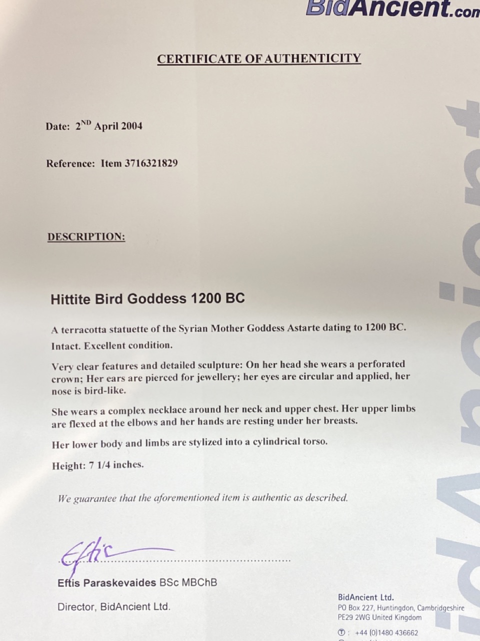 Hittite Bird Goddess 1200 BC Sale history is not a reliable source. This item is being sold as a later decorative copy! Provenance: Estate of Lewis, Ellenville, NY. Proceeds to go to Temple Schalom, Monticello, New York.