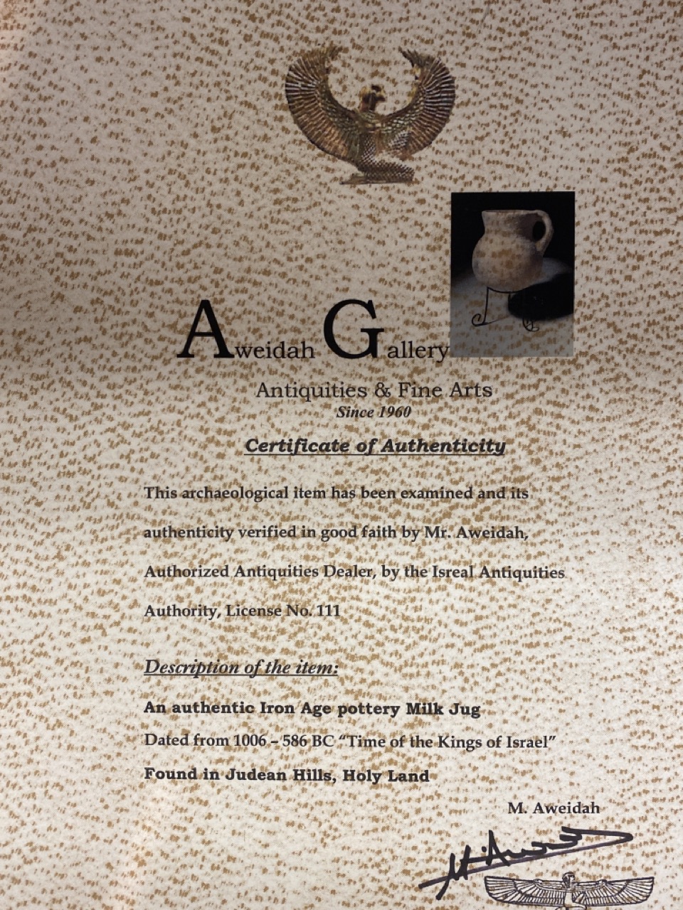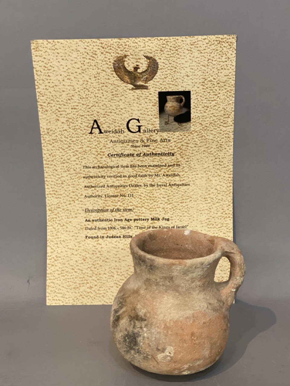 Authentic iron age pottery milk jug 1006–5 86 BC time of the kings of Israel found in Judean Hills, holy land