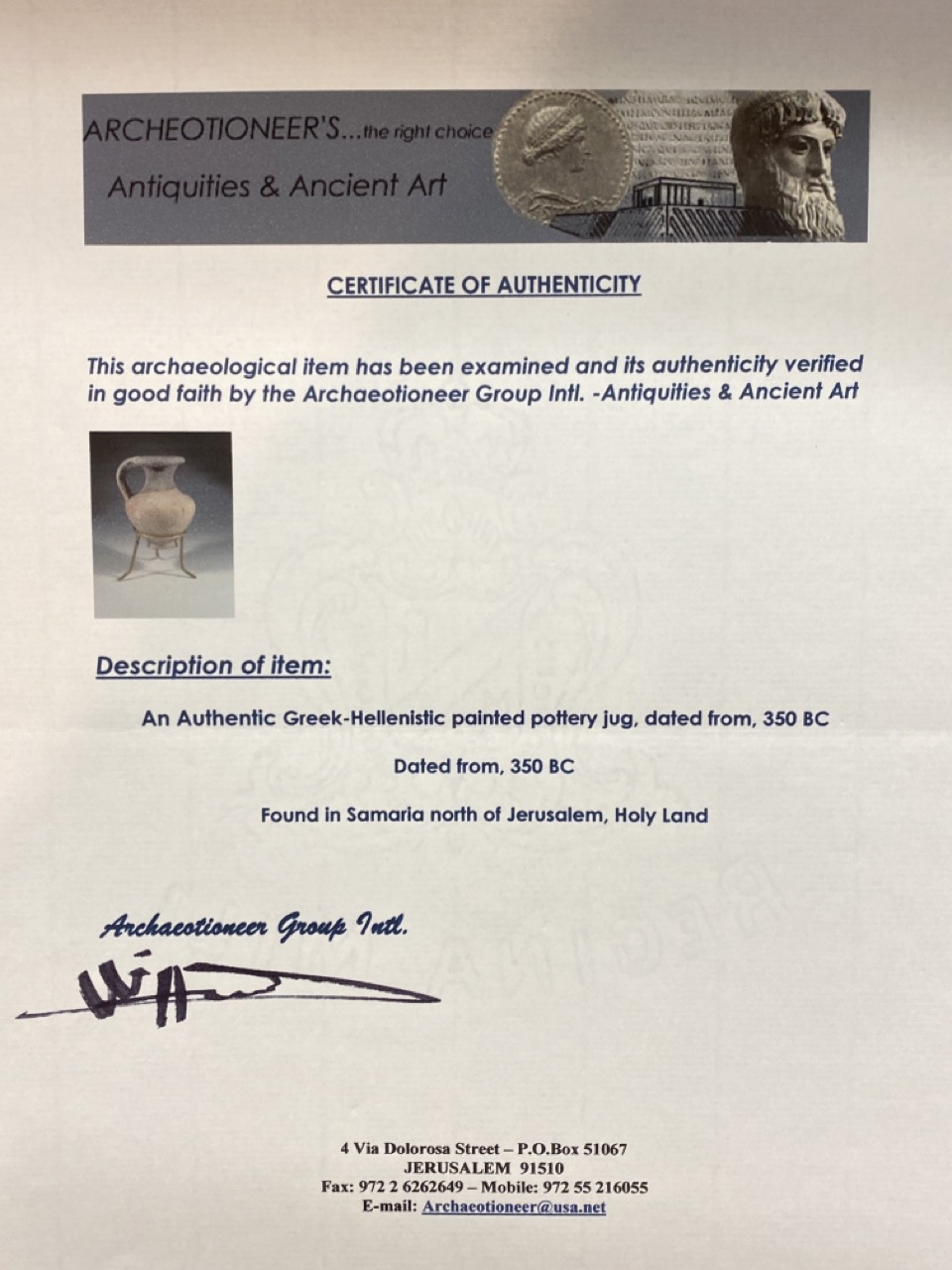 Authentic Greek Hellenistic Jug 350 BC found in Samaria north of Jerusalem