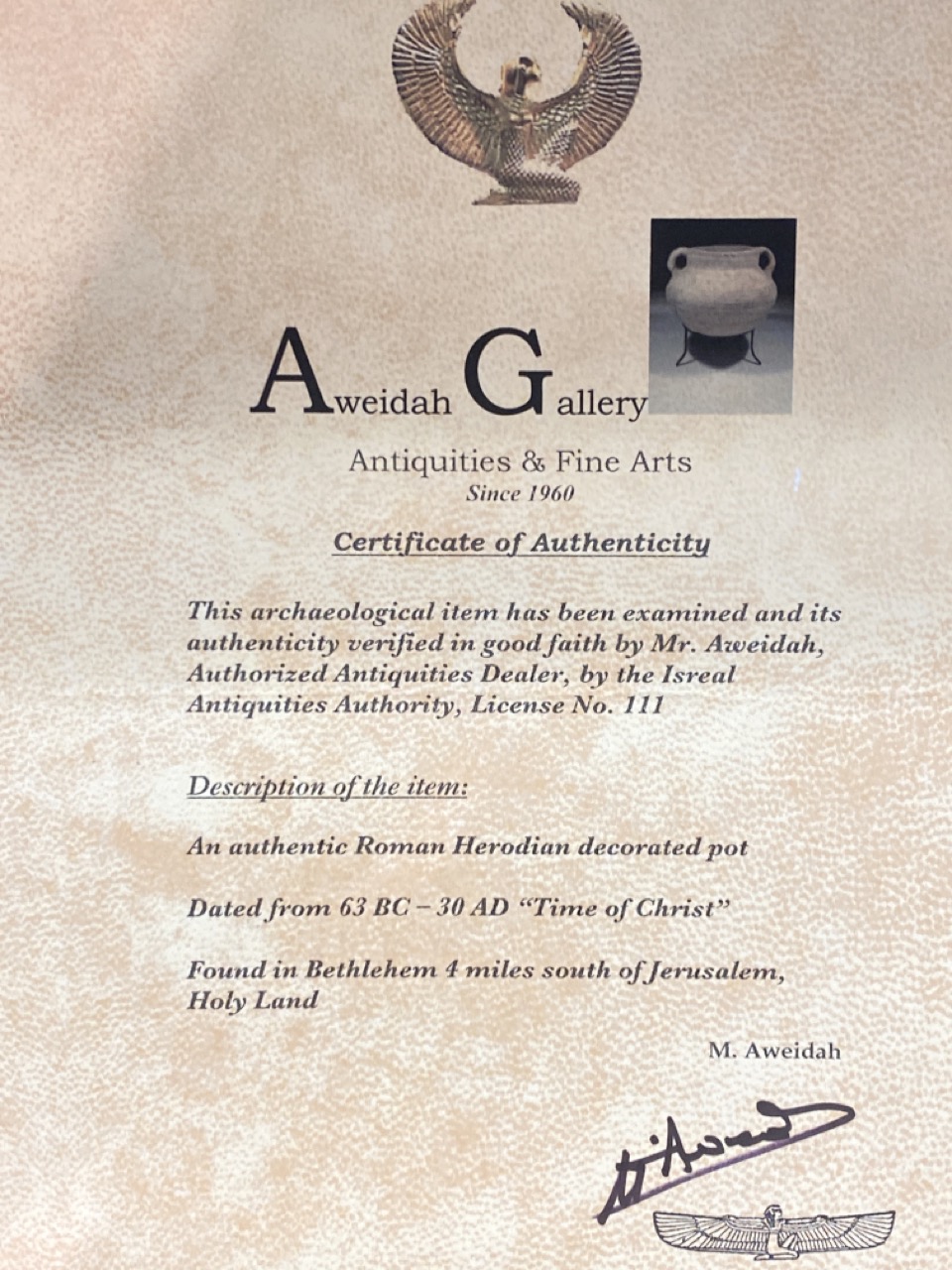 Authentic Roman Herodian decorated pot 60 B.C. - 30 A.D. time of Christ found in Bethlehem,south of Jerusalem, Holy Land
