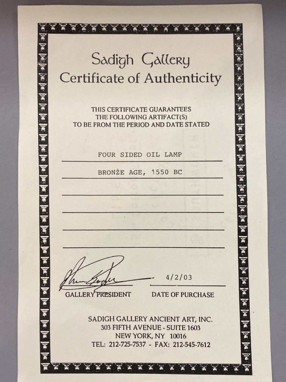 Bronze Age 1550 BC Four Sided Oil Lamp
