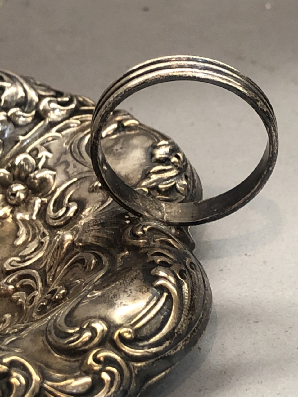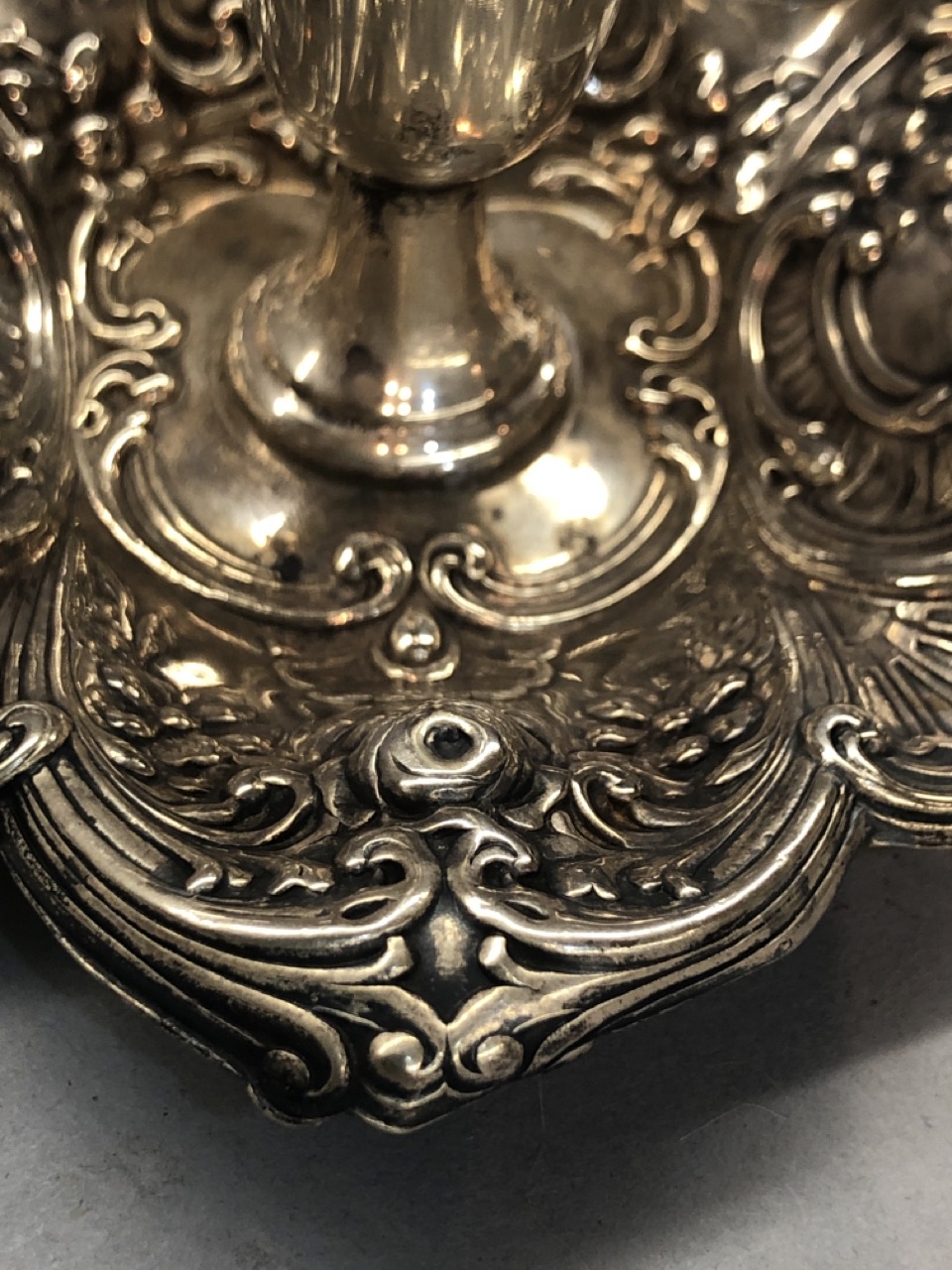Highly ornate sterling silver repousse candlestick.