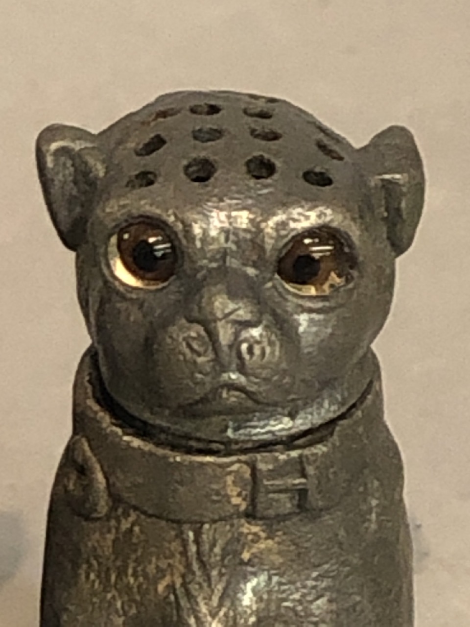 A vintage pair of pewter or spelter metal dog salt and pepper shakers. Glass inset eyes.