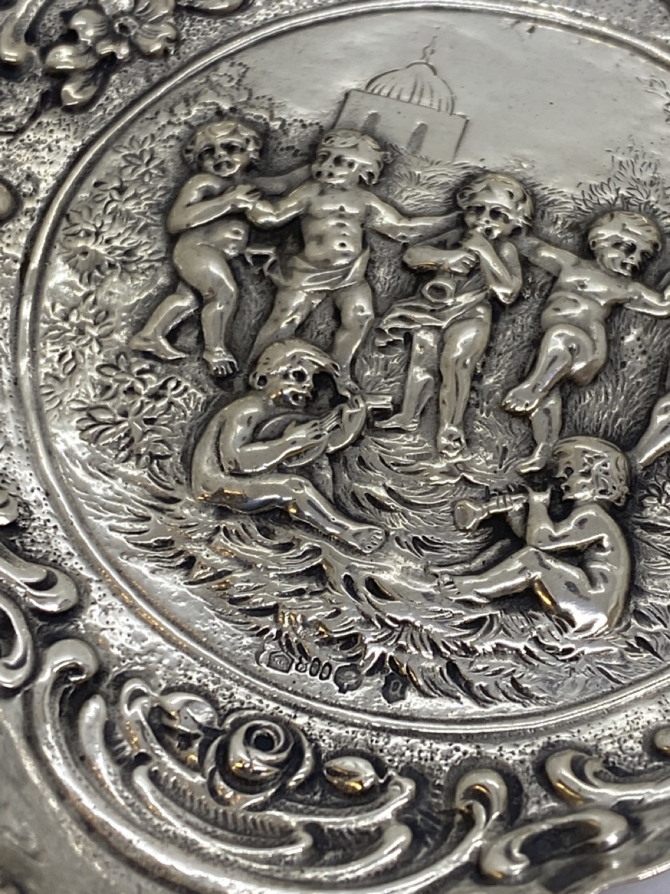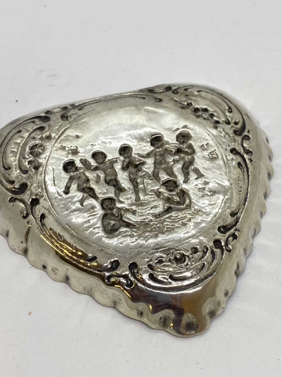 800 silver Continental style heart shaped tray with Putti.