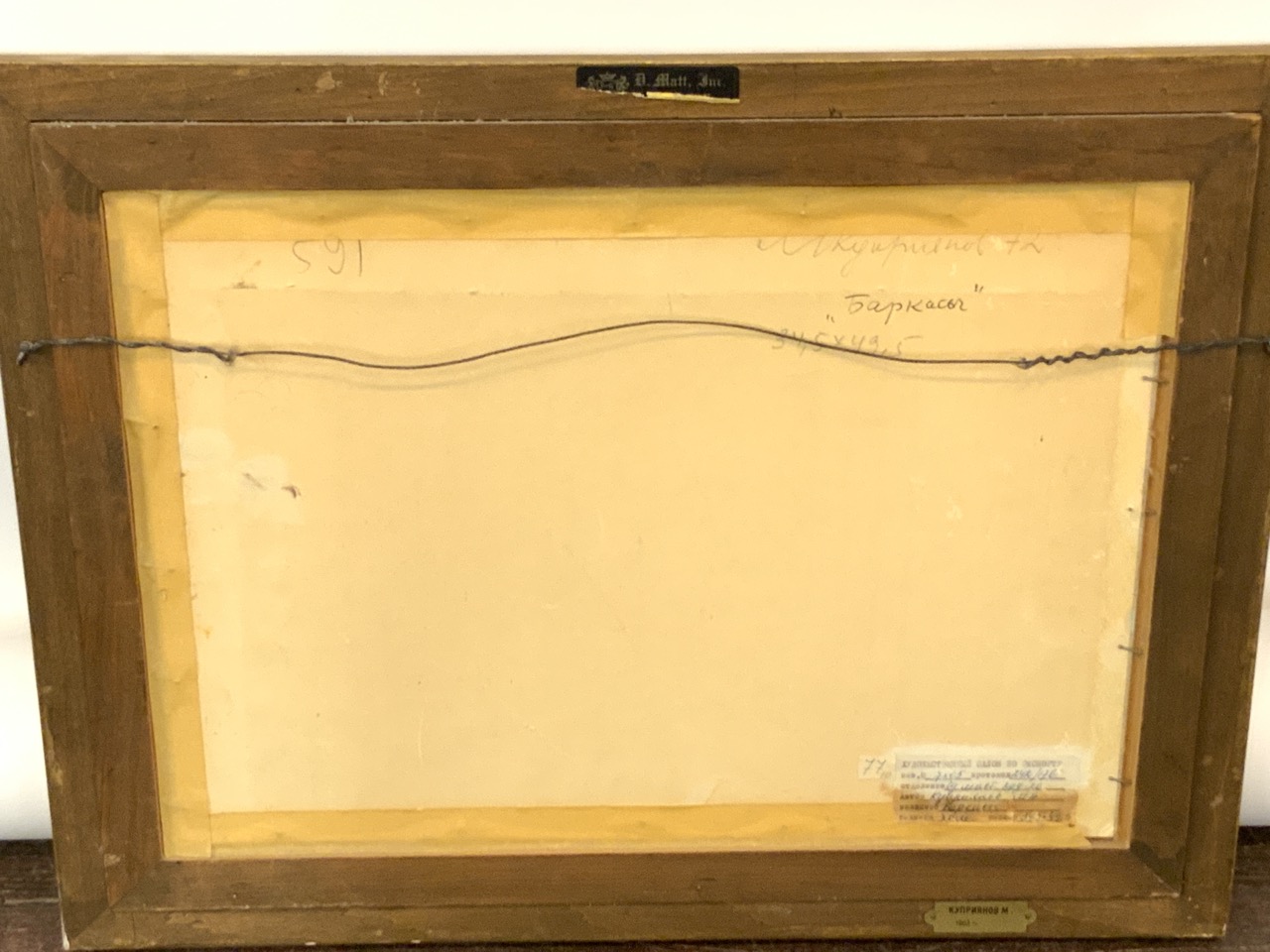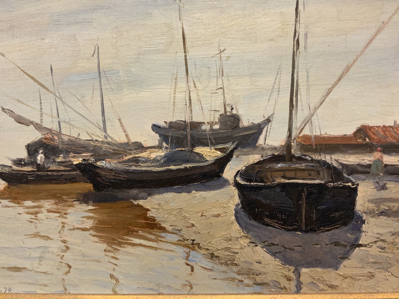 Kupriyanov Mikhail Vasilyevich (Russian, 1903-1992). Boats along shore. Created: 1972. Signed lower left. Oil on Board Dimensions: 13” x 19” and 18 3/4” x 24 1/2” framed