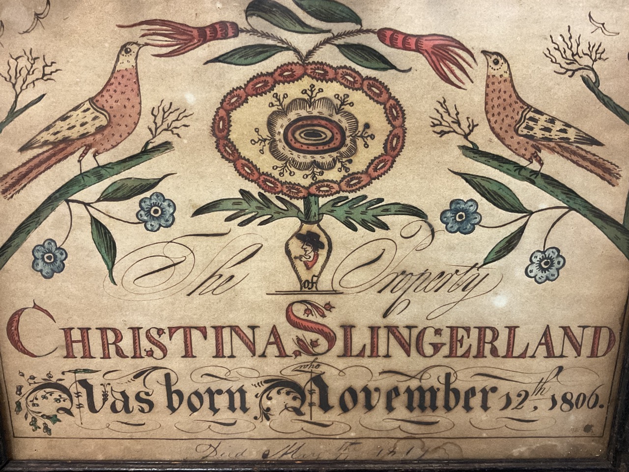 Property Of Christina Slingerland Born November 12, 1806. Decorated with Distelfinks, flowers and a man with hat.