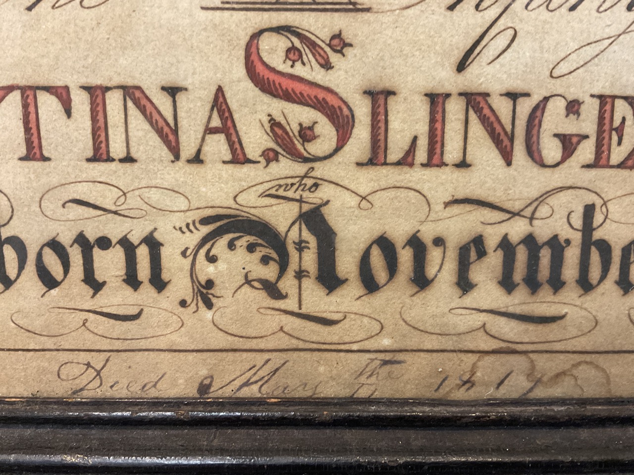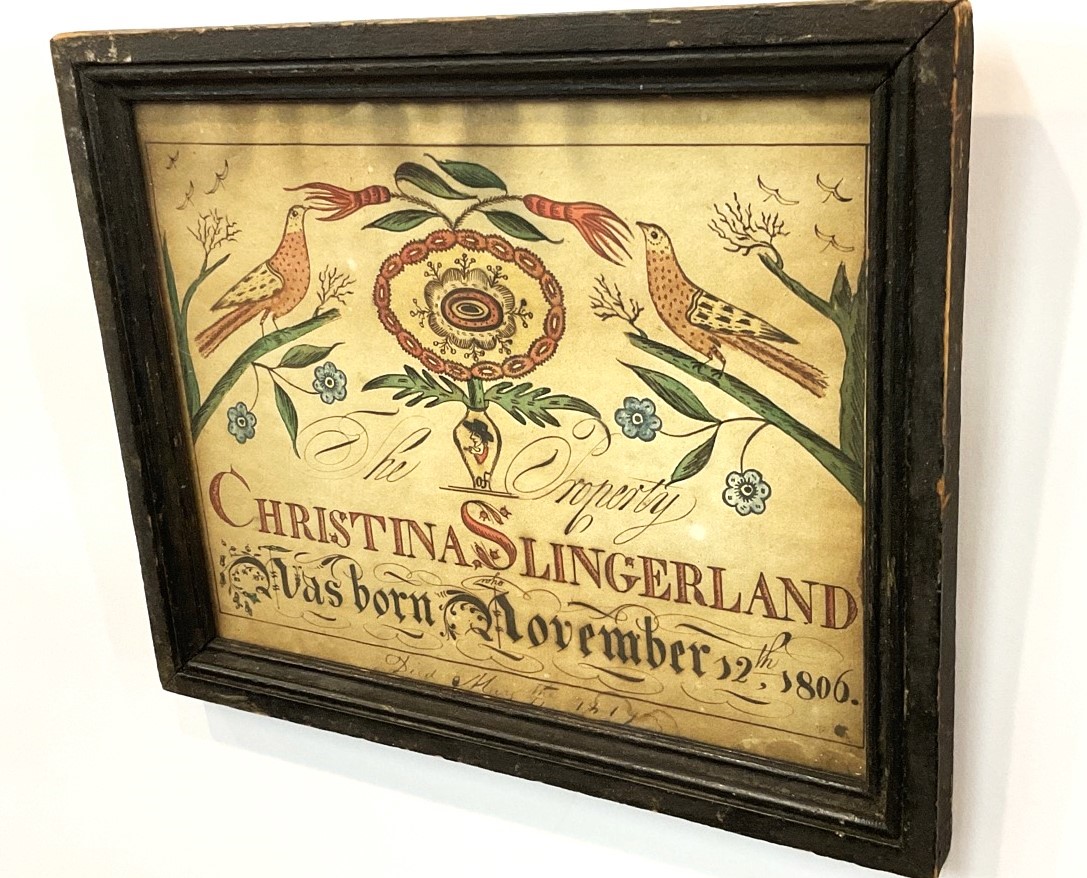 Provenance: This Fraktur has remained in the same family and this is the first time it is being sold. Slingerland family connected to Jacob Johnson Attorney Minisink/Ridgebury NY, County Of Orange. 19th c. by descent.
