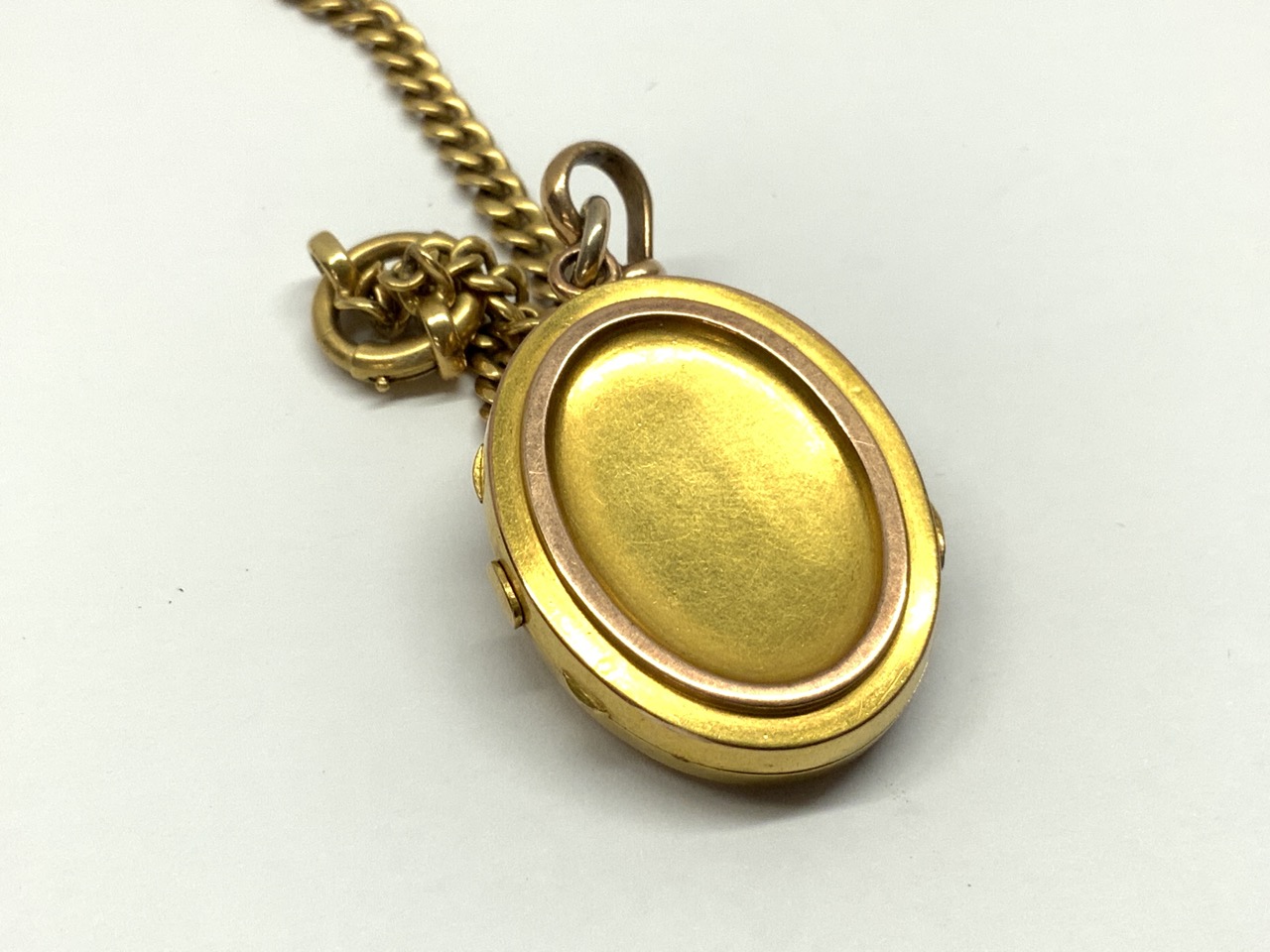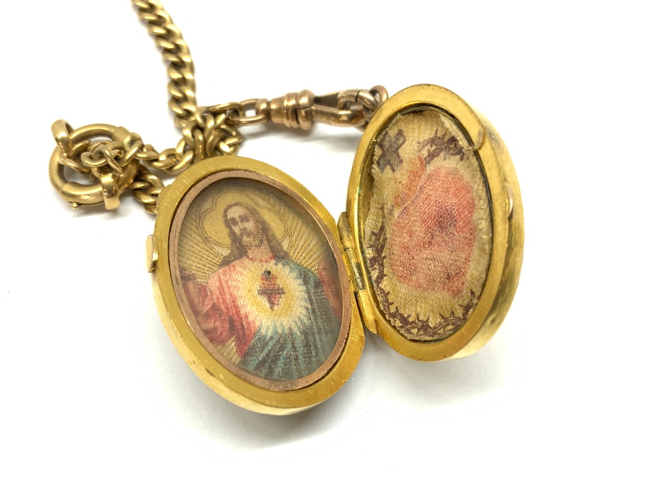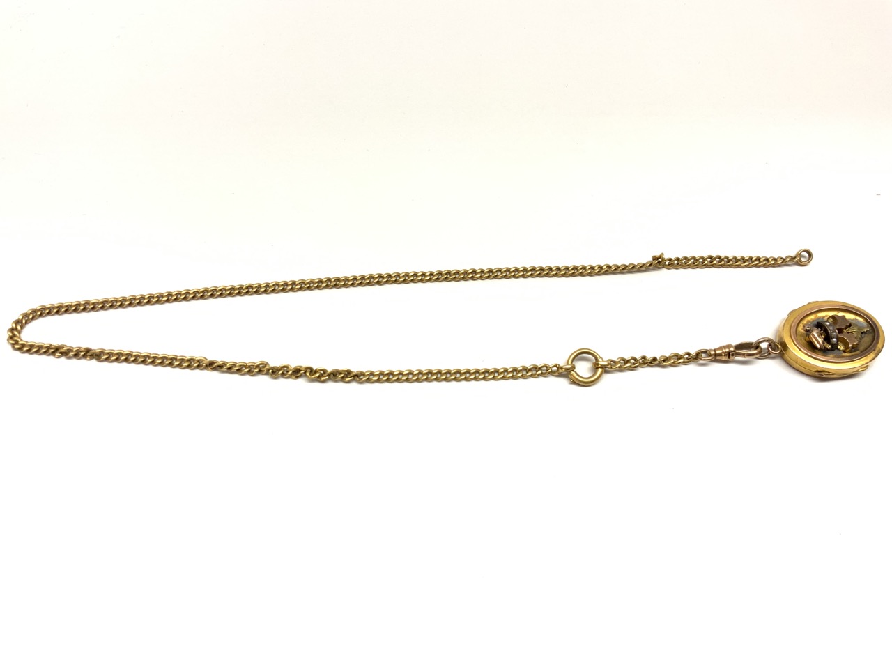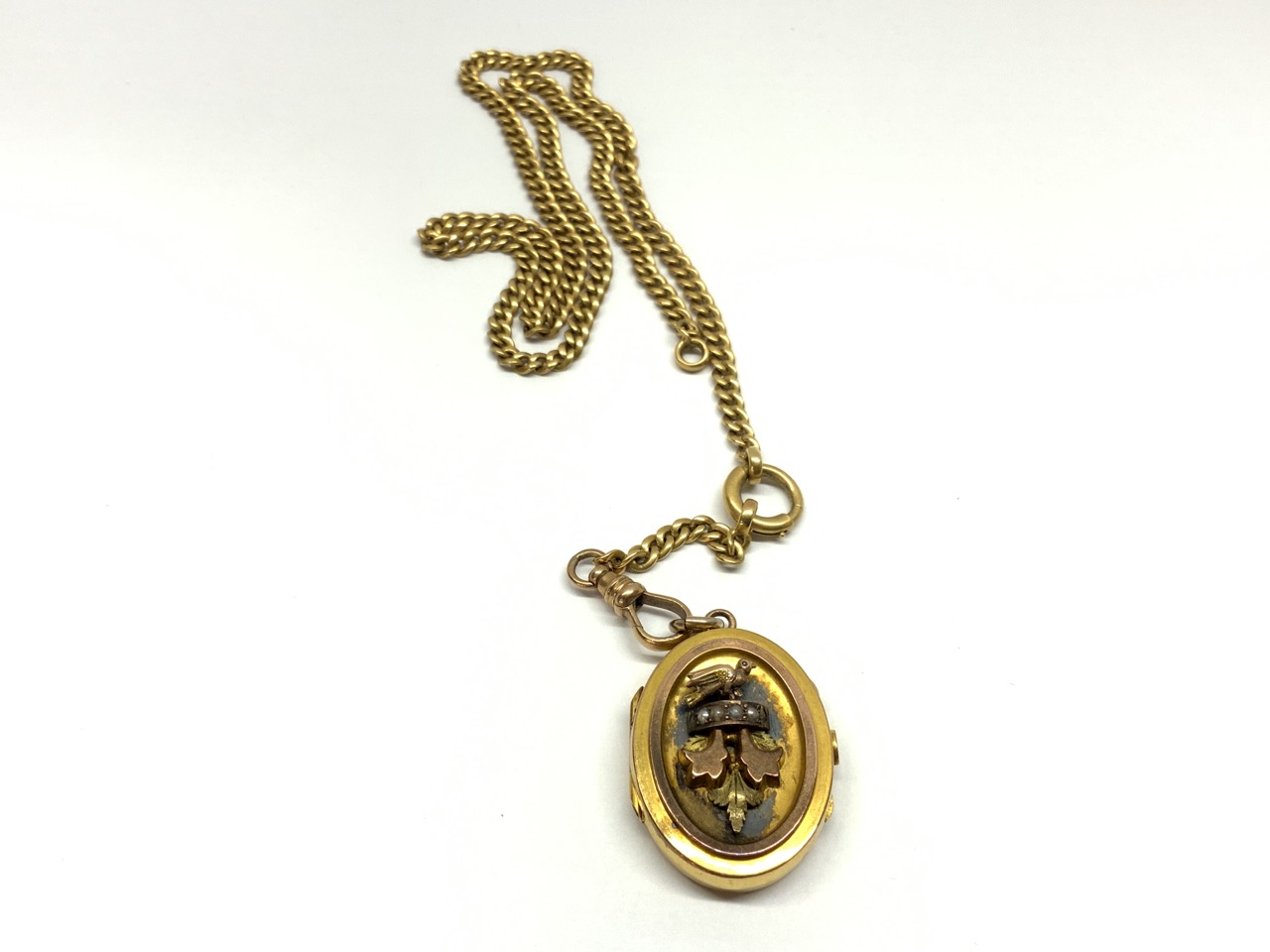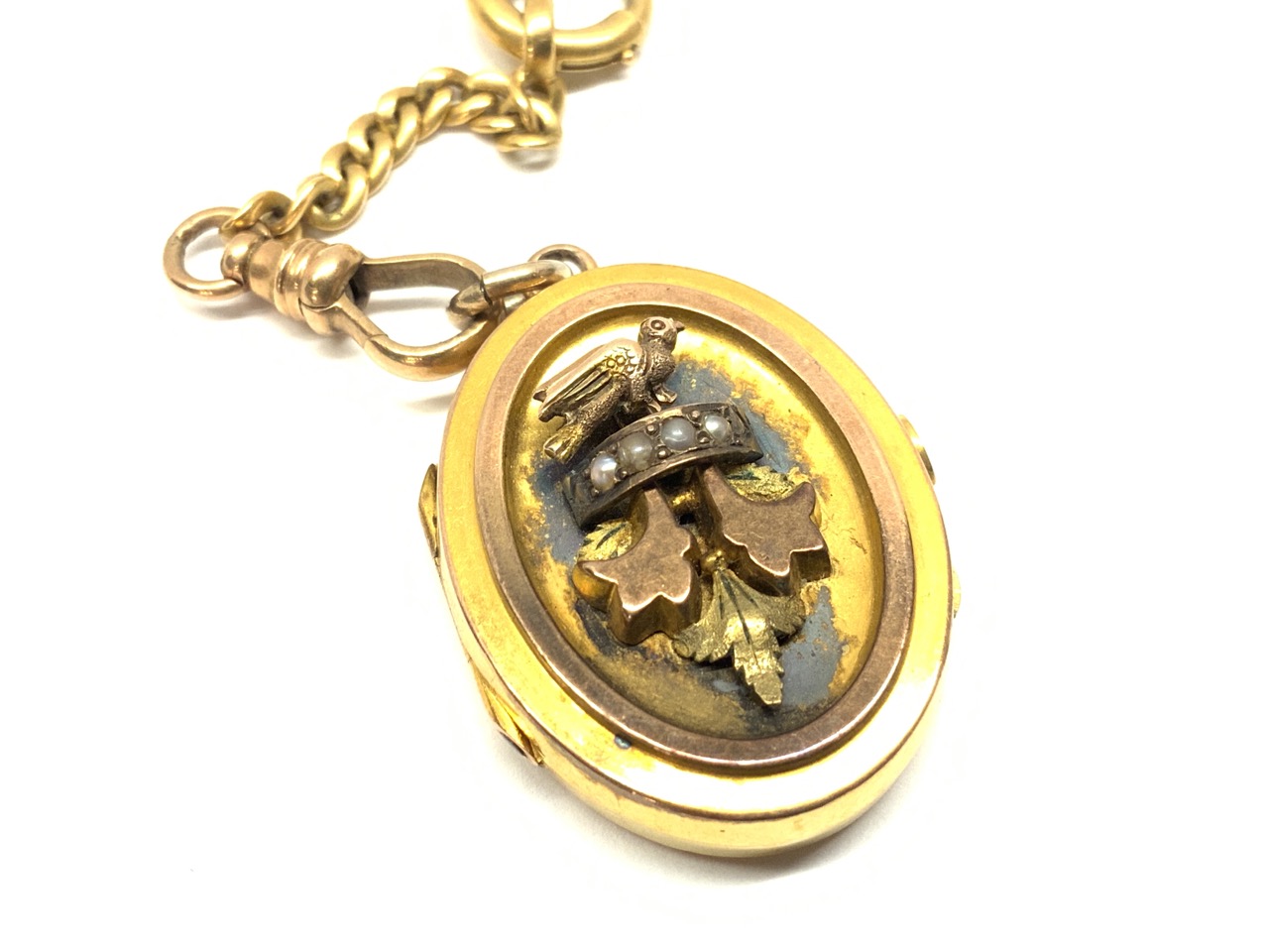 Fine Solid 14K y.g. Watch Fob Chain Victorian locket with bird, fleur de lis and seed pearls.
