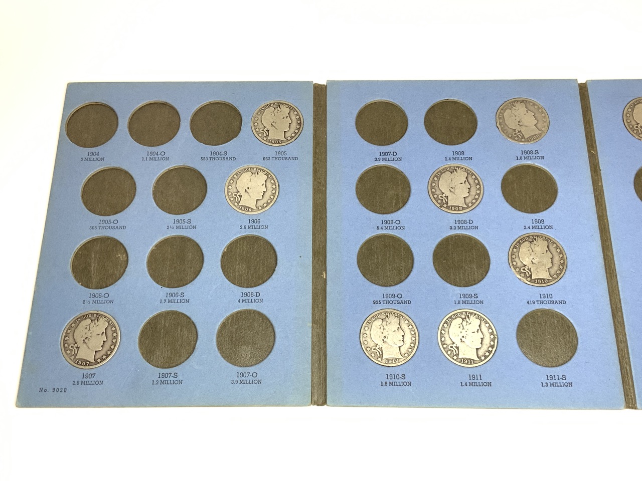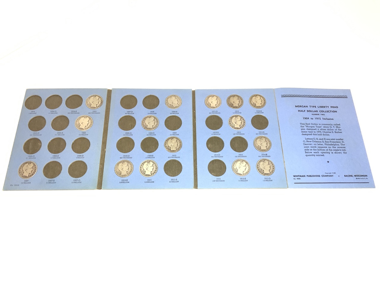 Barber Half Dollar Whitman Album Containing 15 Silver Half Dollars.