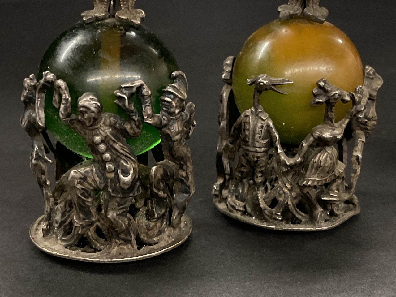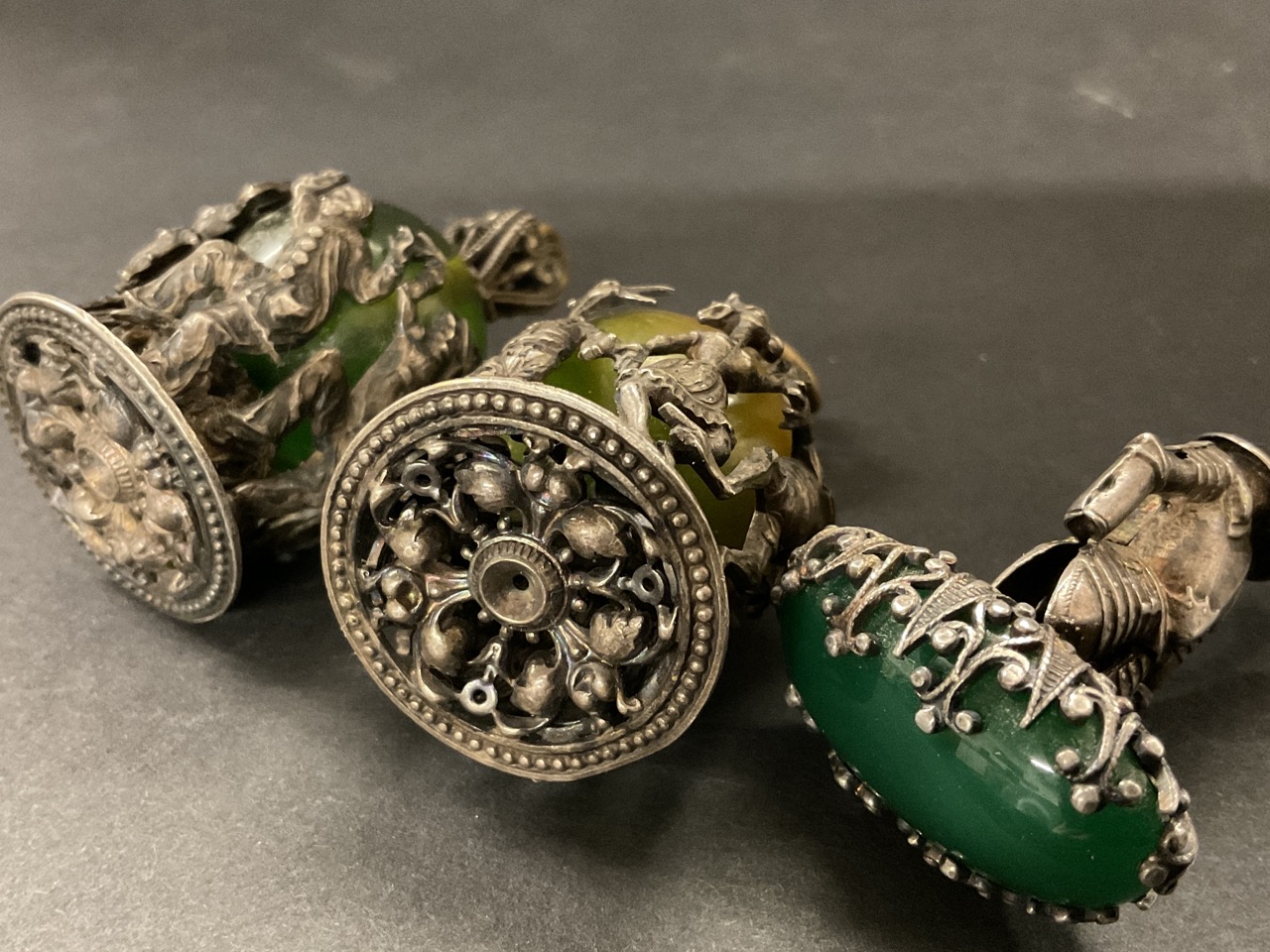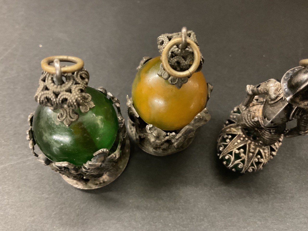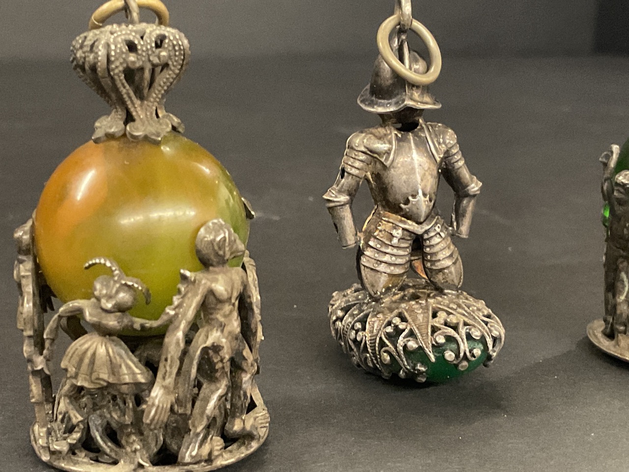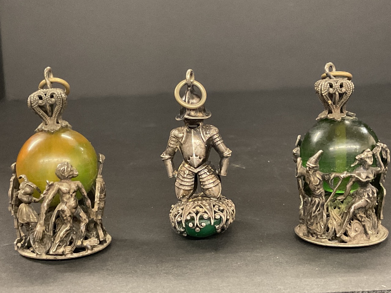 A trio of whimsical watch fob charm pendants with dancing animal and theatrical figures. Man with shield of armor and green stone. Silver plated or low grade silver.