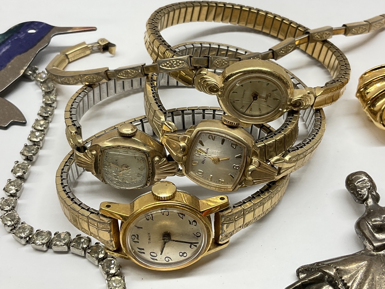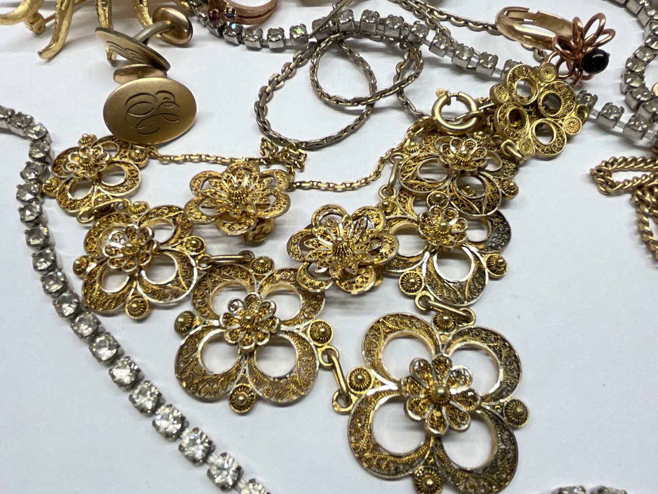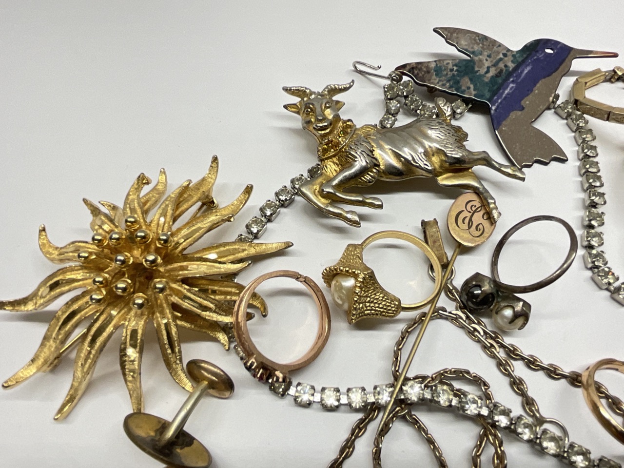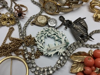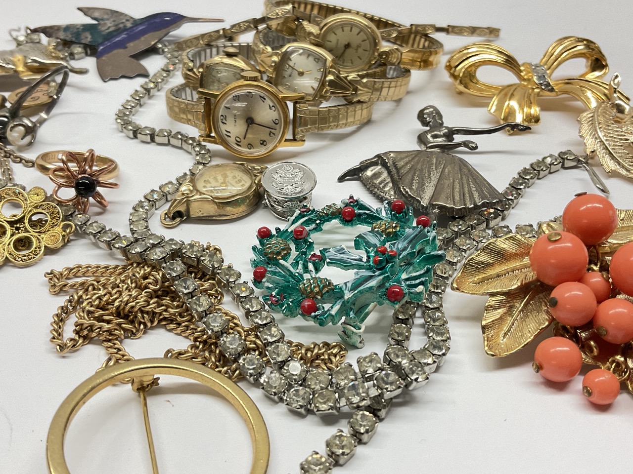 Estate Compiled Costume Jewelry Group. Sterling ballerina pin, filigree necklace, watches for repair etc.