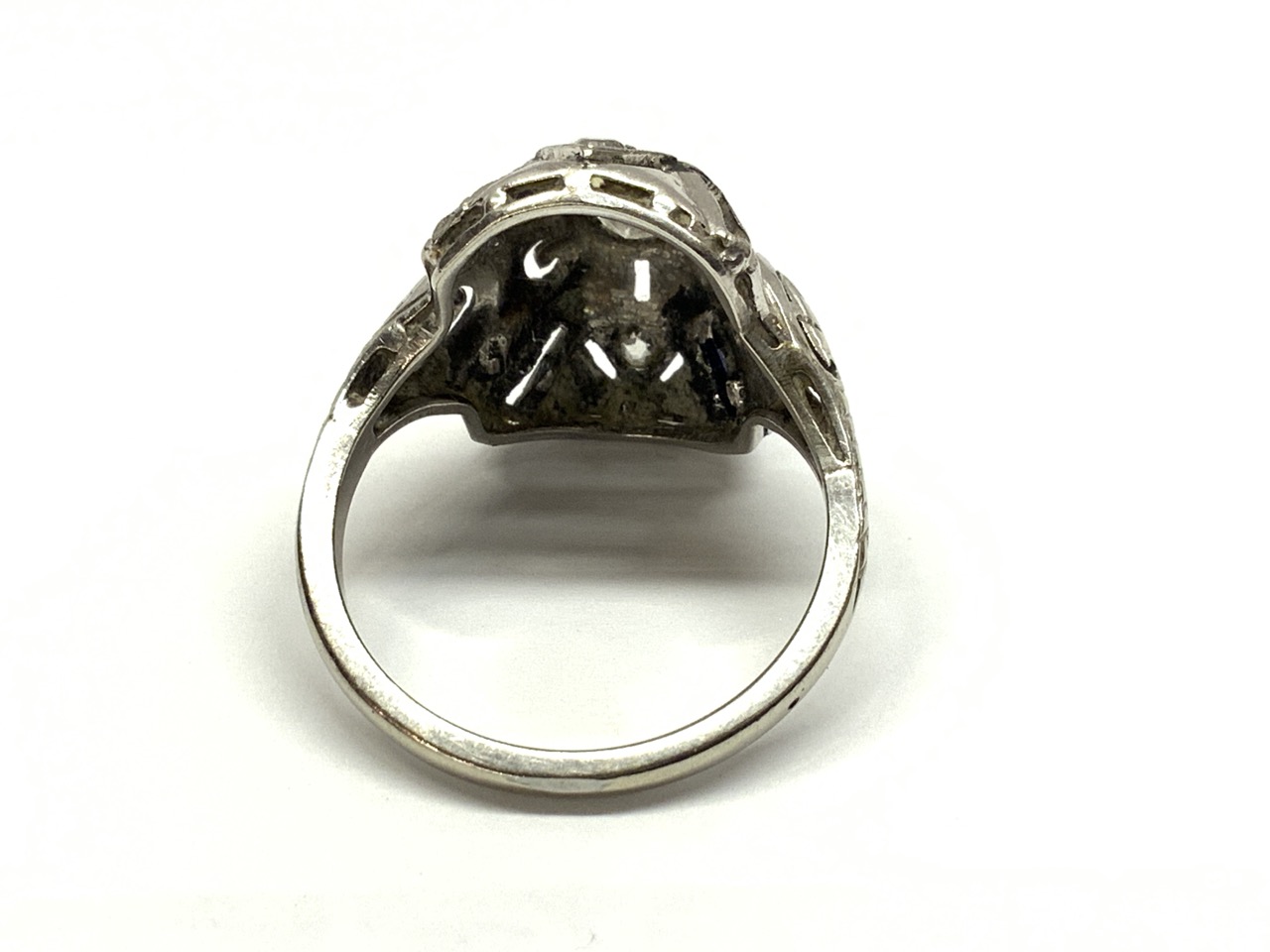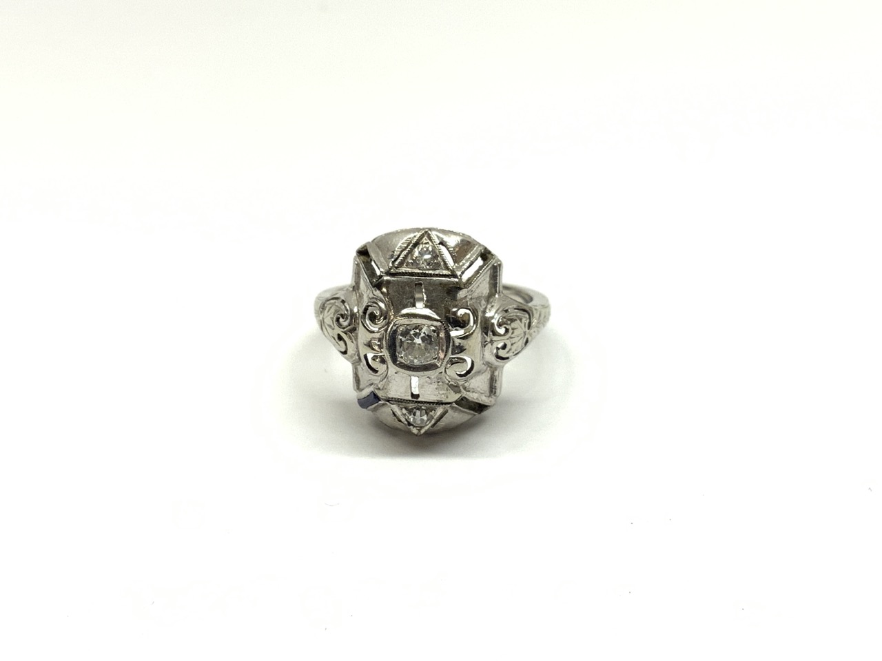 Edwadian diamond ring. Three (3) blue sapphire baguette stones missing.