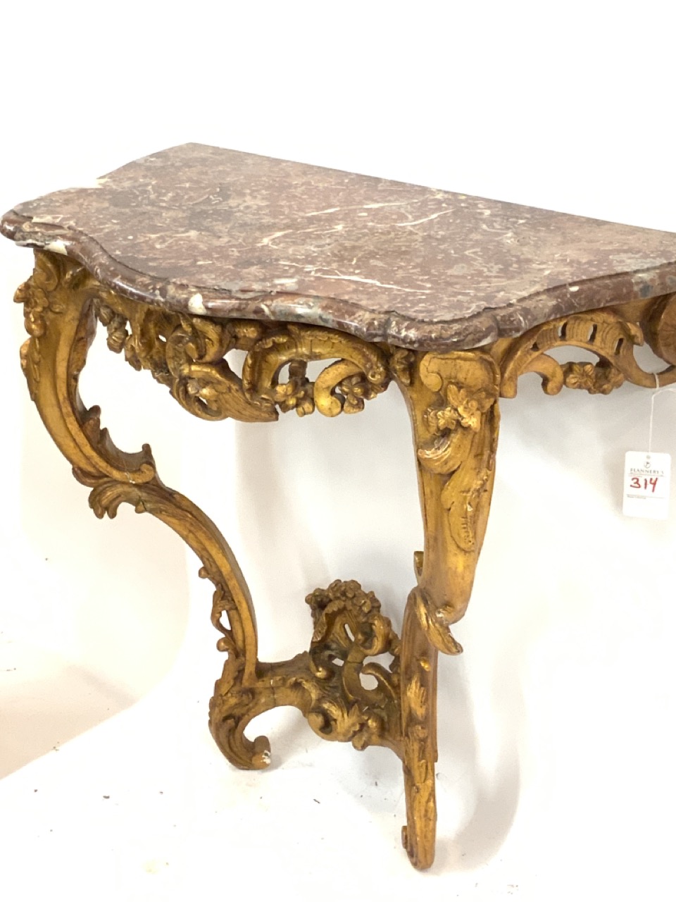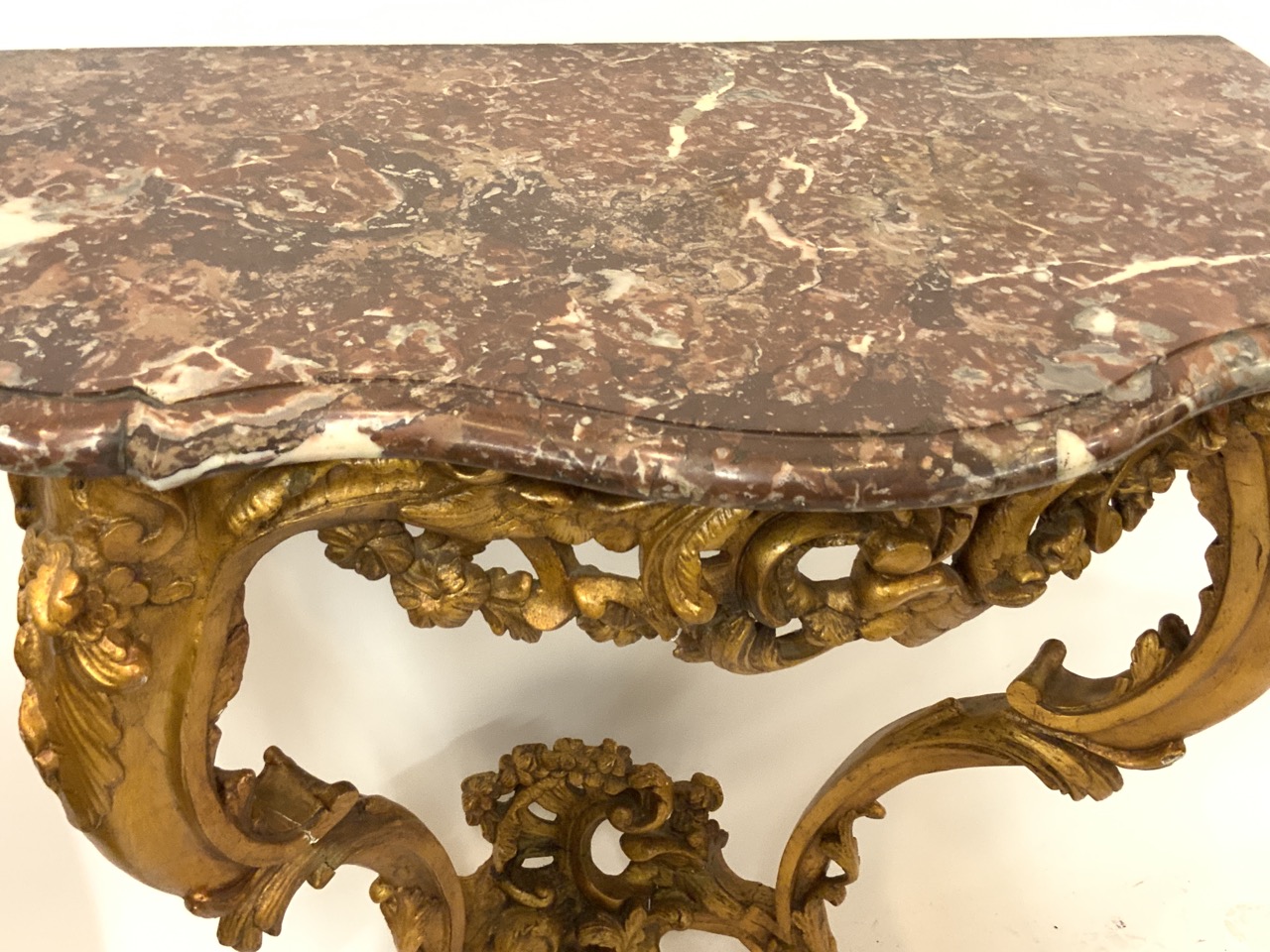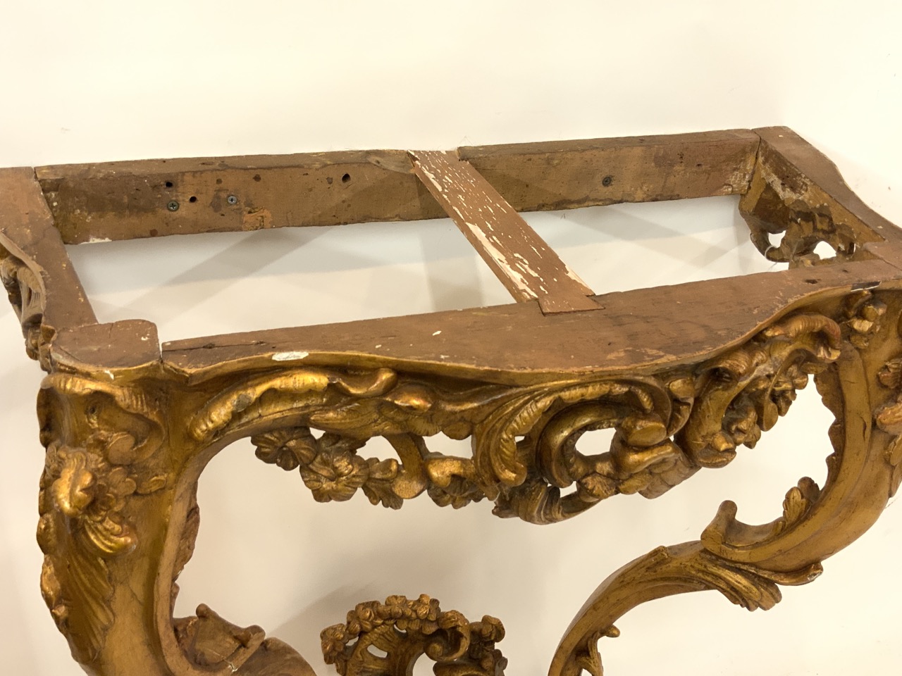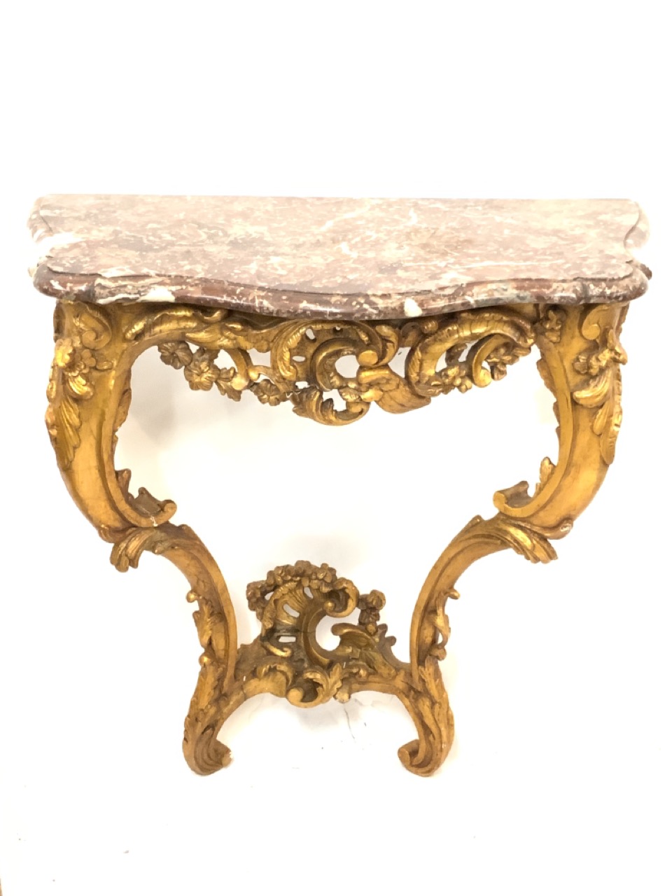 A fine Italian Rococo styel gilt wood hall table with marble top. Some repairs to work noted consistent with age. Table mounts into the wall. This table is not made to stand on its own.