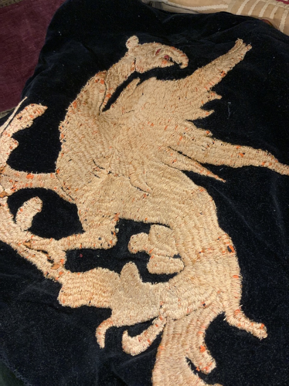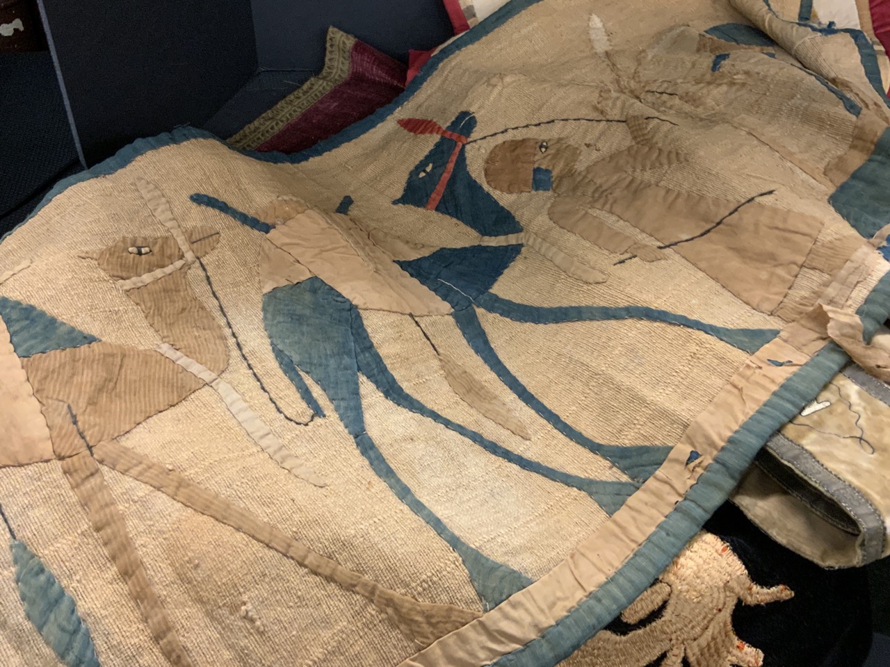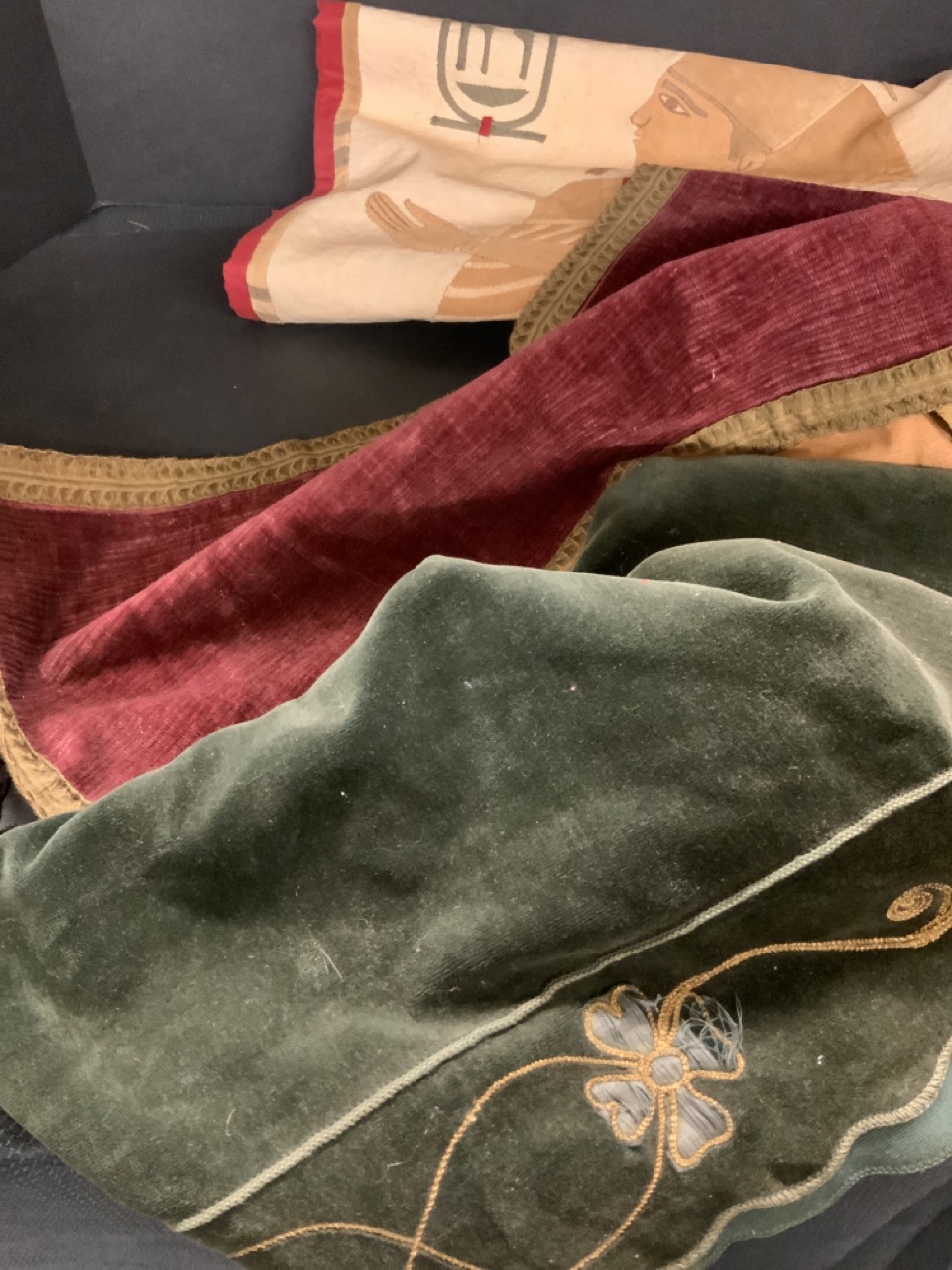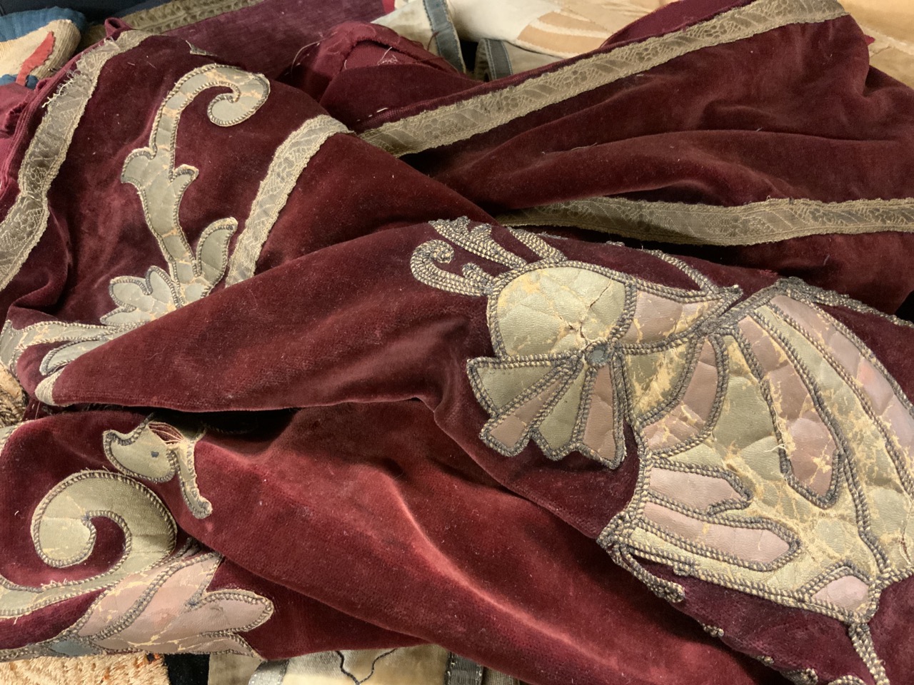 A compiled grouping of Egyptian revival panels, English tudor panels, velvet runner, embroidery work etc.