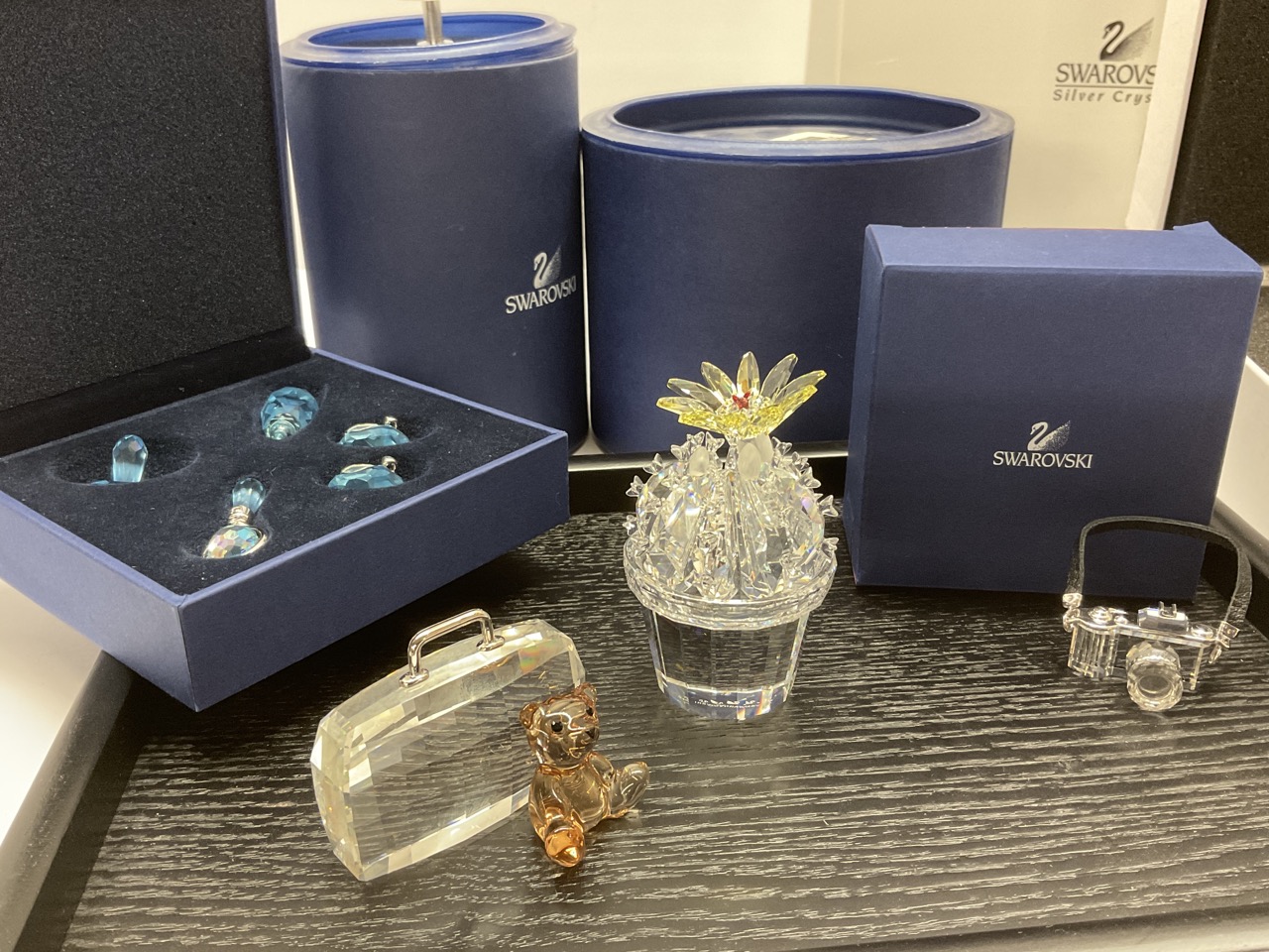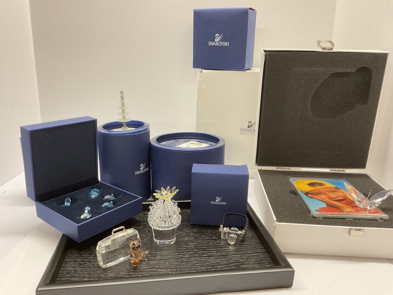 Collection Of Crystal Swarovski Flowering Cactus, Teddy Bear Suitcase, Baby Toys, Pictures Frame And SLR Camera.