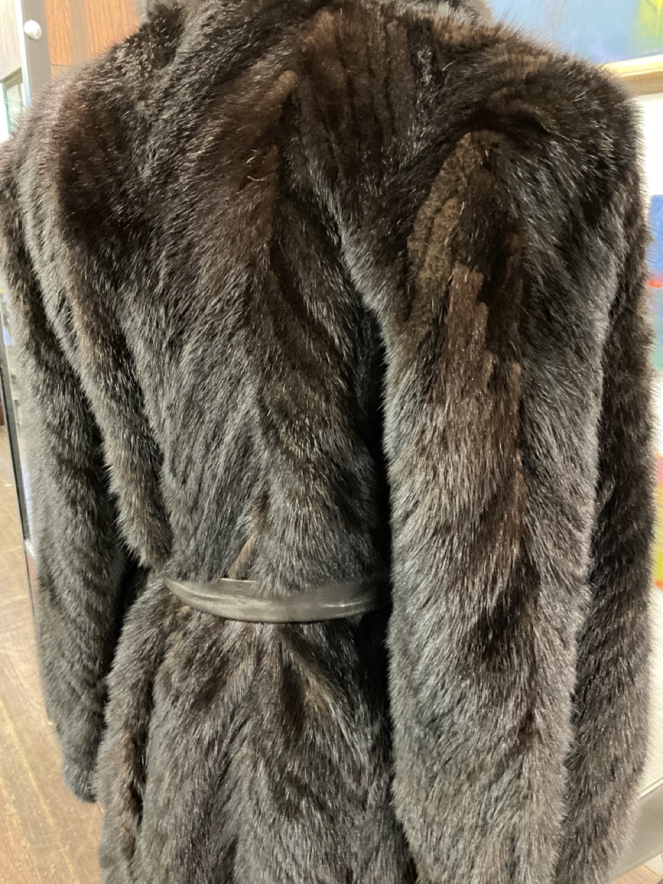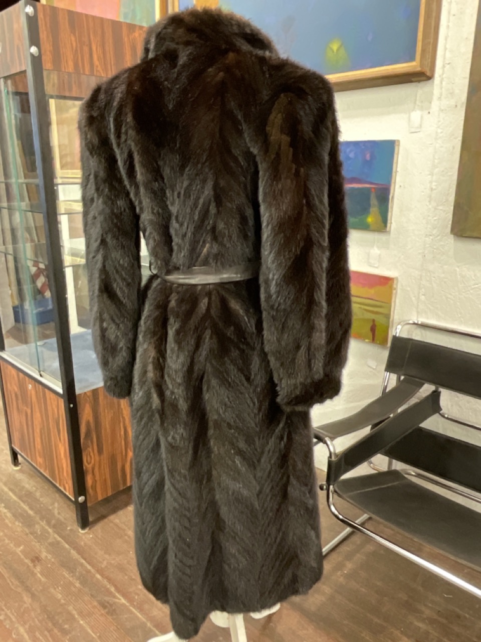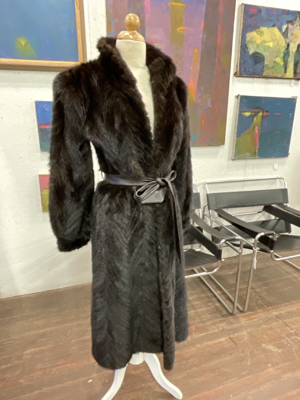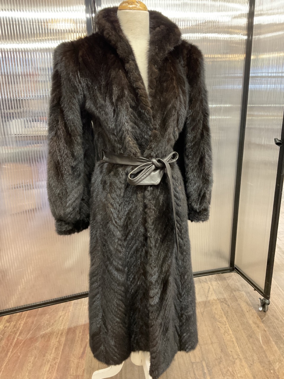 Vintage Chevron mink coat with leather belt. Fine condition.