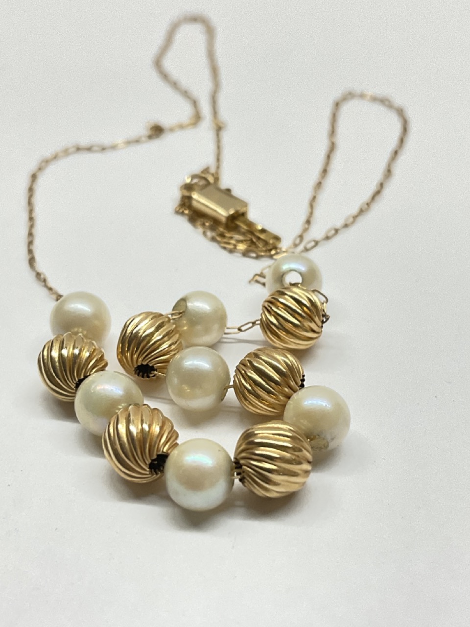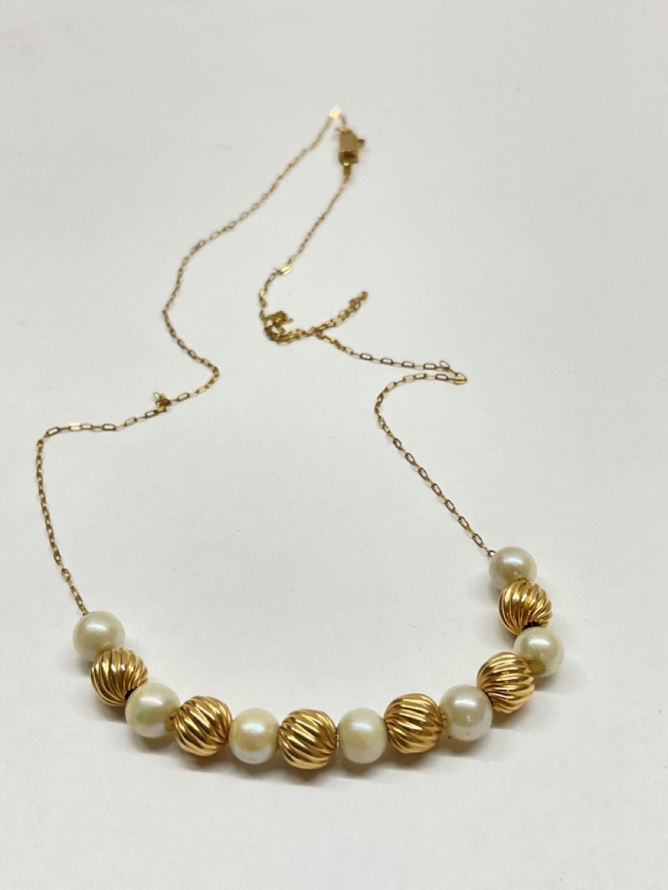 Dainty 14k yellow gold ball and pearl necklace.