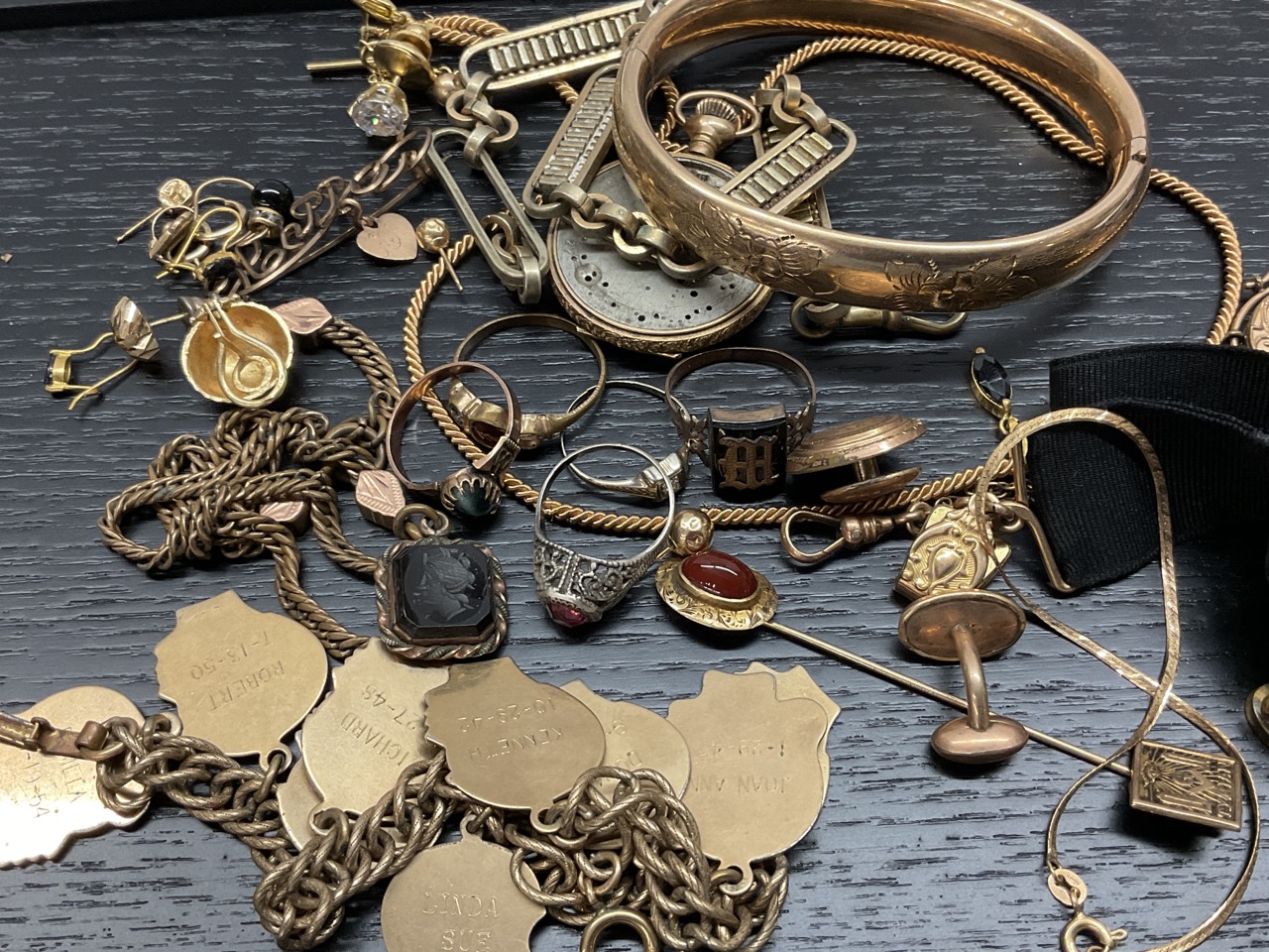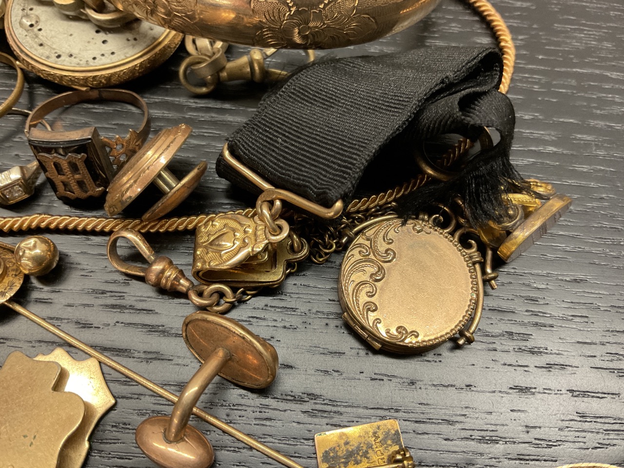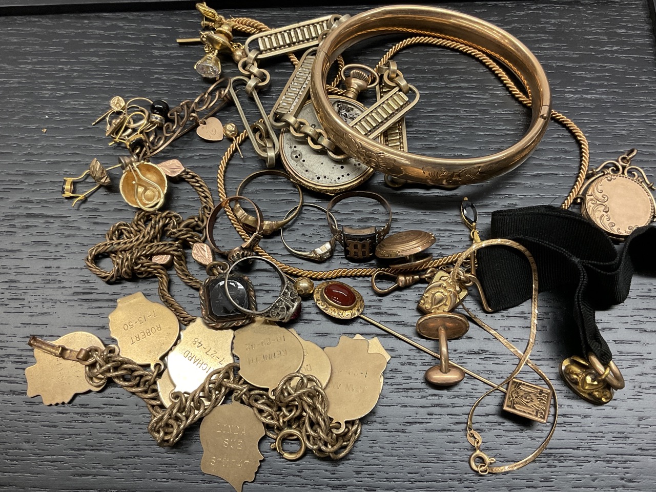 Estate Compiled Jewelry, Gold Filled, Gold, Watch Fobs Etc.. Gold filled charm bracelet, small 14K bracelet, pocket watch for parts, 10K pin and more