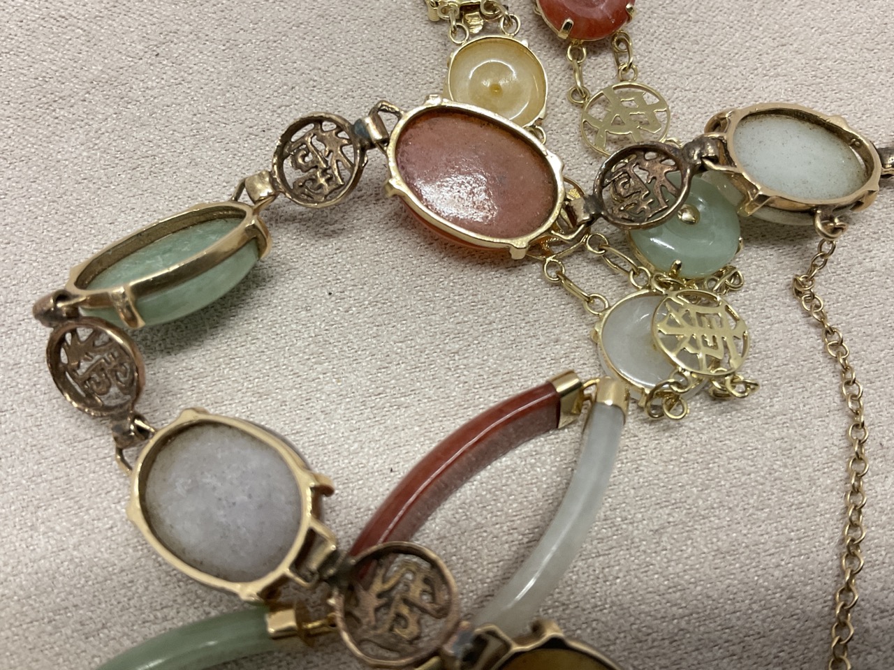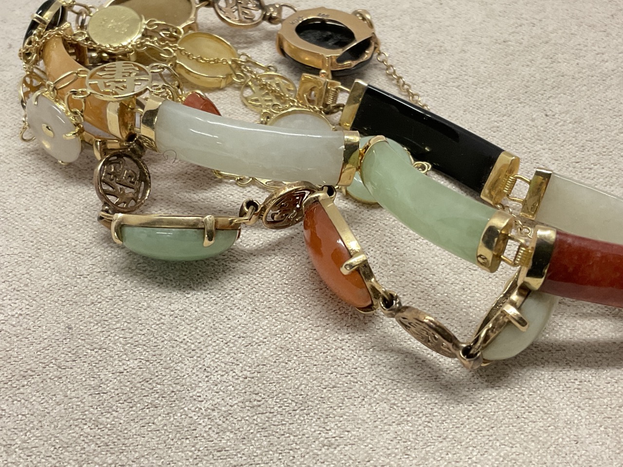 Three (3) 14K gold Chinese gemstone bracelets with filigree work, onyx, coral and jade.
