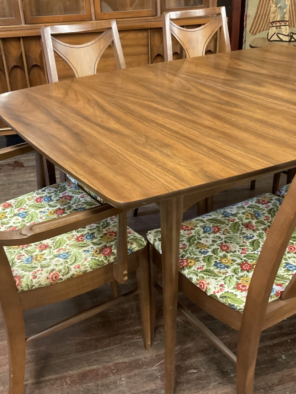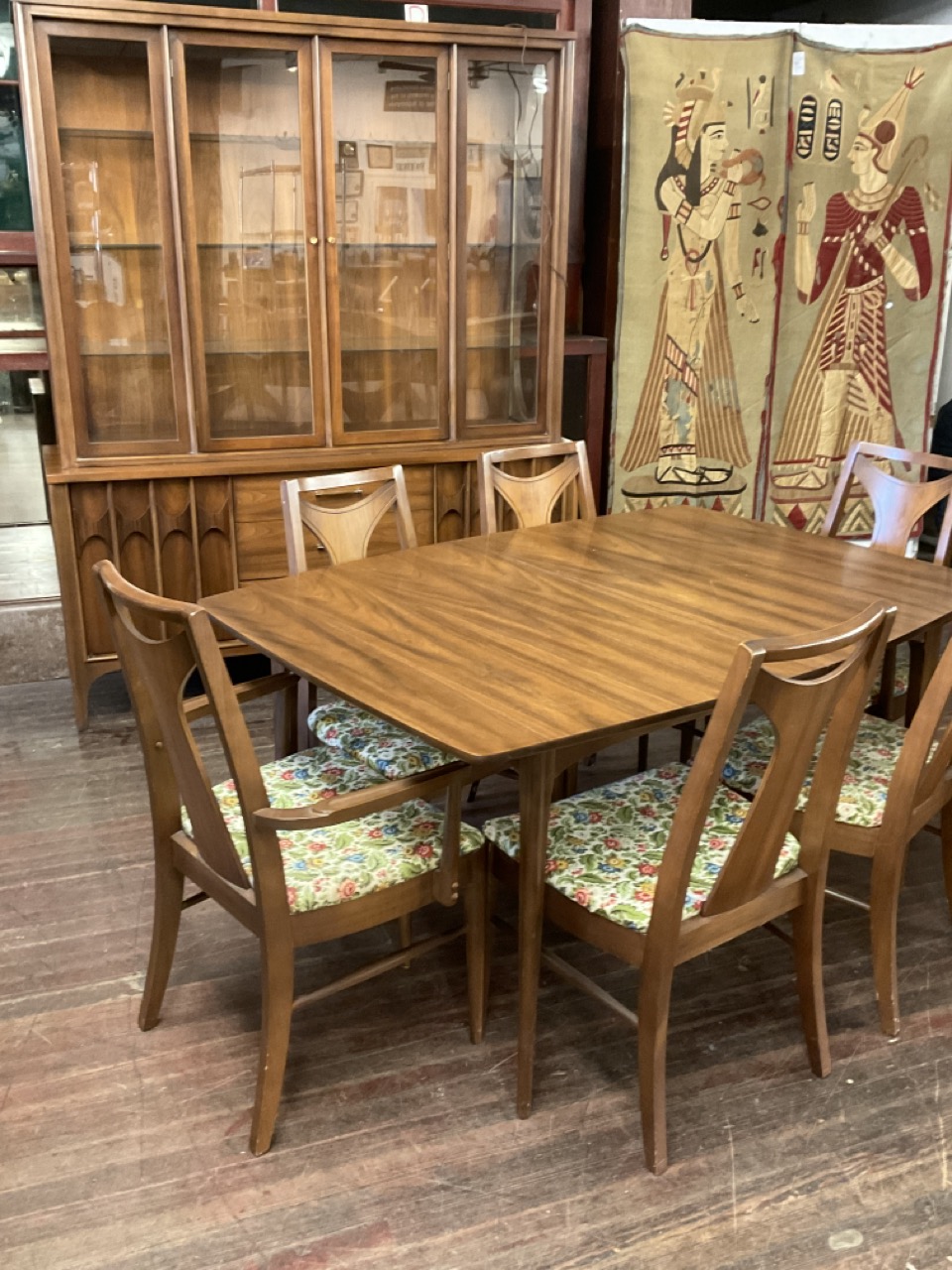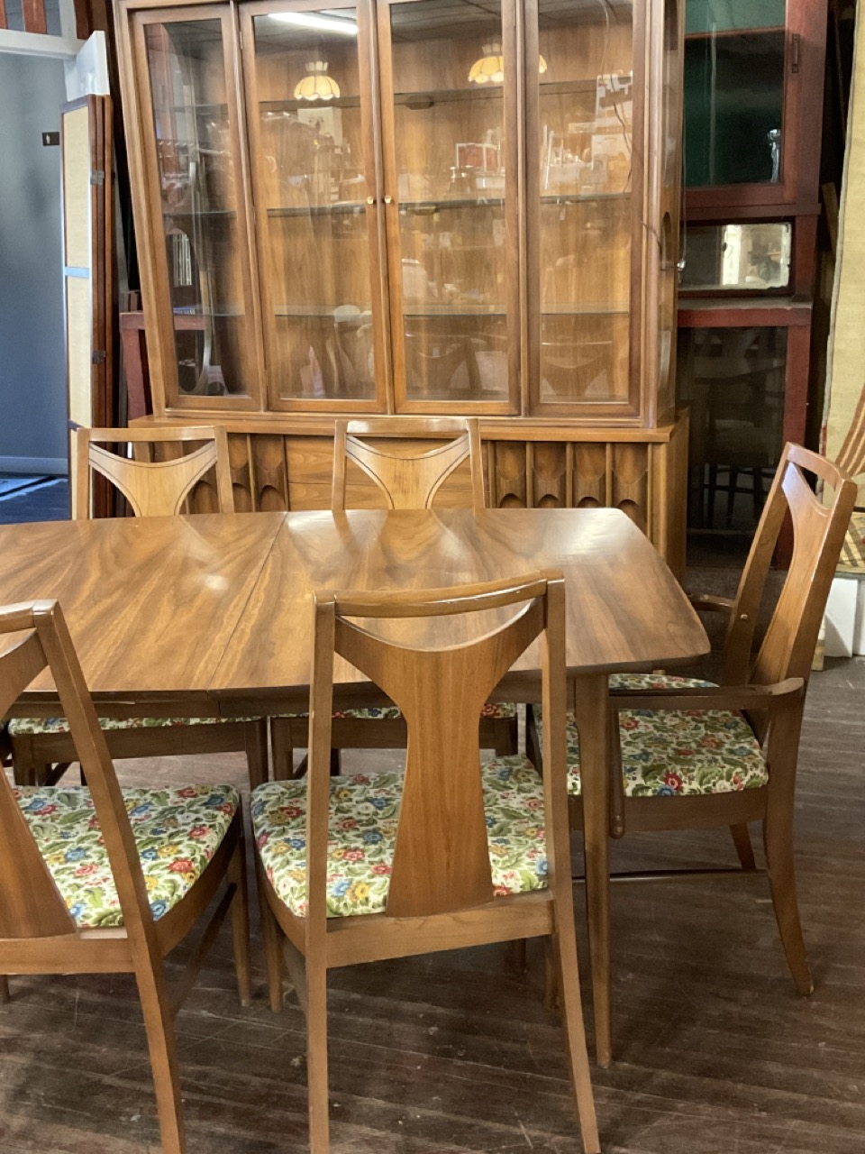 Dining Room table with one leaf original pads and six (6) chairs. Lighted breakfront hutch cabinet.