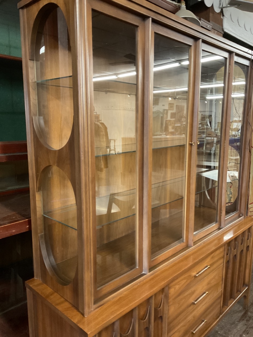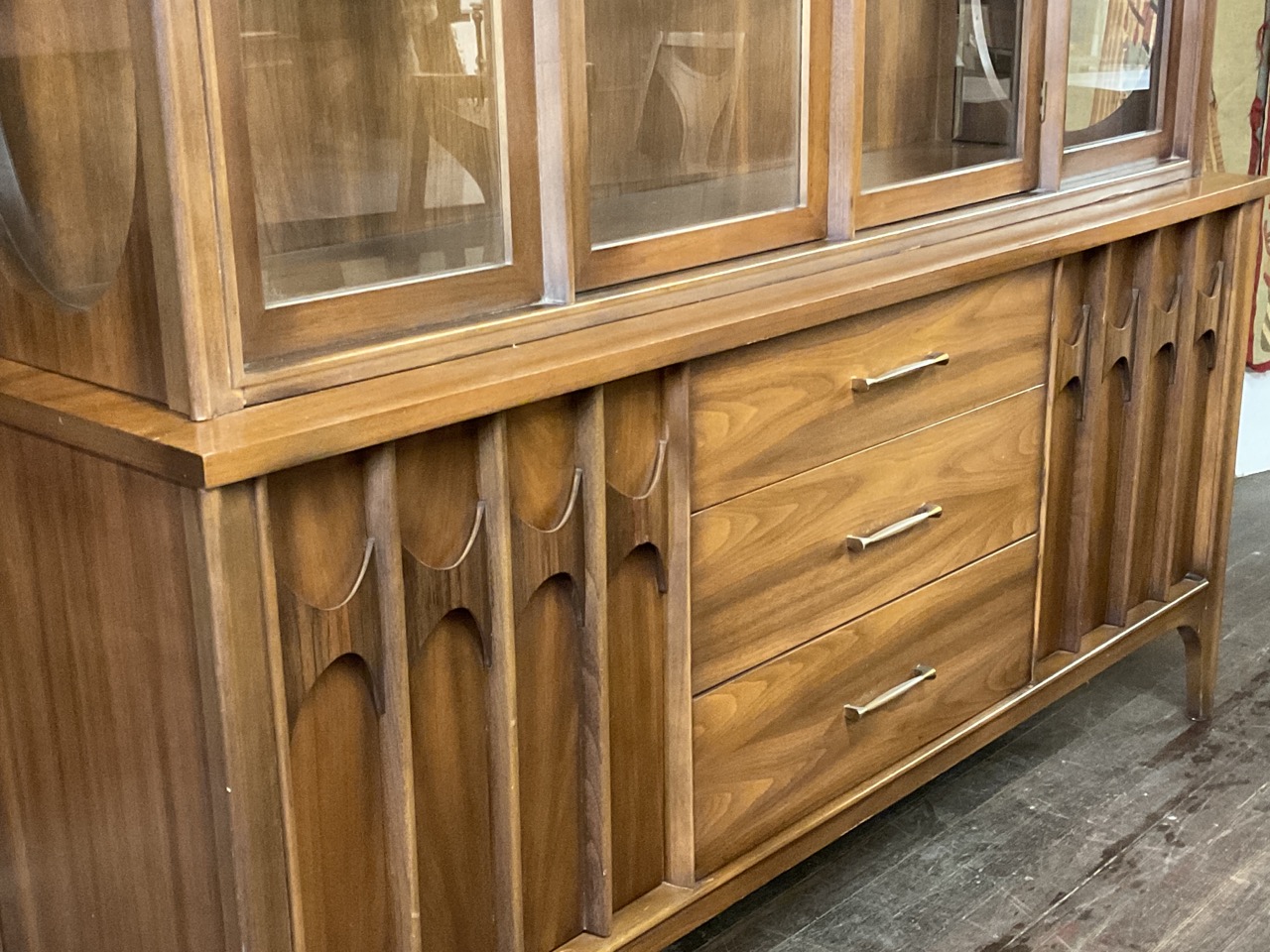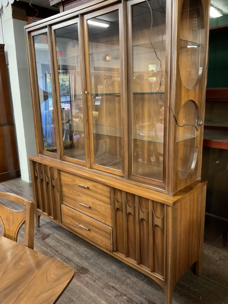 Dining Room table with one leaf original pads and six (6) chairs. Lighted breakfront hutch cabinet.