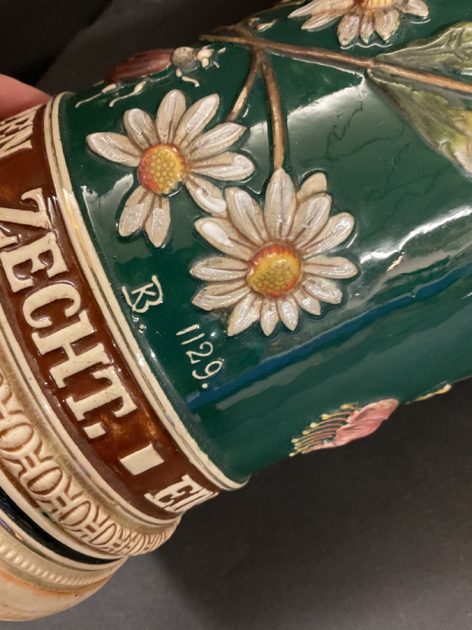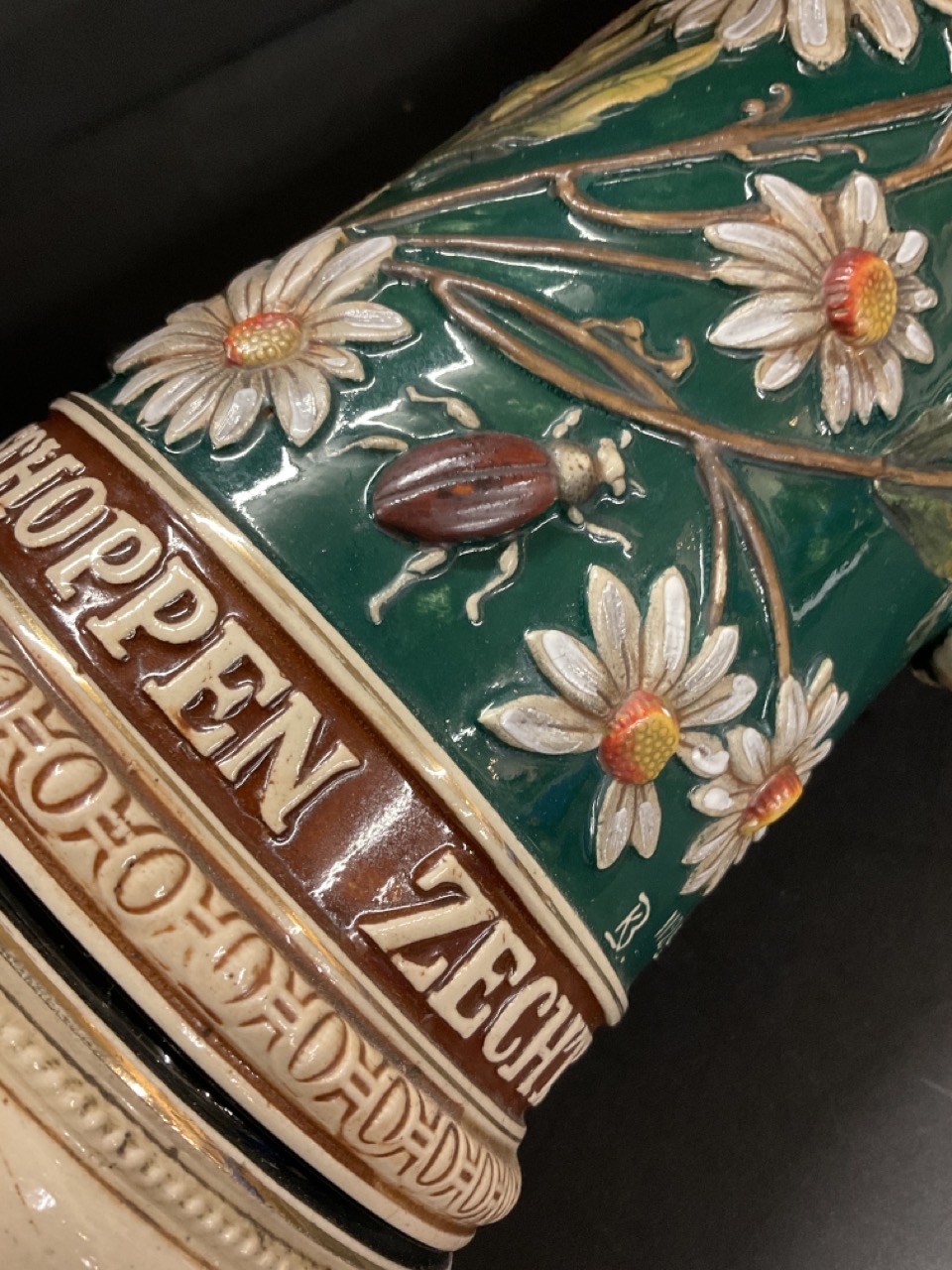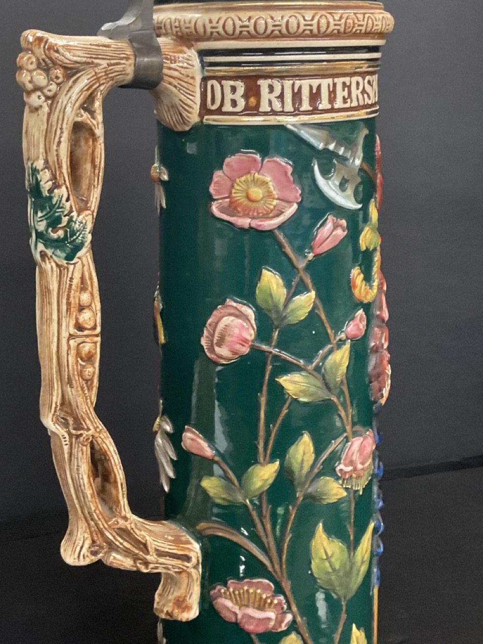 A large antique German tankard. Signed at side and base marked Made in Germany. High relief.