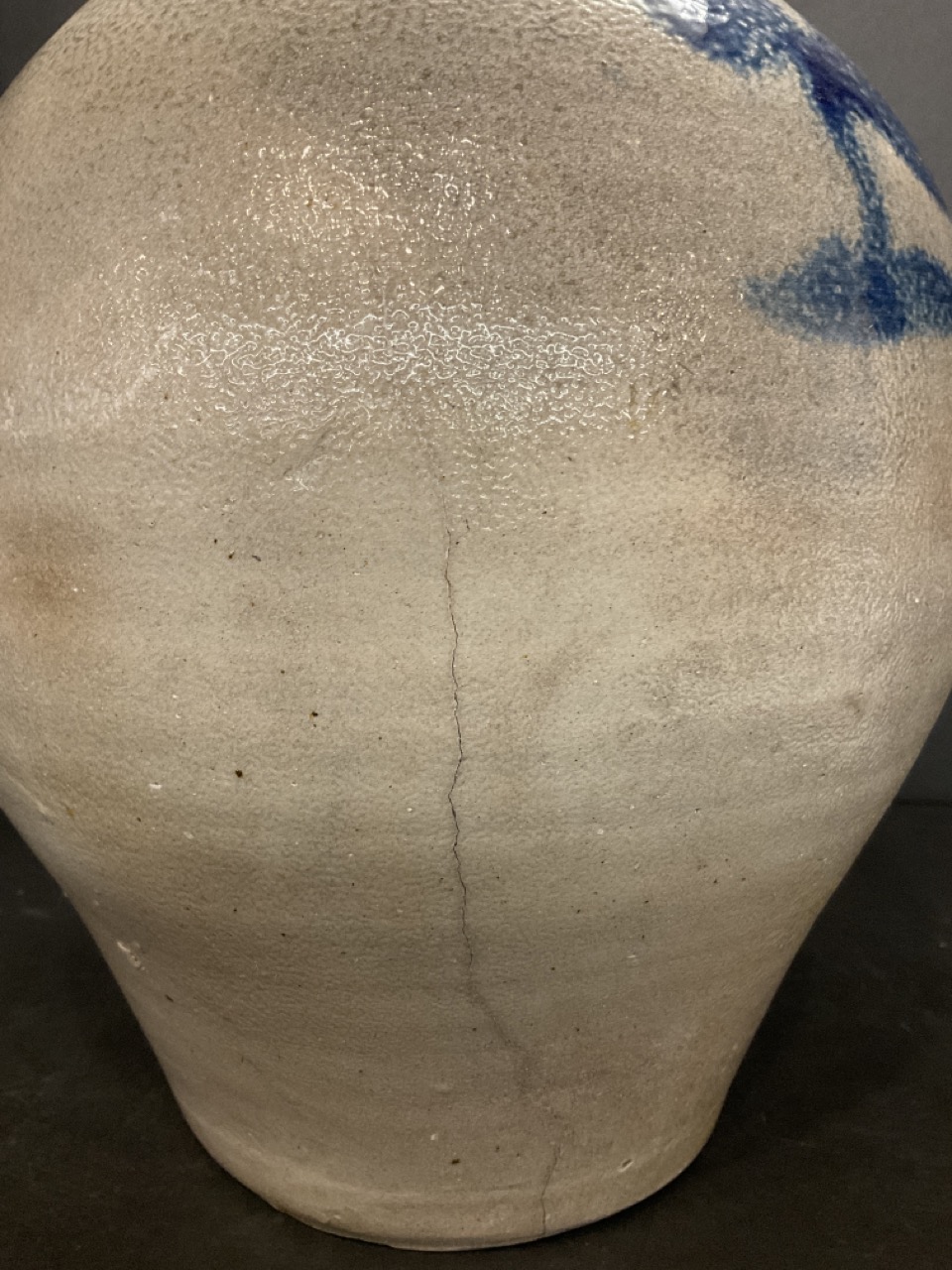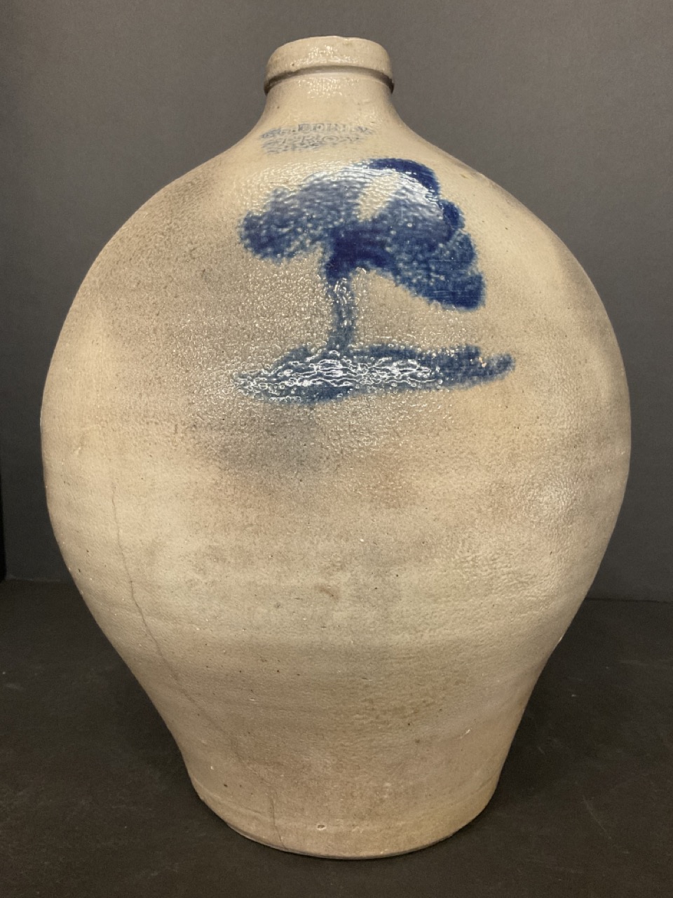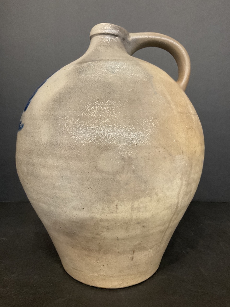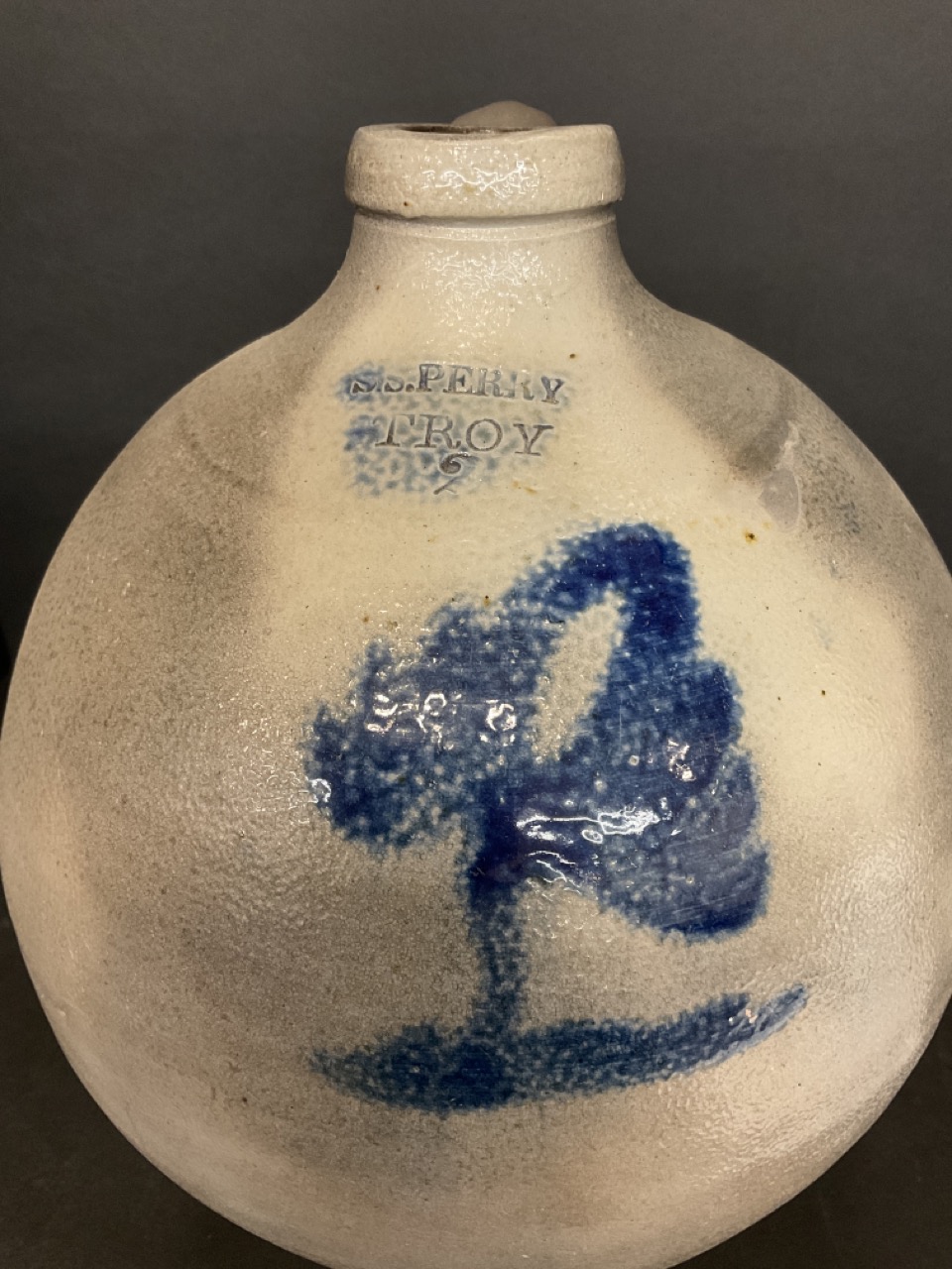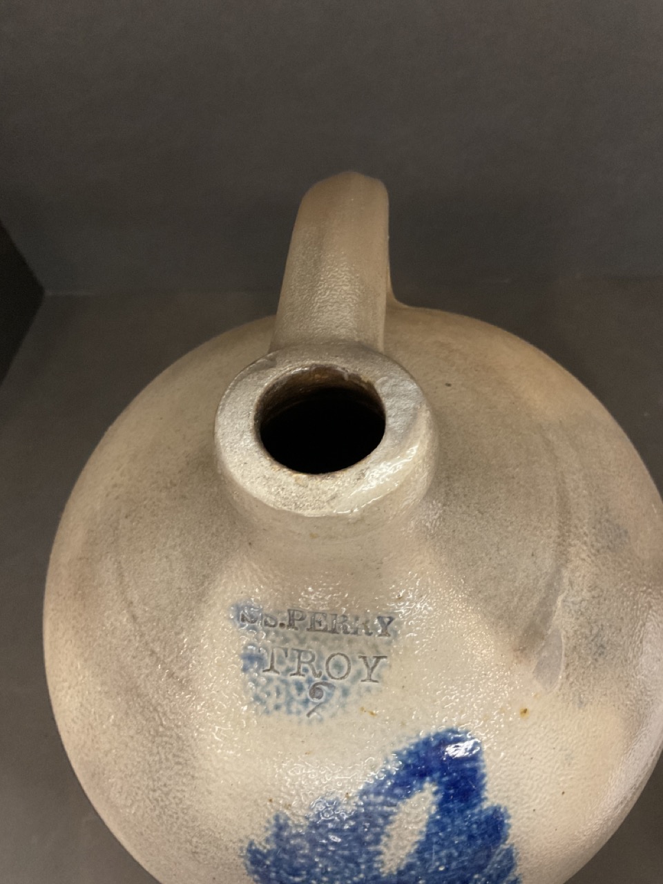 S.S. Perry, Troy, New York 2 Gallon jug with cobalt blue flower decoration.