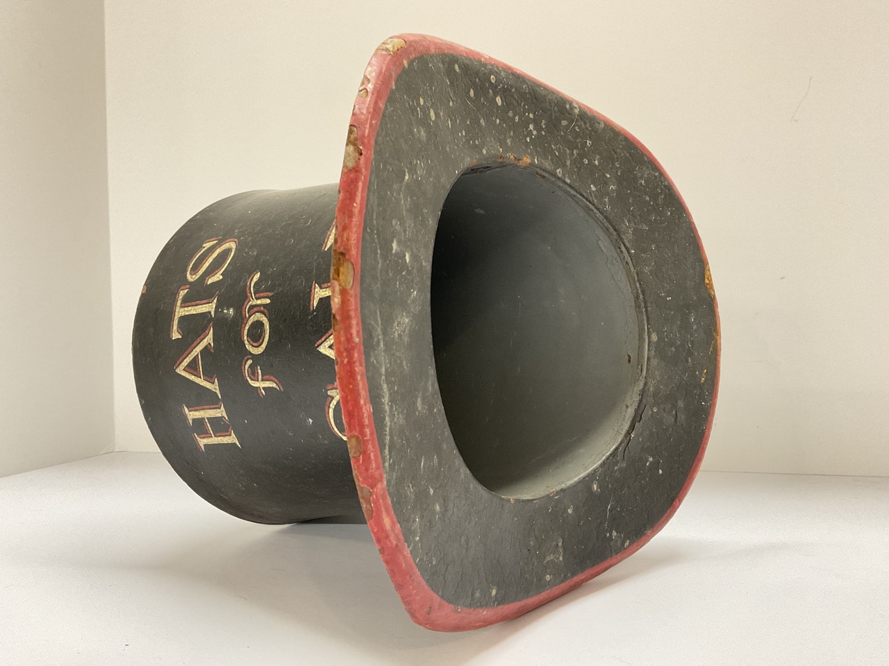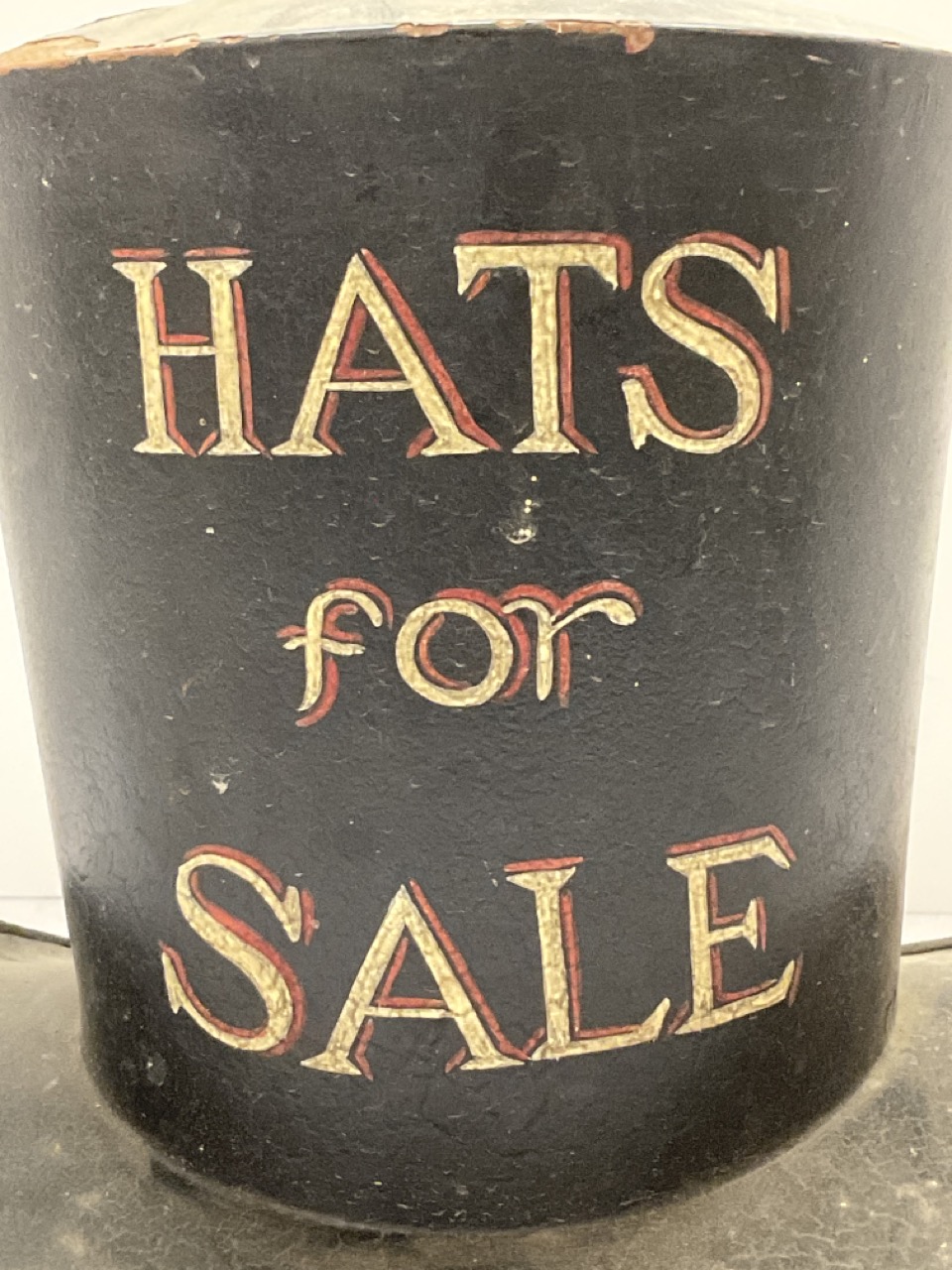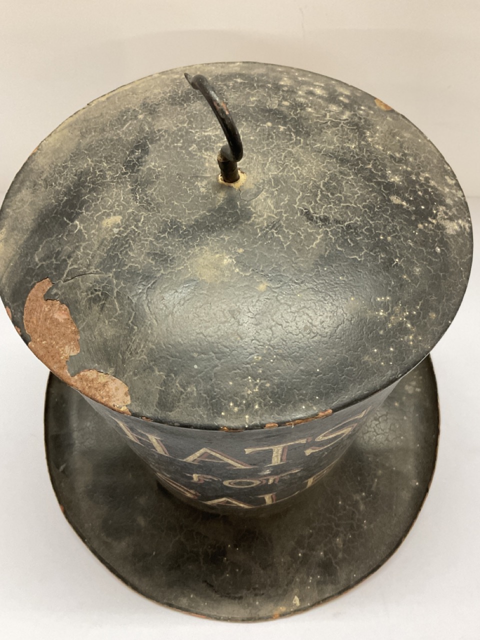 A rare 19th century trade sign. Reads "Hats For Sale" in the form of a top hat. Painted metal.