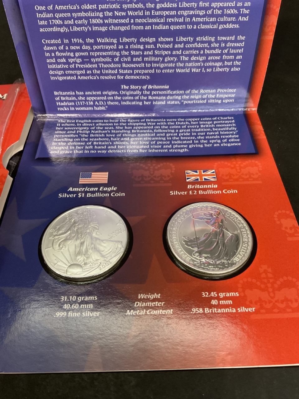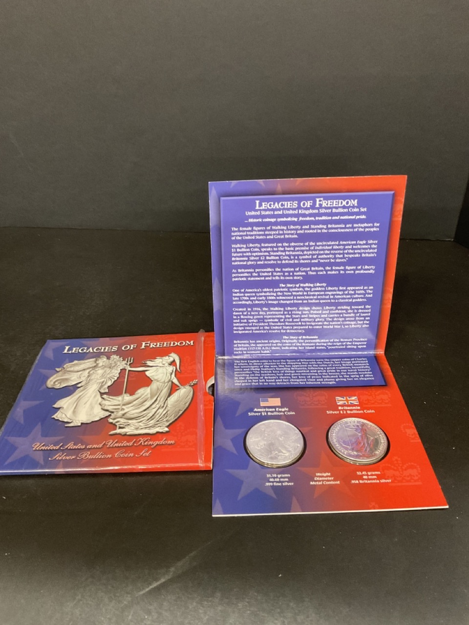 Legacies of Freedom U.S. And U.K. Silver Bullion Coin Sets. Two (2) one ounce silver coins.