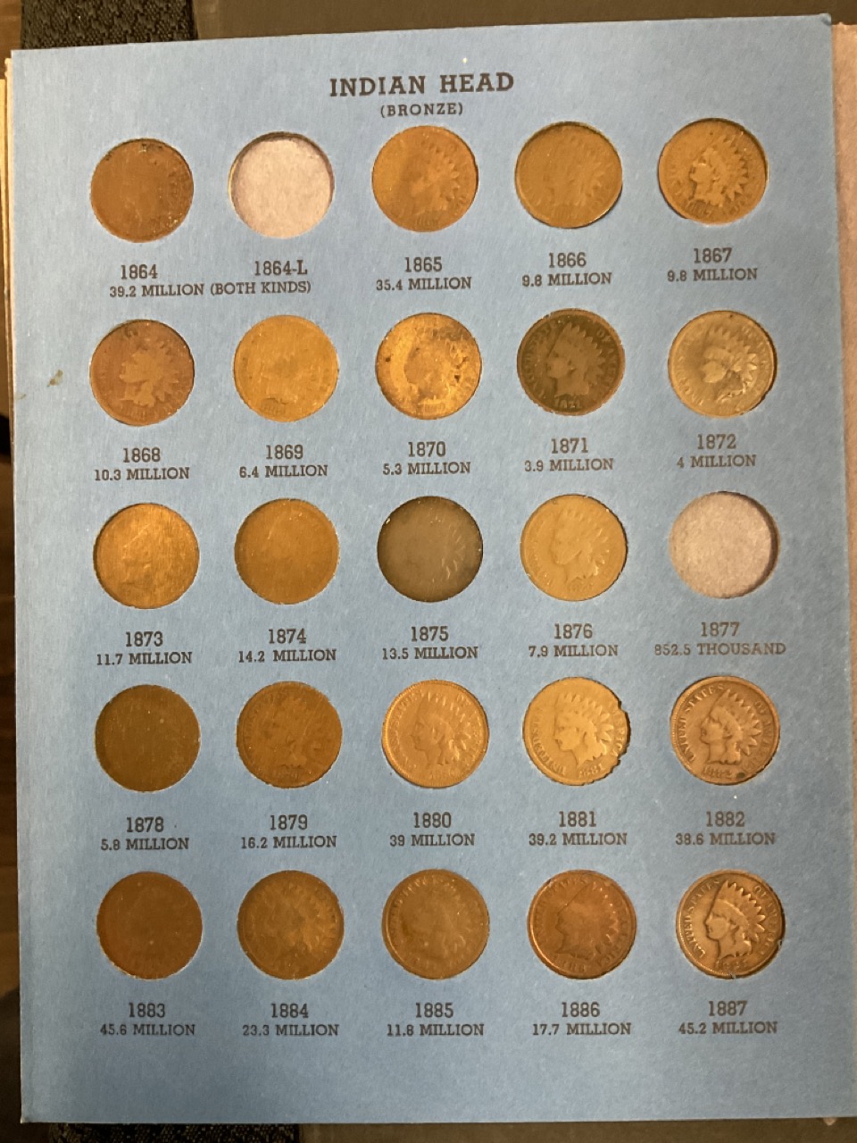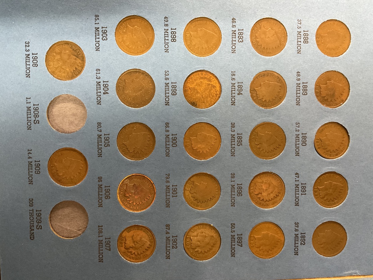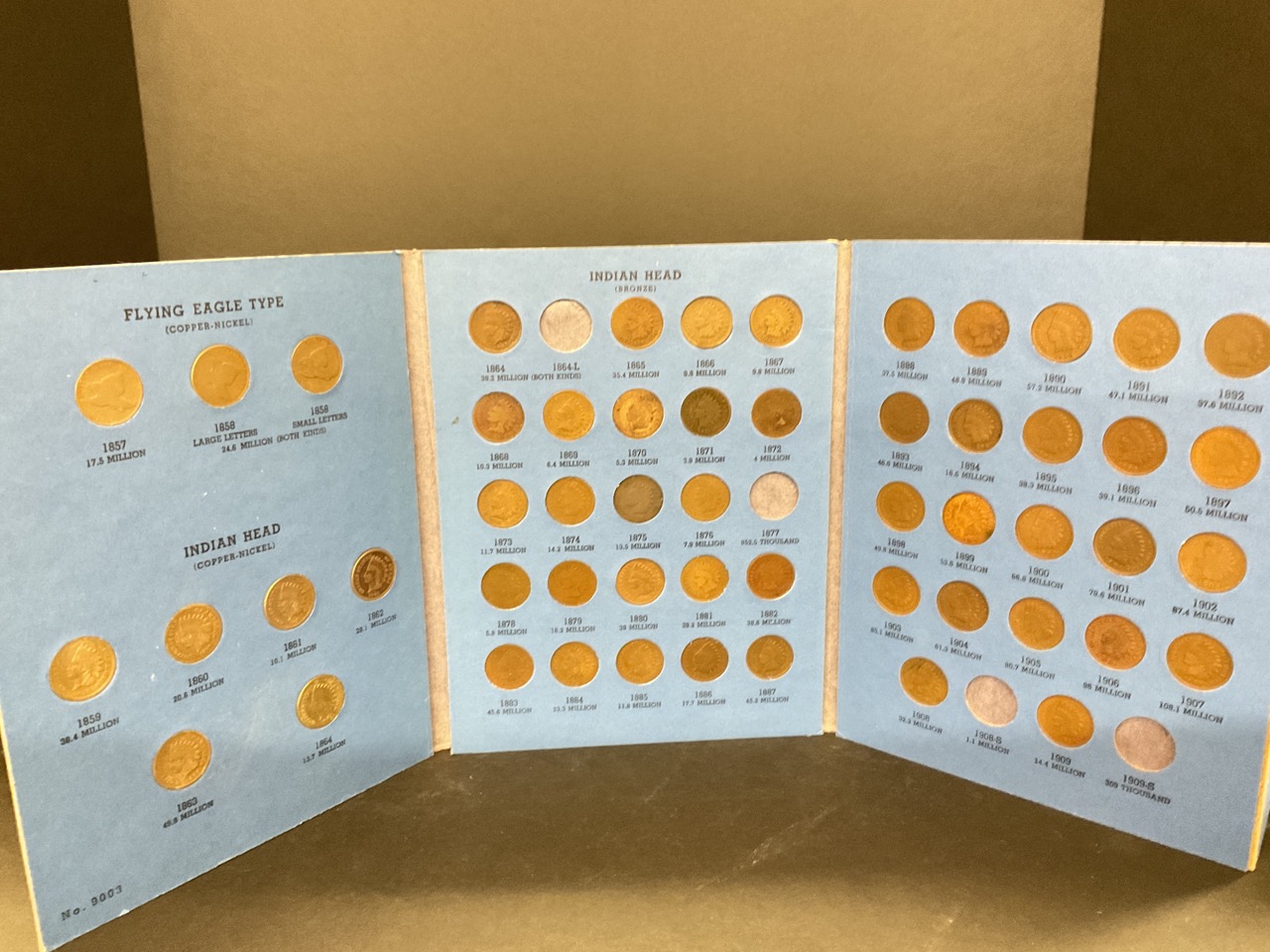 Whitman Album Containing Indian Head Cents. Three flying eagle cents, All Indians present excluding 64L, 77, 08S and 09S.