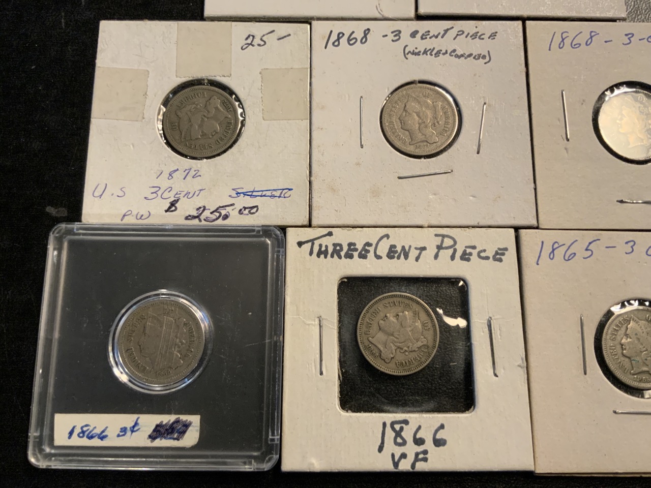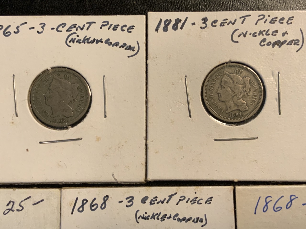 Eight (8) 3 Cent Nickels (2) 1865, (2) 1866, (2) 1868, 1872 & 1881