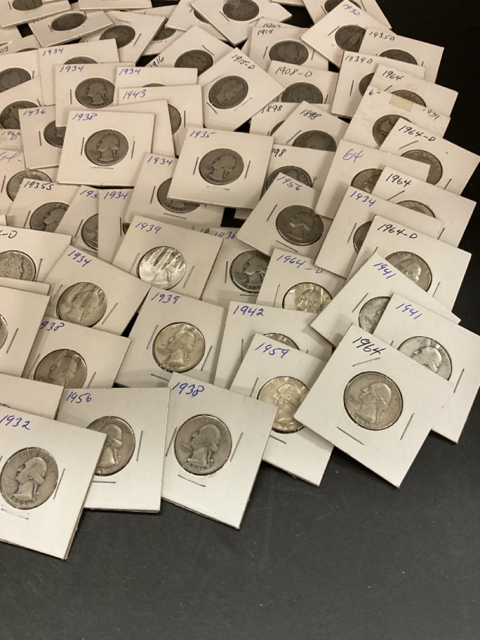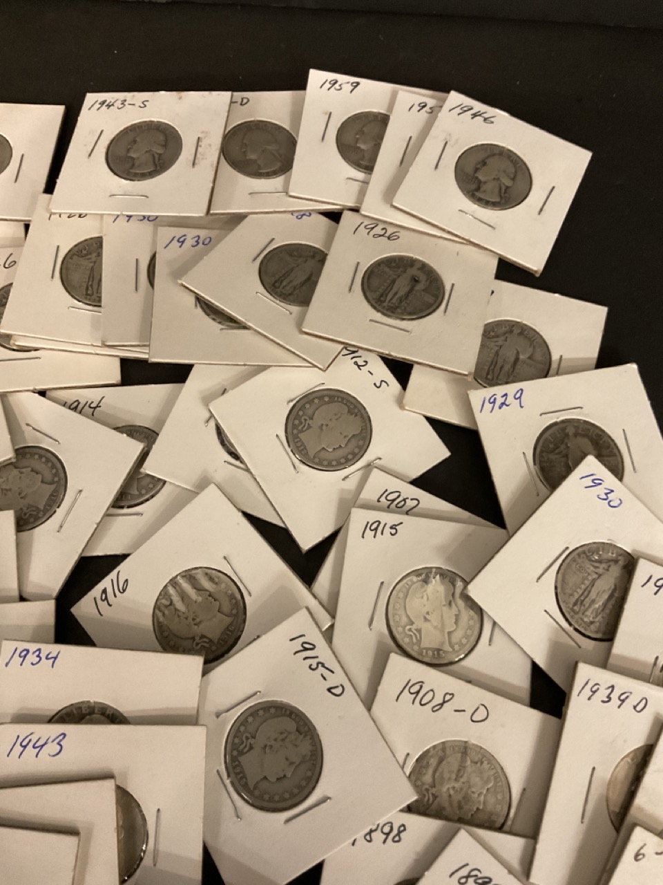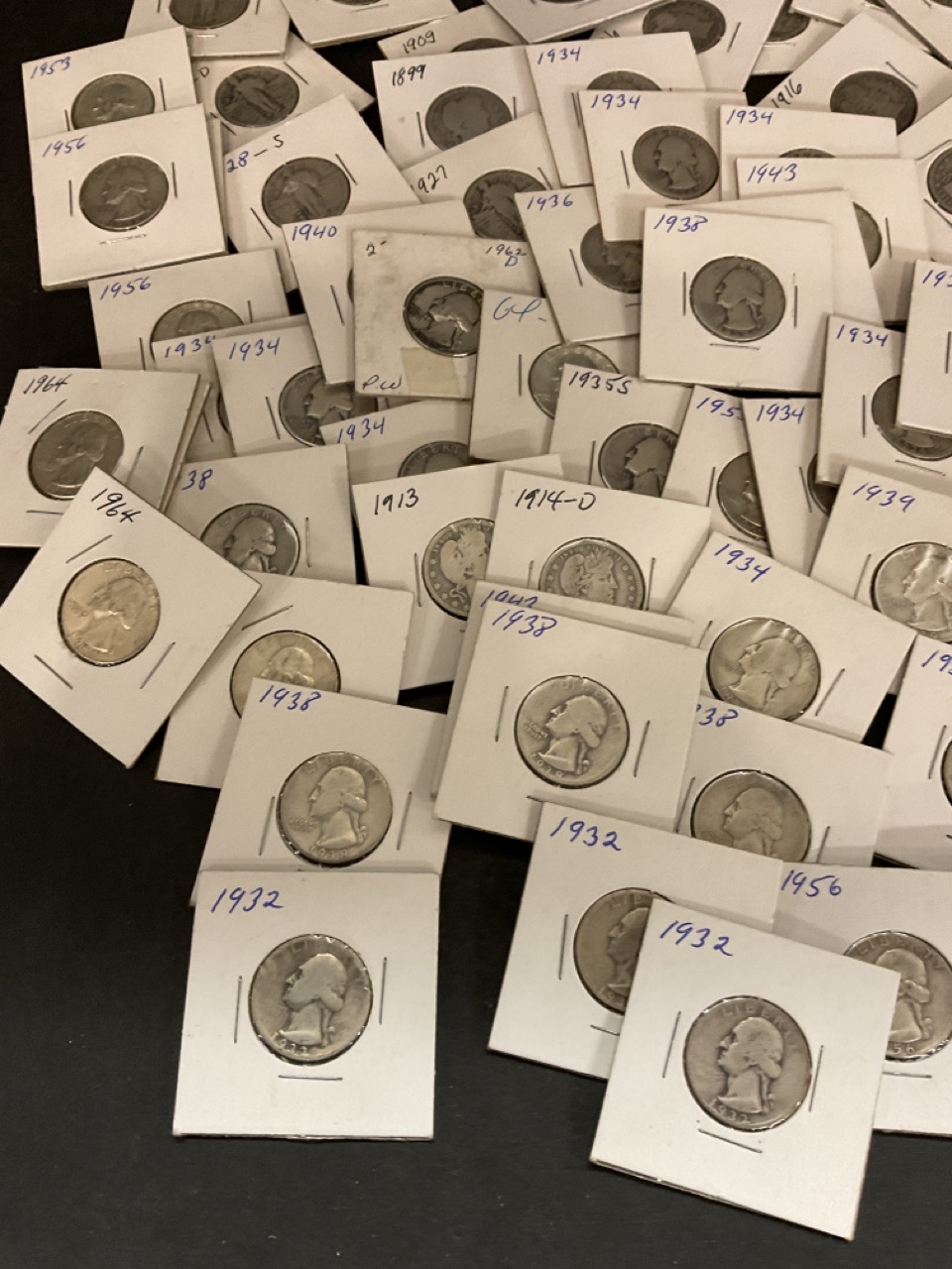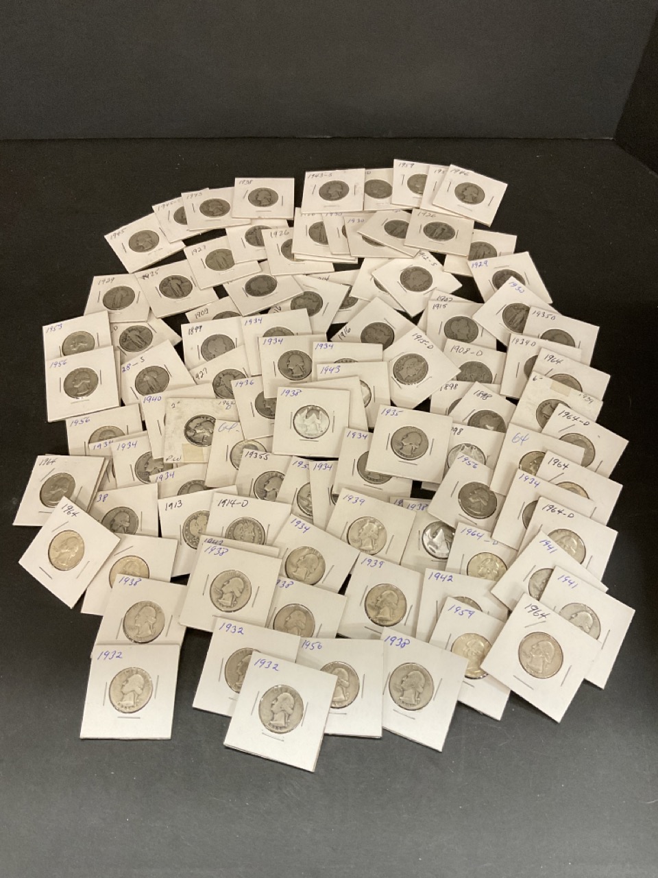 Lot Of 100 Carded 90% Silver Quarters. Barber, Washington and Standing Liberty.