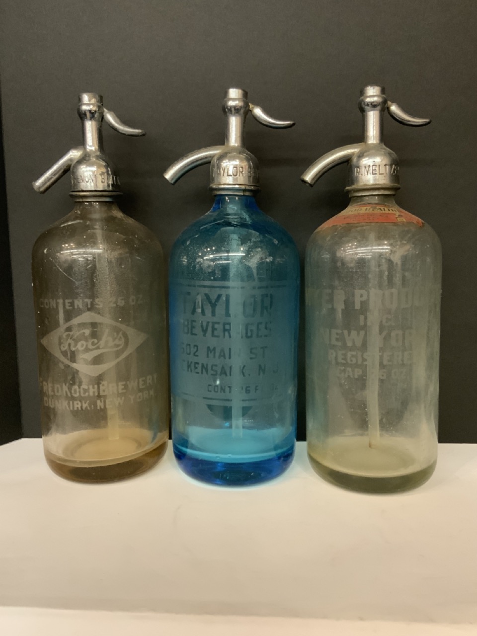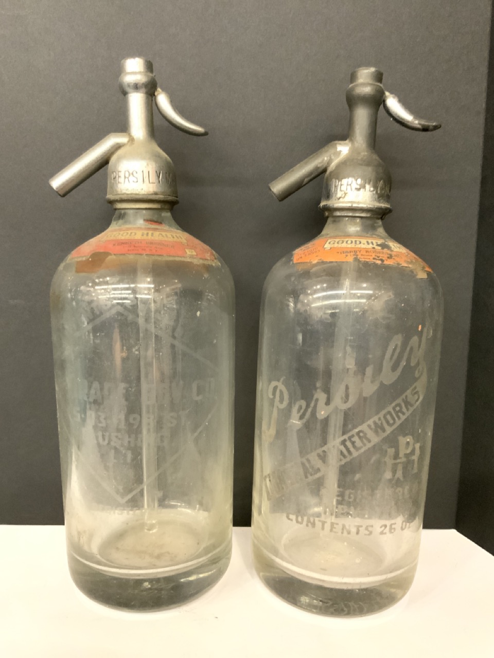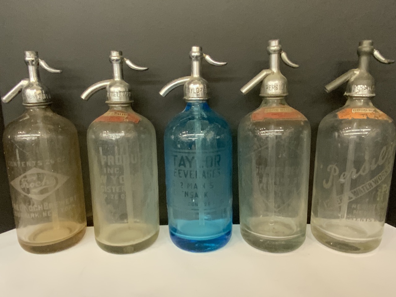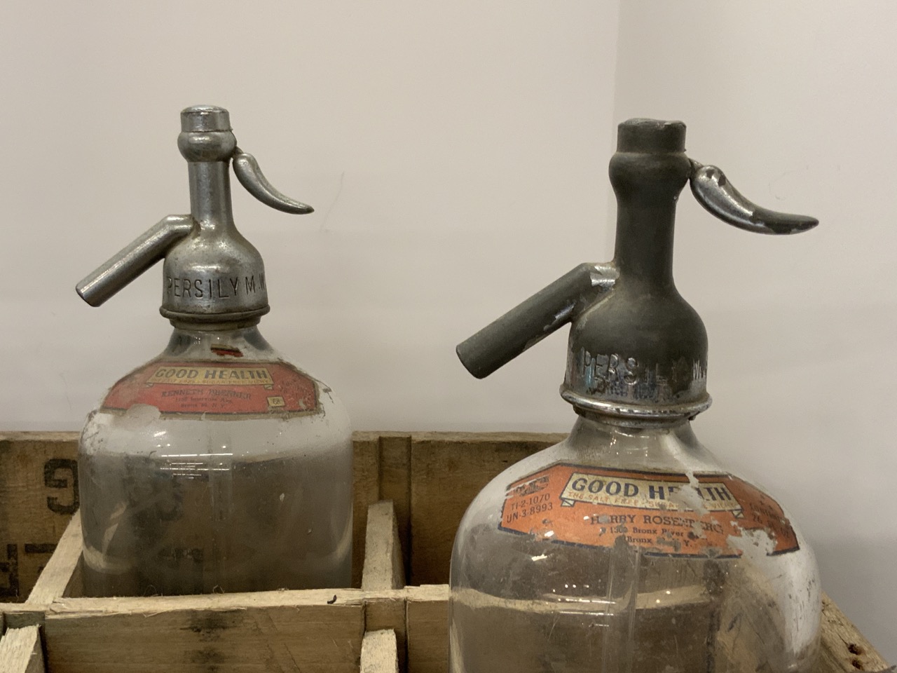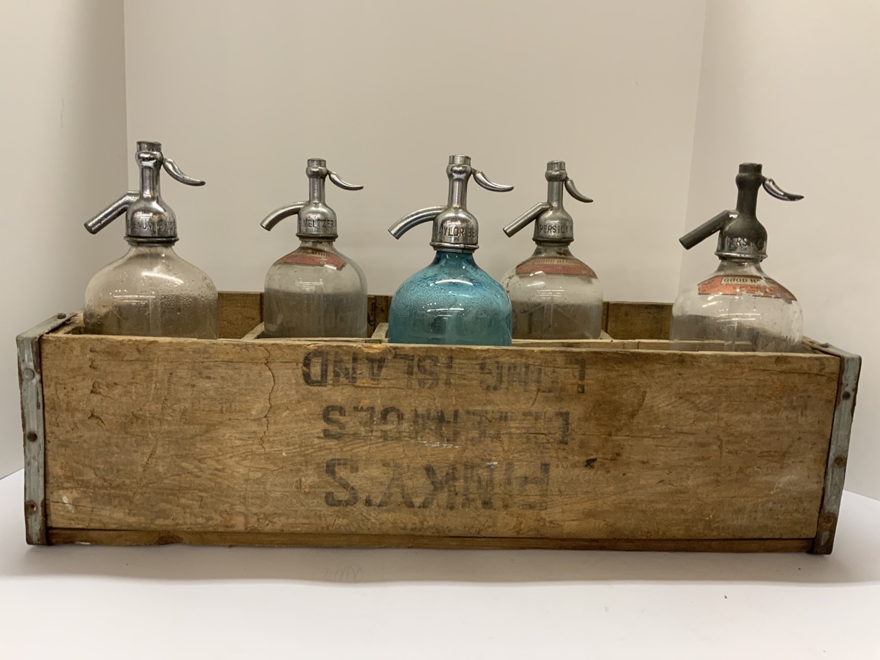 Vintage Seltzer Bottles in Wooden Advertising Crate