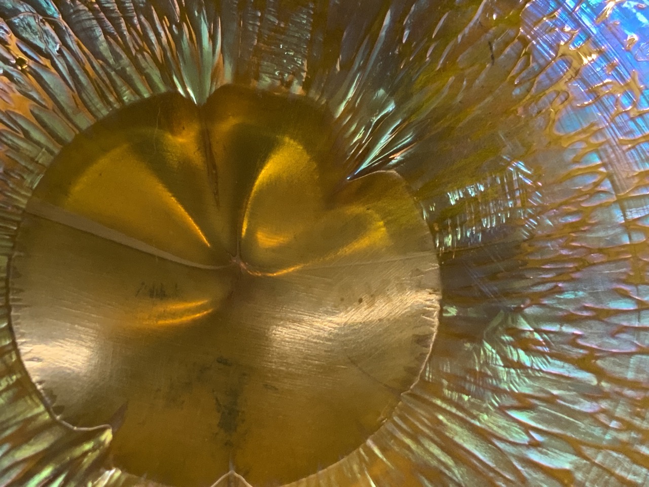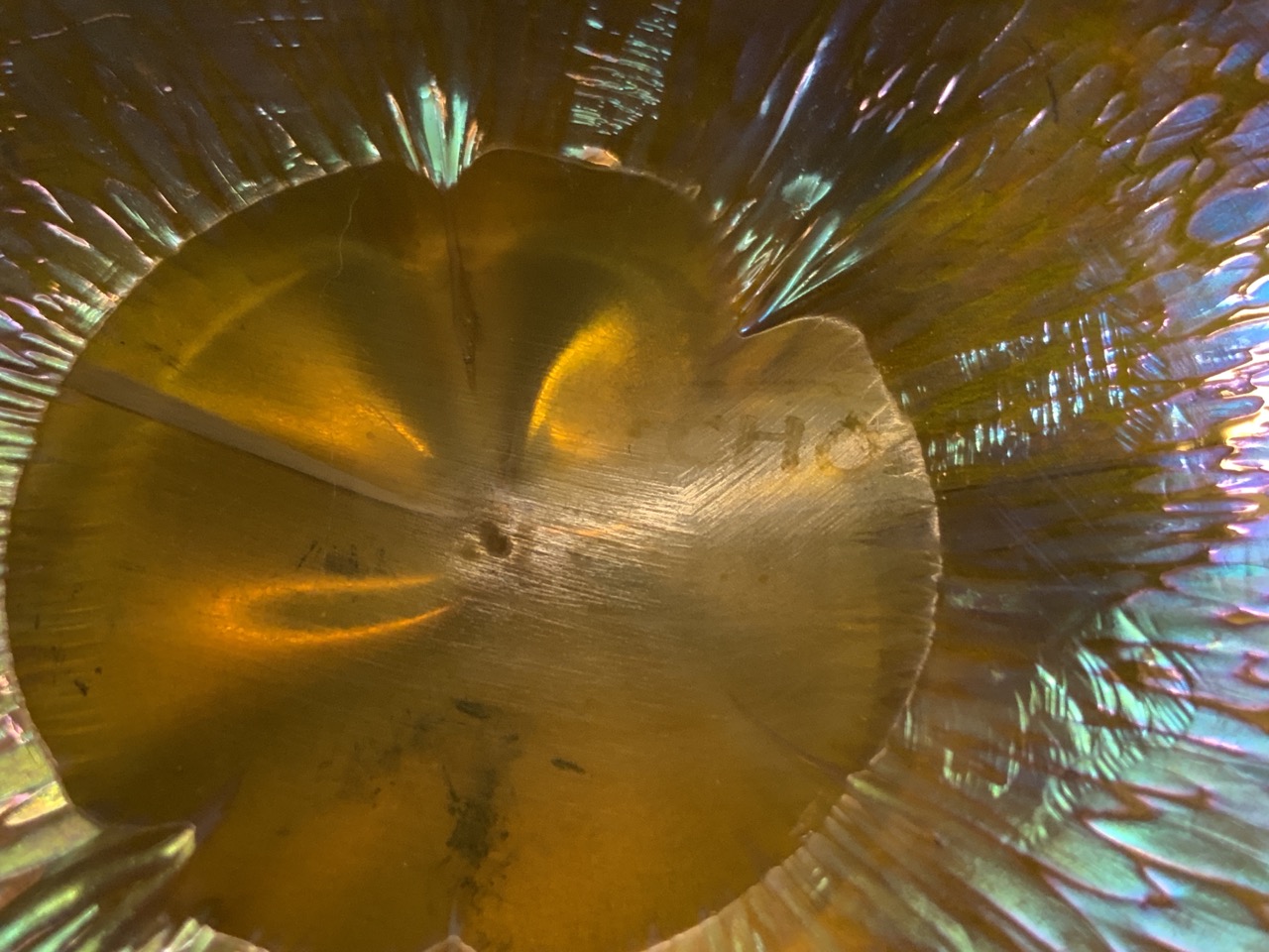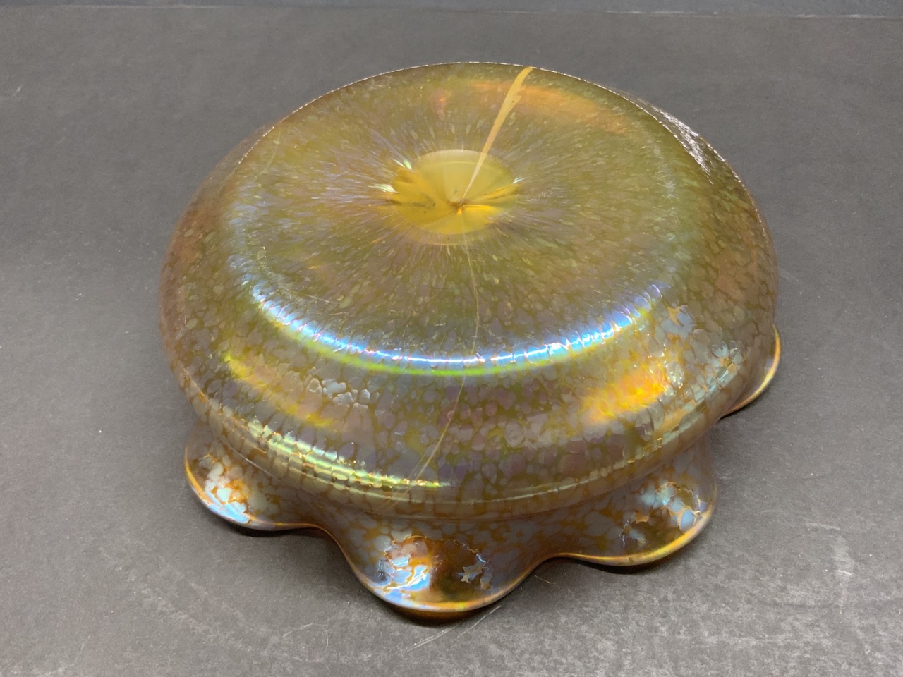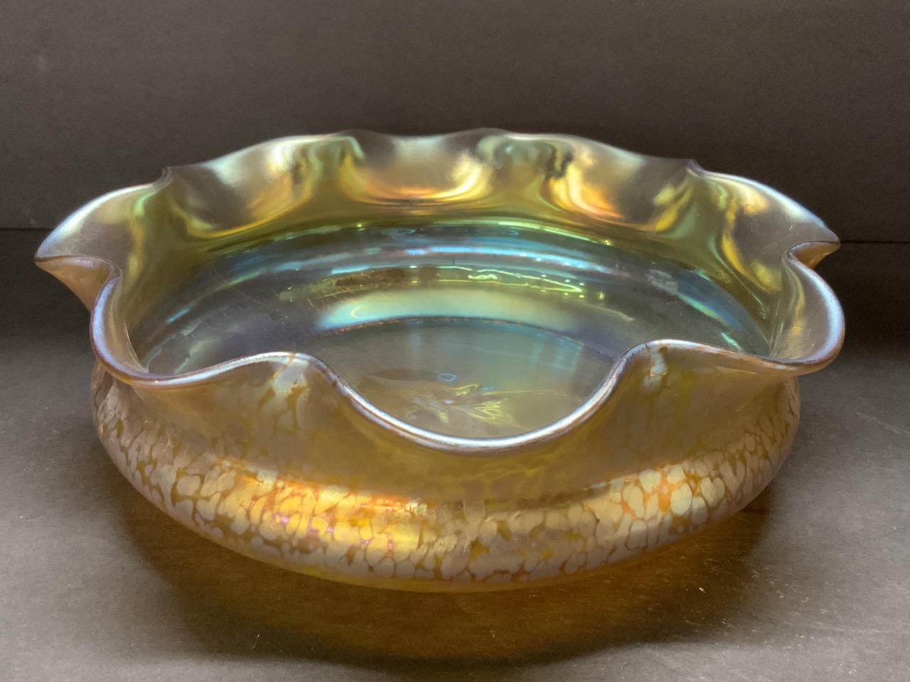 Signed Czeoslovakia art glass bowl with crimped edge.