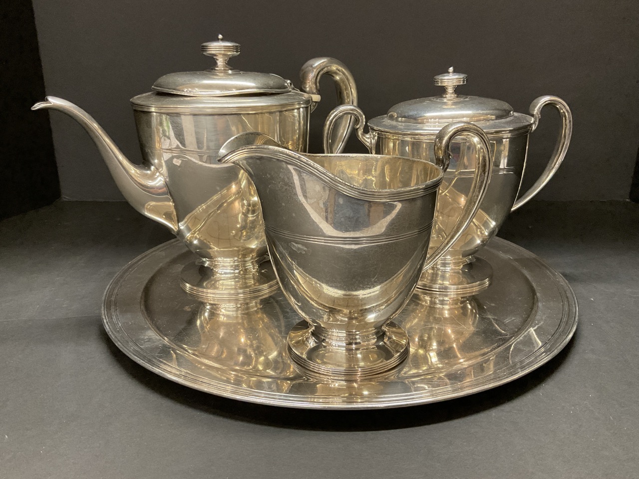 Tiffany & Co. Sterling Silver Makers Tea Set. Teapot, sugar and creamer set on top of a round serving tray.