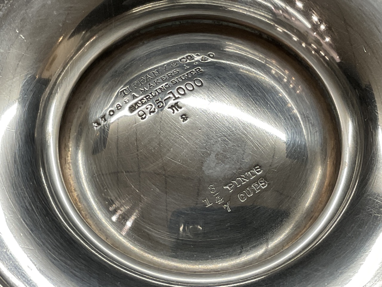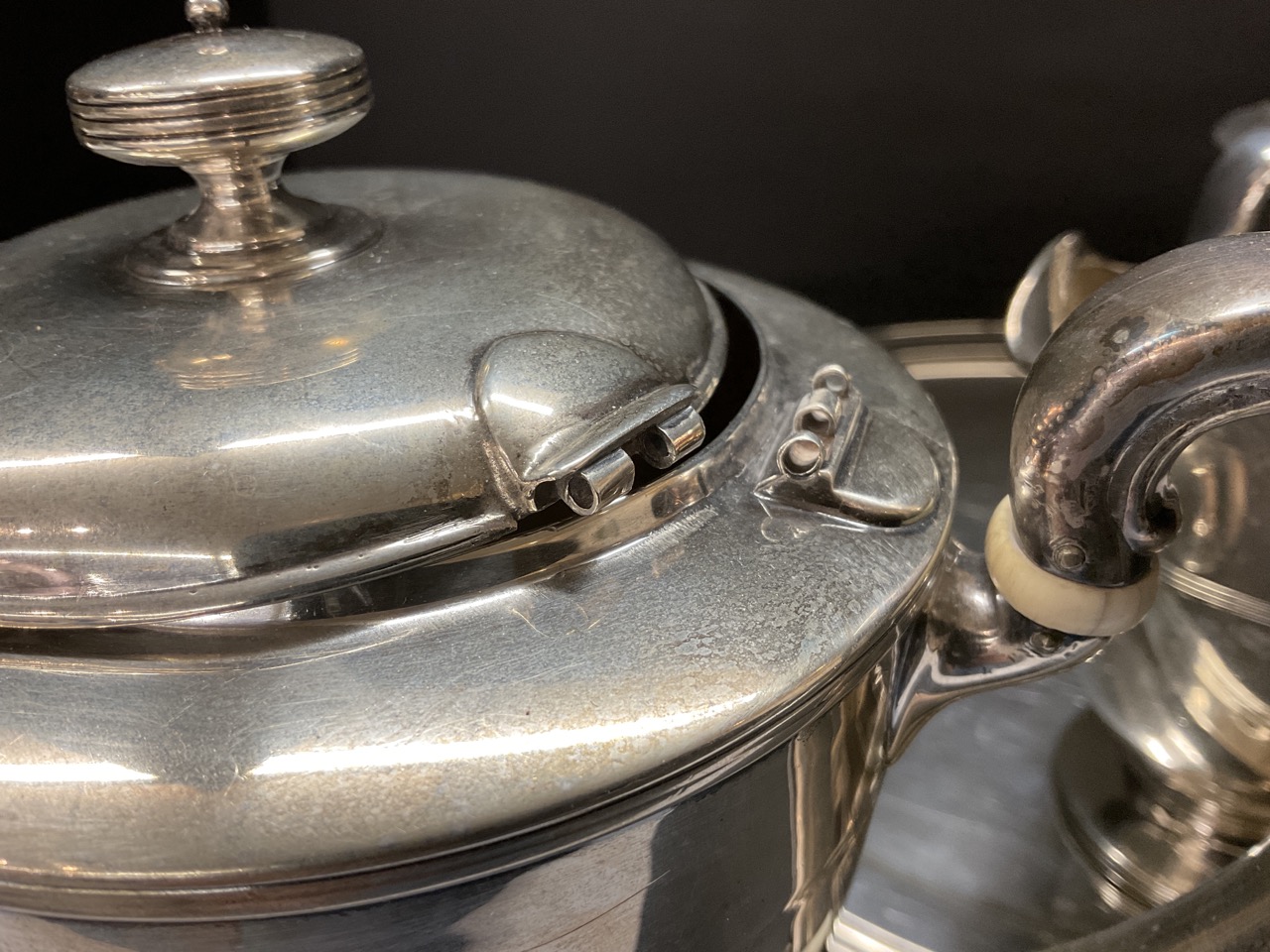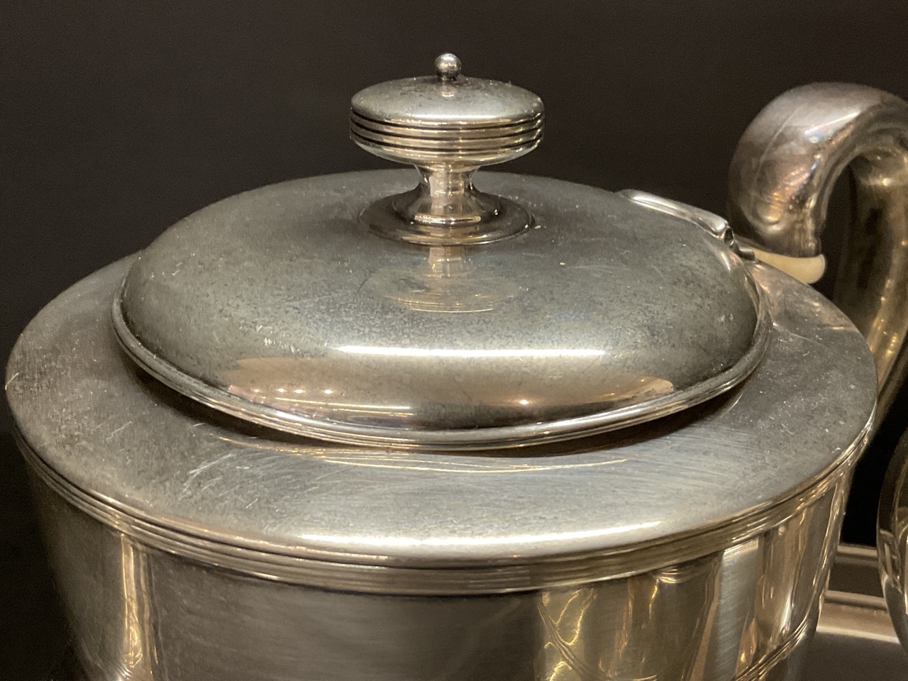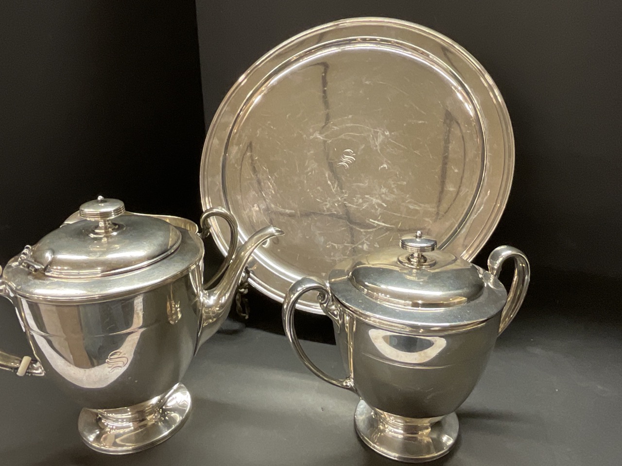Condition: teapot lid needs repair, slightly dented and hinge broken. Scratching throughout and monogrammed S in cursive.