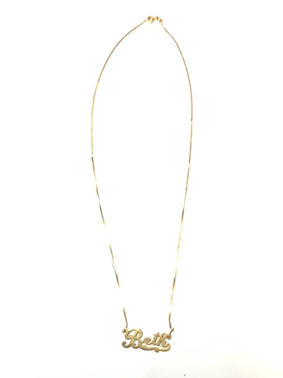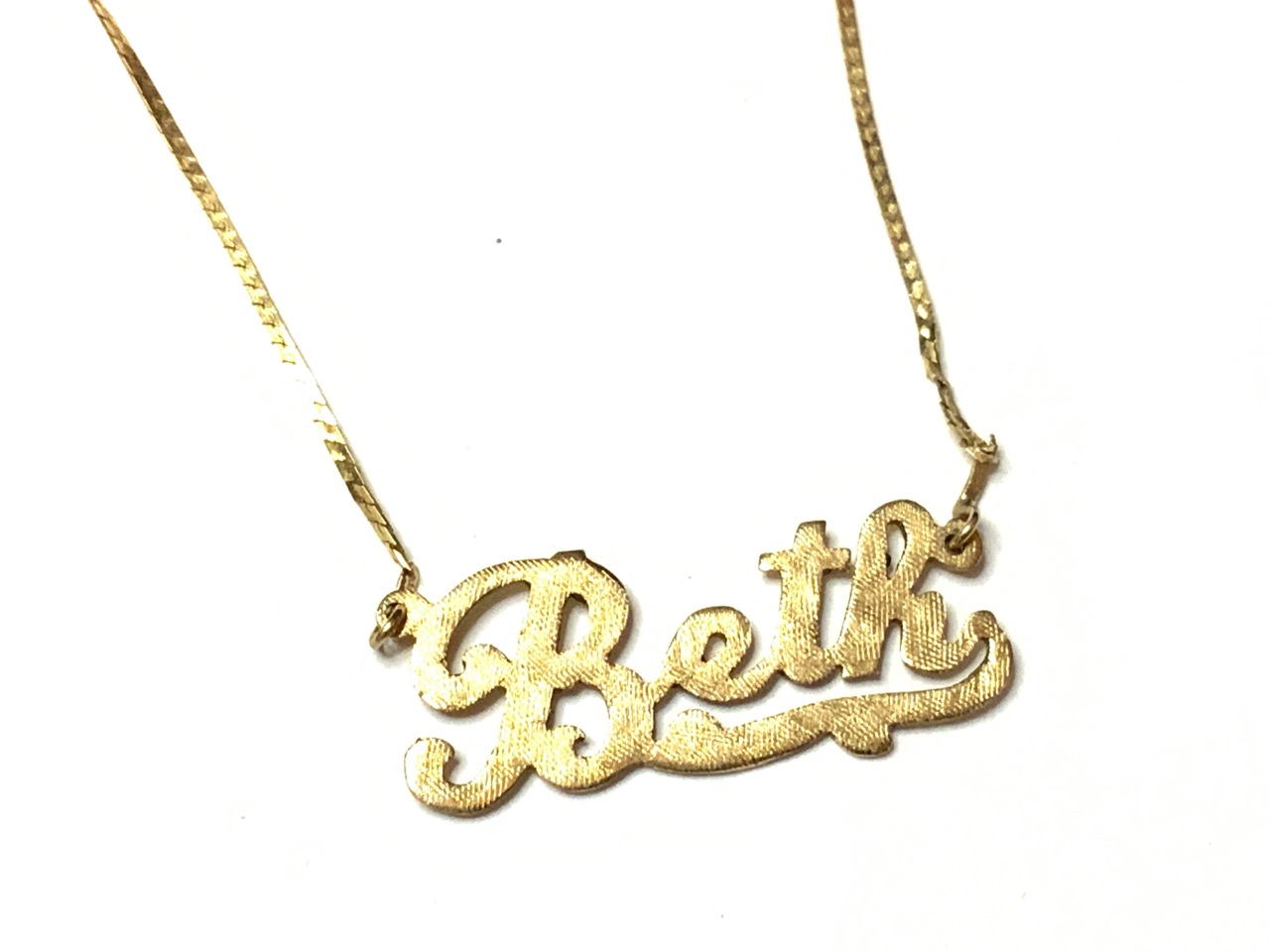14k yellow gold "Beth" nameplate necklace.