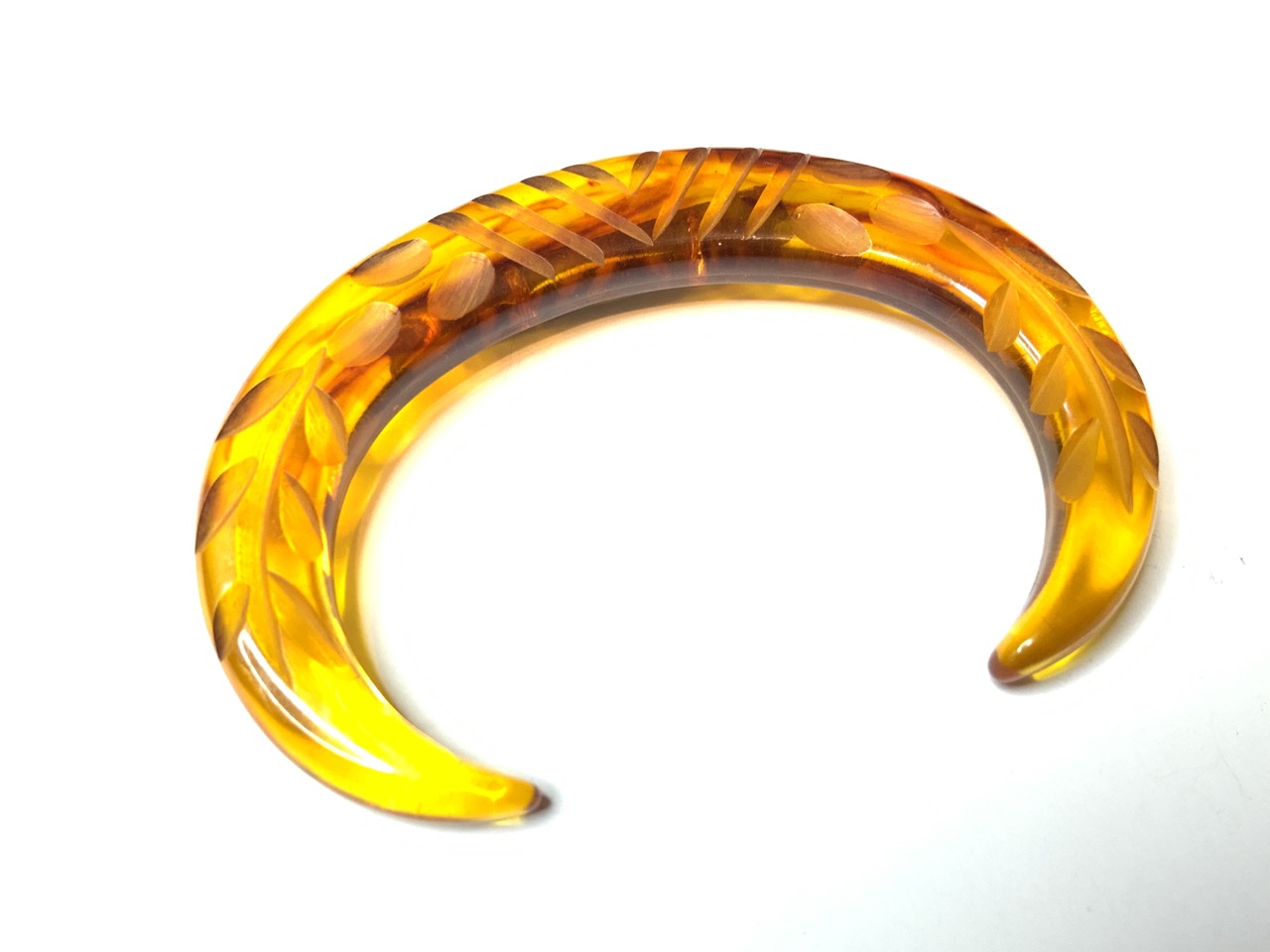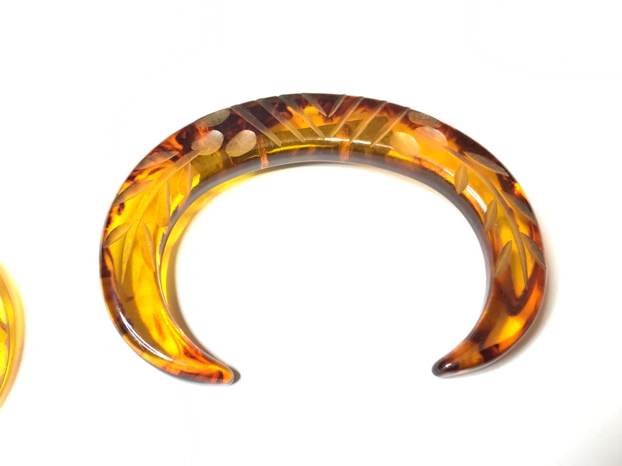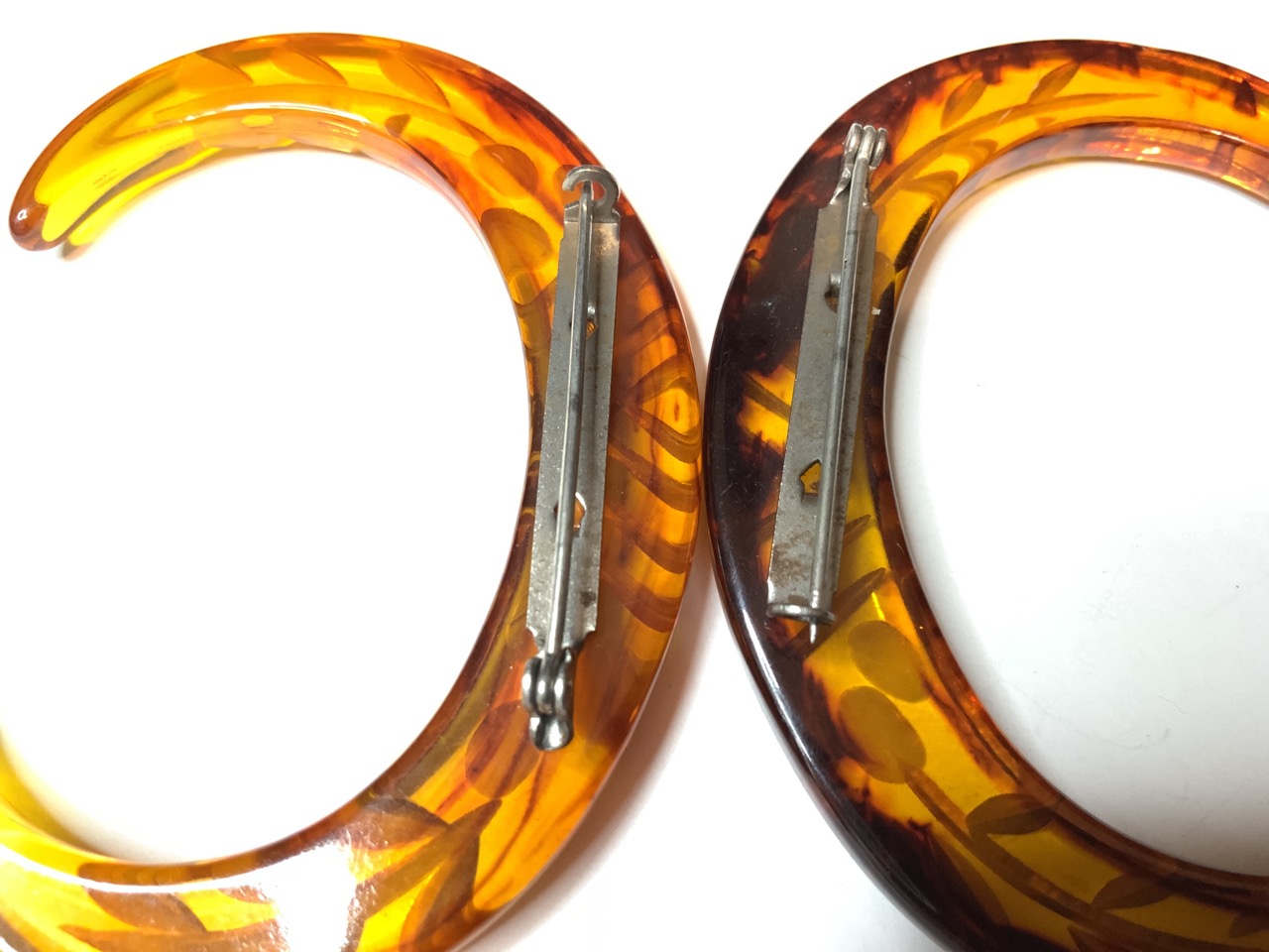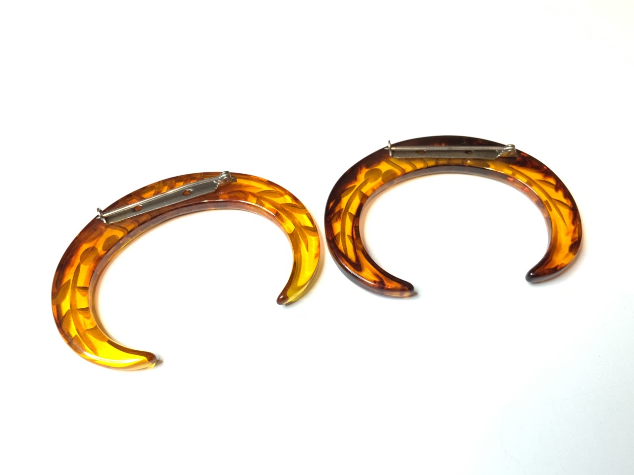 A matching pair of carved apple juice lucite pins.