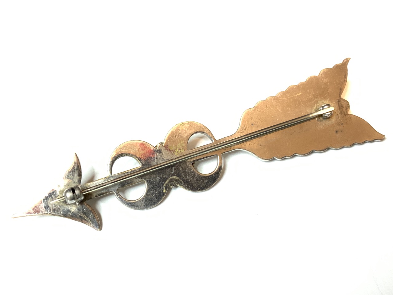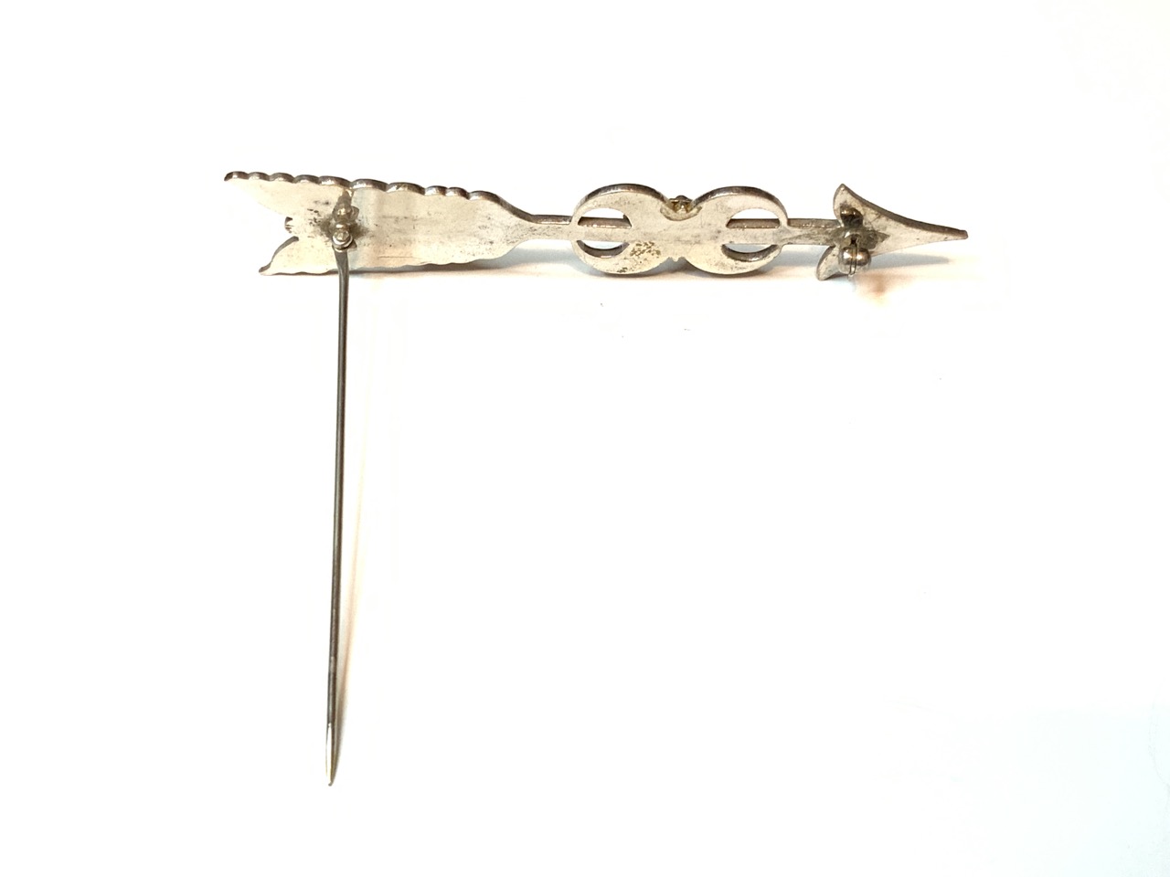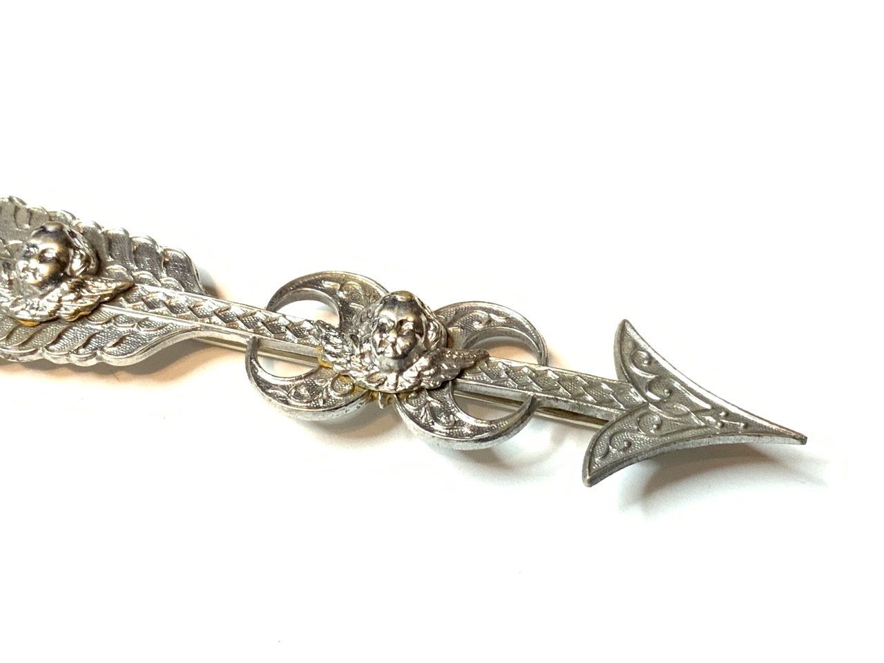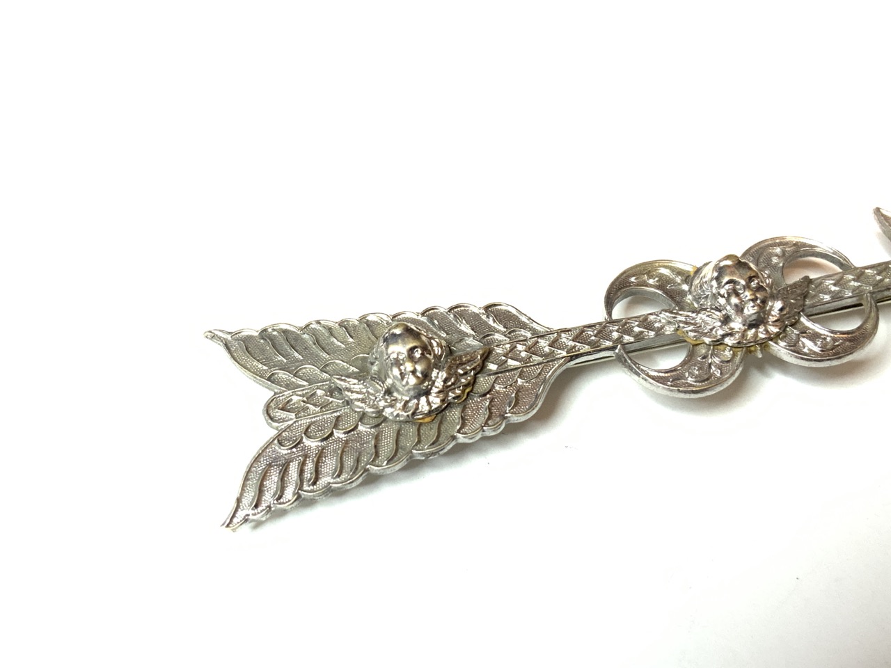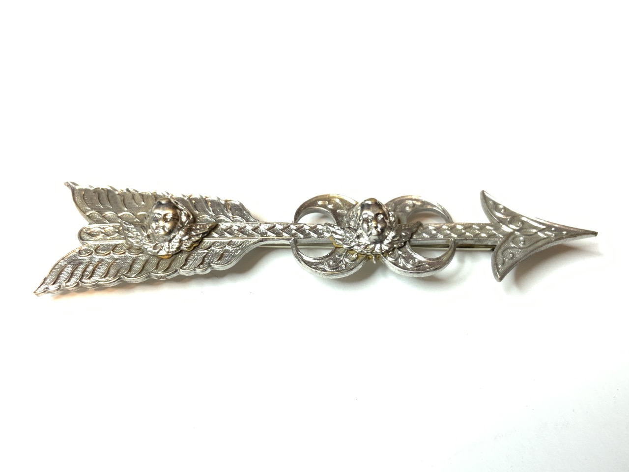 An antique 9ct. solid white gold arrow pin with two Angels (Cupid). Tested for purity.